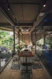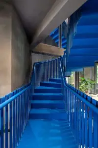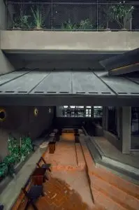 Cấu trúc được tái cấu trúc xung quanh ba yếu tố chính: sàn mở, khung nhẹ và hiên nghiêng – một sự tái hiện cục bộ hệ thống Dom-ino của Le Corbusier. Tại góc hướng ra sông, mái cong nhẹ nhàng gợi lên hình dáng của những ngôi nhà cộng đồng truyền thống, được làm dịu đi bởi lớp ốp mây, giúp làm dịu khung thép và tạo nên sự tương phản xúc giác. Cầu thang xoắn ốc màu xanh lam rực rỡ đóng vai trò là điểm neo điêu khắc của không gian, dẫn dắt chuyển động qua các chức năng phân tầng của quán cà phê, triển lãm và khu vực làm việc chung.