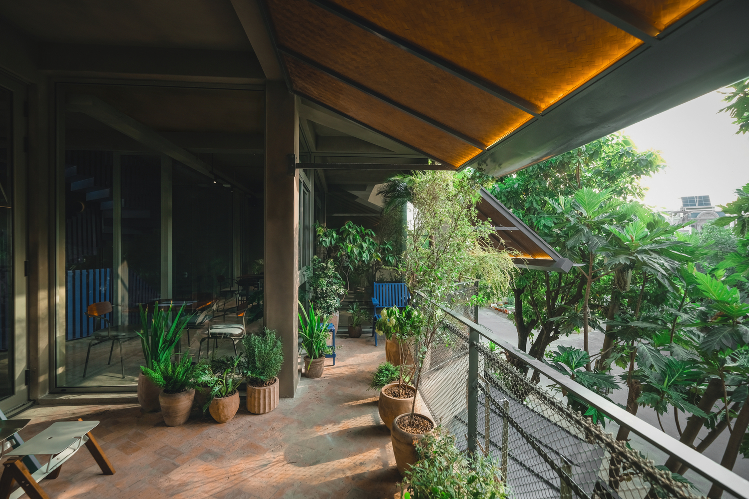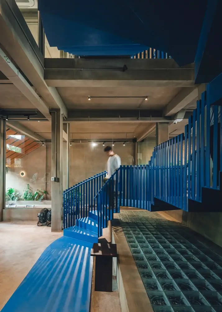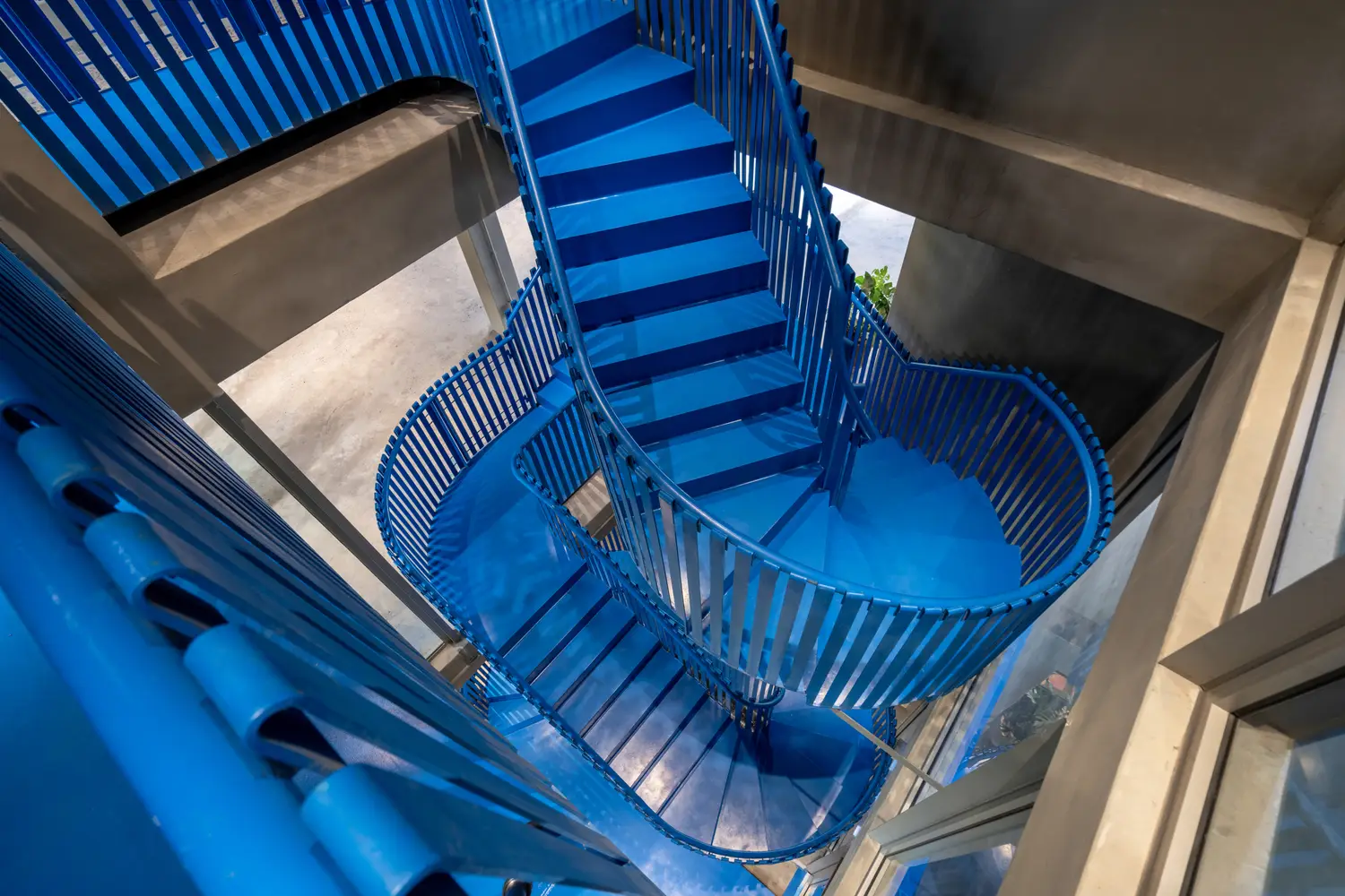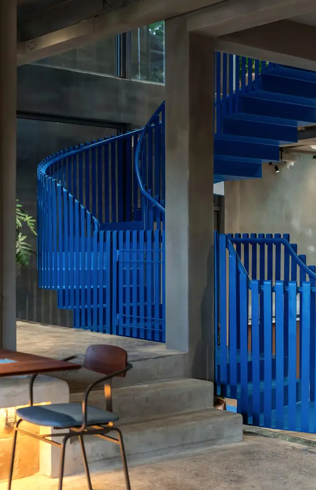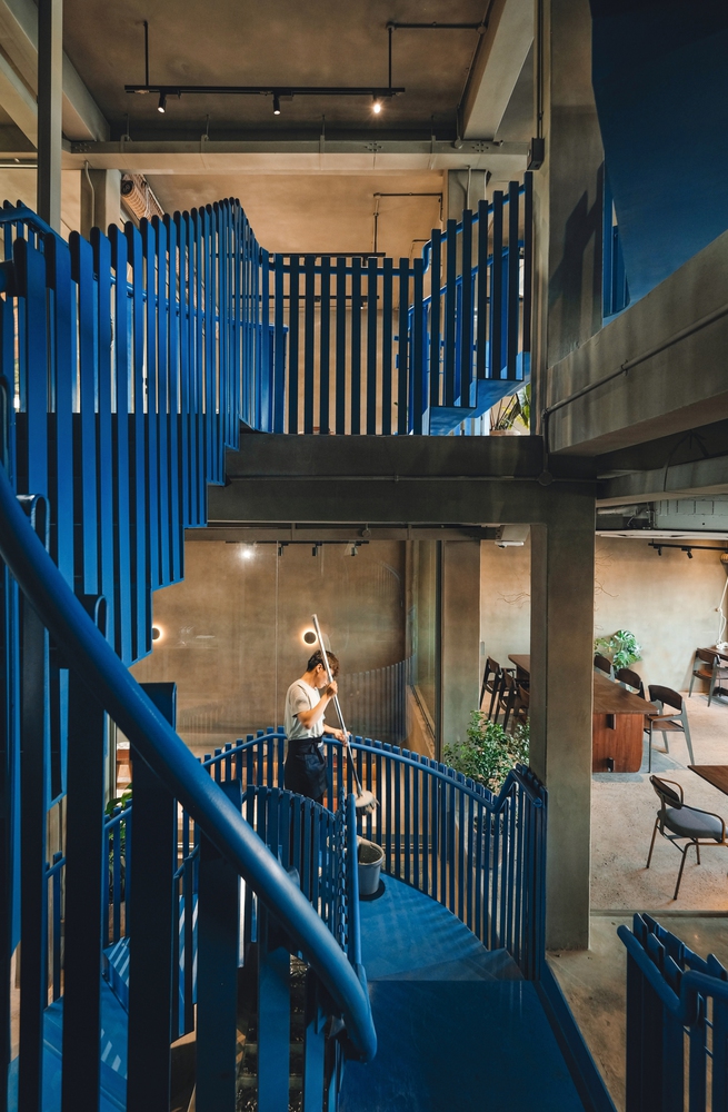 Cấu trúc được tái cấu trúc xung quanh ba yếu tố chính: sàn mở, khung nhẹ và hiên nghiêng – một sự tái hiện cục bộ hệ thống Dom-ino của Le Corbusier. Tại góc hướng ra sông, mái cong nhẹ nhàng gợi lên hình dáng của những ngôi nhà cộng đồng truyền thống, được làm dịu đi bởi lớp ốp mây, giúp làm dịu khung thép và tạo nên sự tương phản xúc giác. Cầu thang xoắn ốc màu xanh lam rực rỡ đóng vai trò là điểm neo điêu khắc của không gian, dẫn dắt chuyển động qua các chức năng phân tầng của quán cà phê, triển lãm và khu vực làm việc chung.