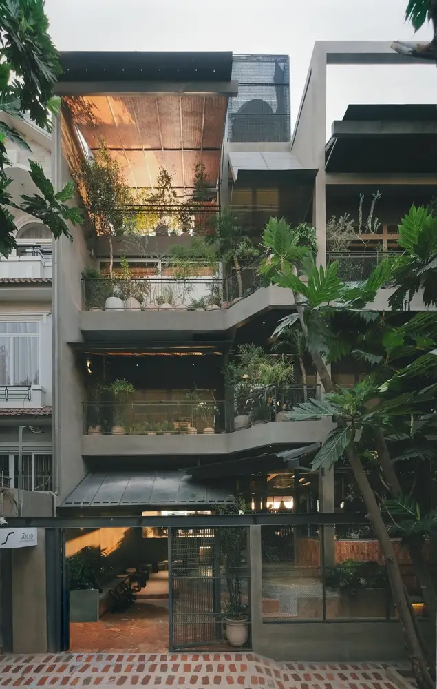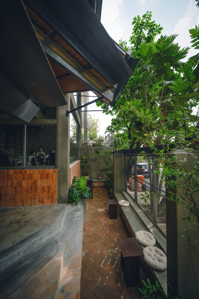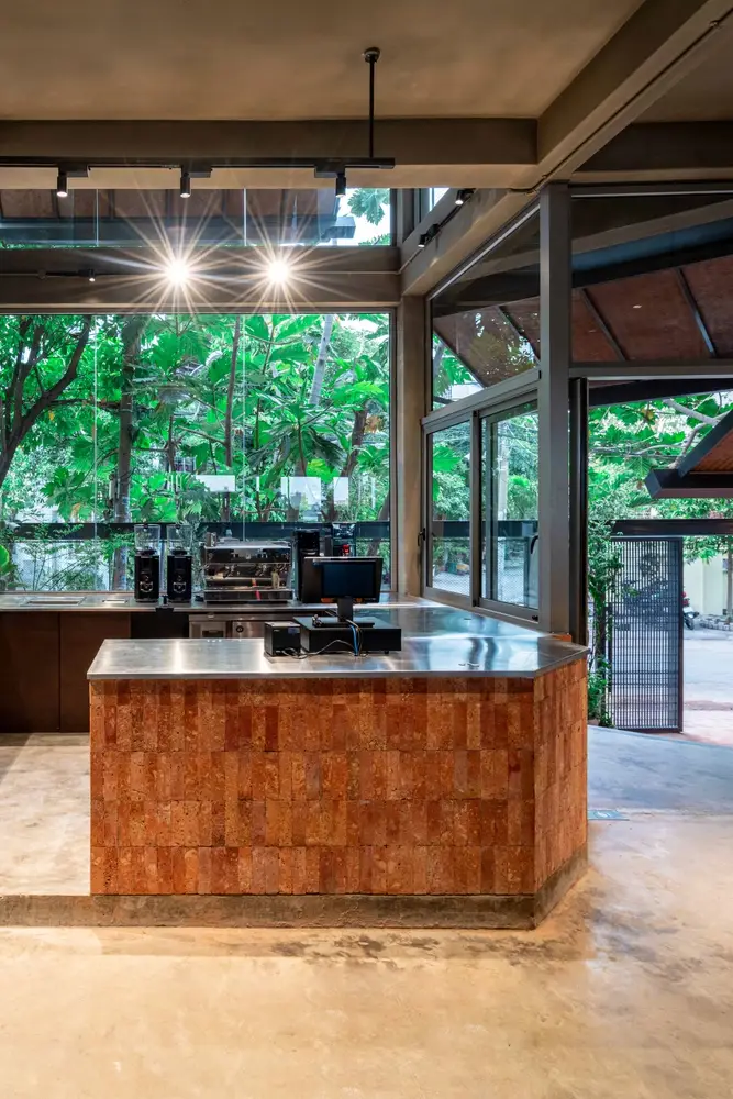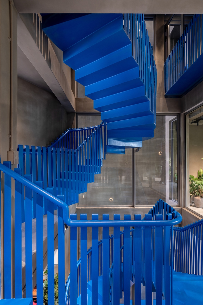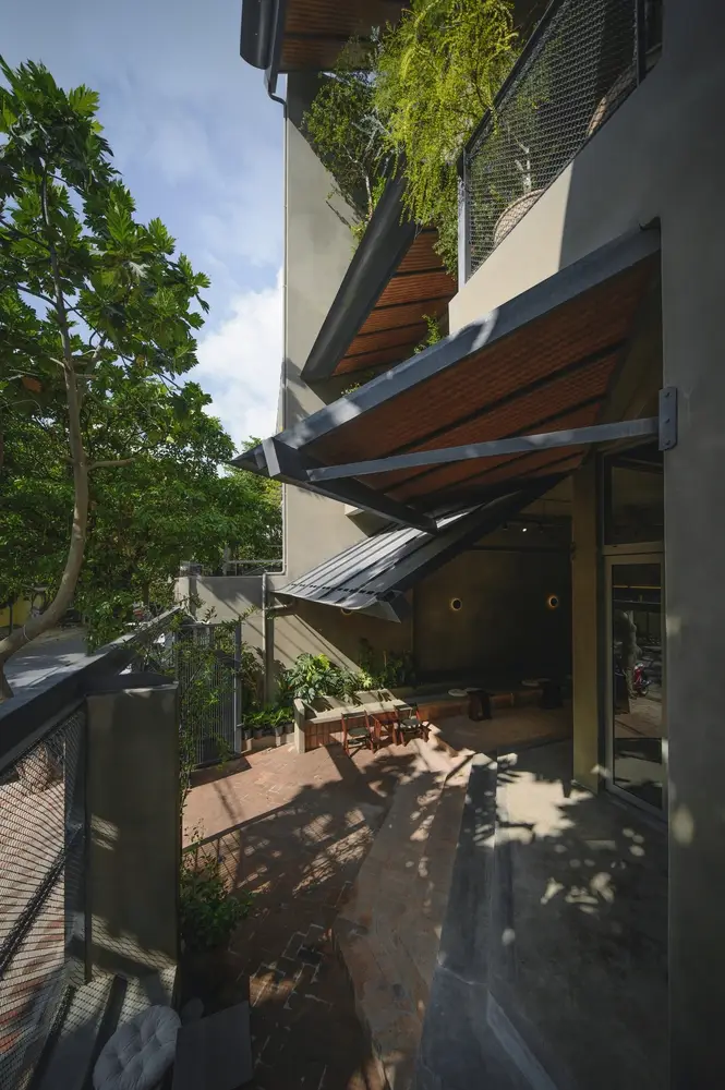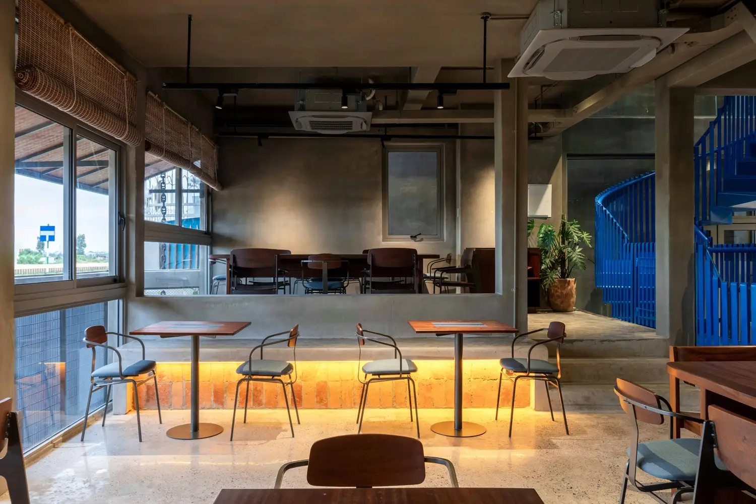 Cấu trúc được tái cấu trúc xung quanh ba yếu tố chính: sàn mở, khung nhẹ và hiên nghiêng – một sự tái hiện cục bộ hệ thống Dom-ino của Le Corbusier. Tại góc hướng ra sông, mái cong nhẹ nhàng gợi lên hình dáng của những ngôi nhà cộng đồng truyền thống, được làm dịu đi bởi lớp ốp mây, giúp làm dịu khung thép và tạo nên sự tương phản xúc giác. Cầu thang xoắn ốc màu xanh lam rực rỡ đóng vai trò là điểm neo điêu khắc của không gian, dẫn dắt chuyển động qua các chức năng phân tầng của quán cà phê, triển lãm và khu vực làm việc chung.