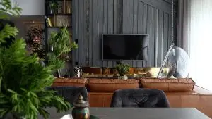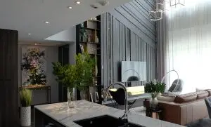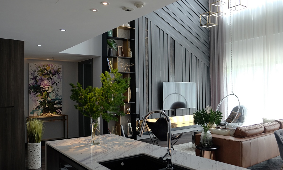 Tông màu tối và “độc” của căn hộ gần đây nhất do APS Concept hoàn thành chính là điểm nhận diện không gian nội thất mang phong cách Industrial. Đặc trưng của phong cách này là những vách tường giả bê tông thô sơ, rất dễ xử lý khi cần sửa chữa. Xen lẫn vào đó là các chi tiết décor nội thất inox, gỗ, da bò, đá…không những mang lại sự ấm cúng trong căn hộ mà còn thể hiện sự sang trọng đẳng cấp.