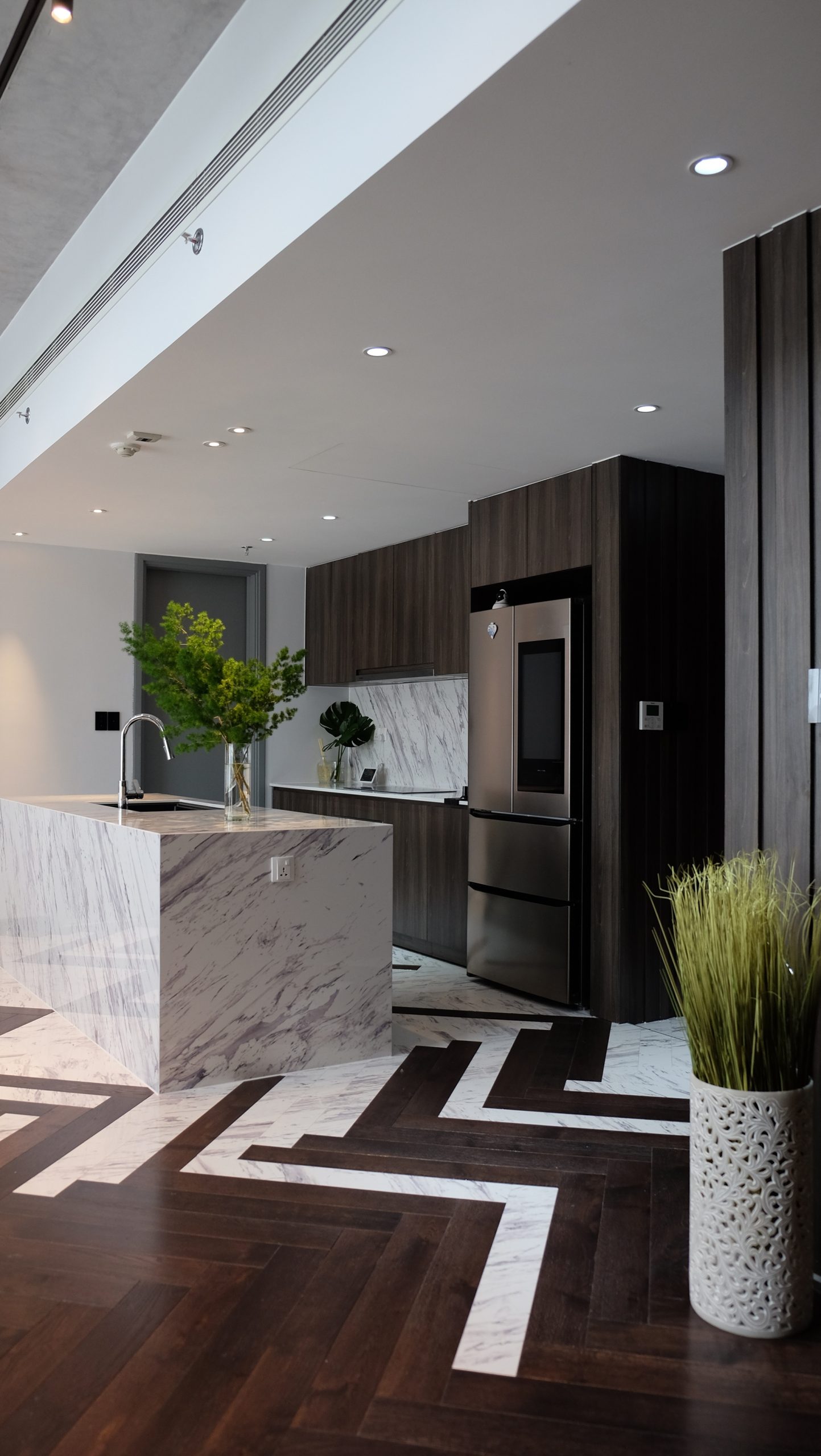 Sảnh chính được xử lý khéo léo bằng vật liệu đá trắng vân mây kết hợp sàn gỗ, đường nét sắc xảo và kỹ thuật lắp đặt rất thẩm mỹ.