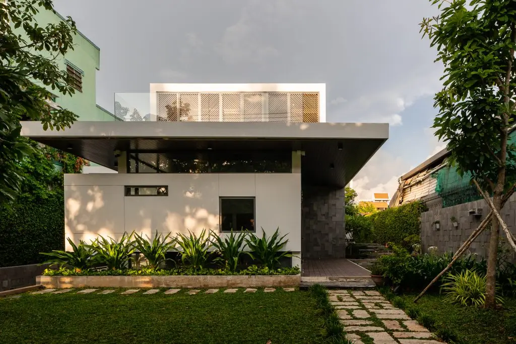 Các vị trí phòng khách, bếp nấu và bàn ăn được bố trí liên thông với không gian thông tầng đầy mạnh mẽ bằng điểm nhấn là mảng gỗ lớn. Không gian sinh hoạt chung nhìn ra hướng sân vườn thoáng mát rộng rãi như một ngôi biệt thự, mà quyến rũ nhất là dàn hoa hồng leo đầy sức sống.