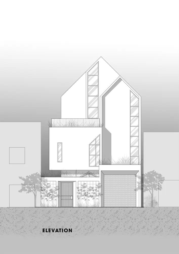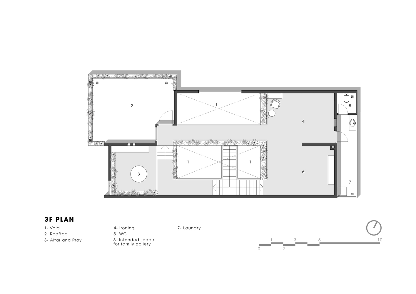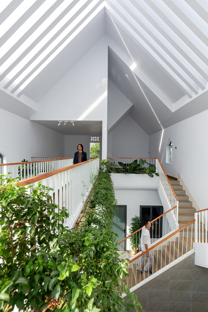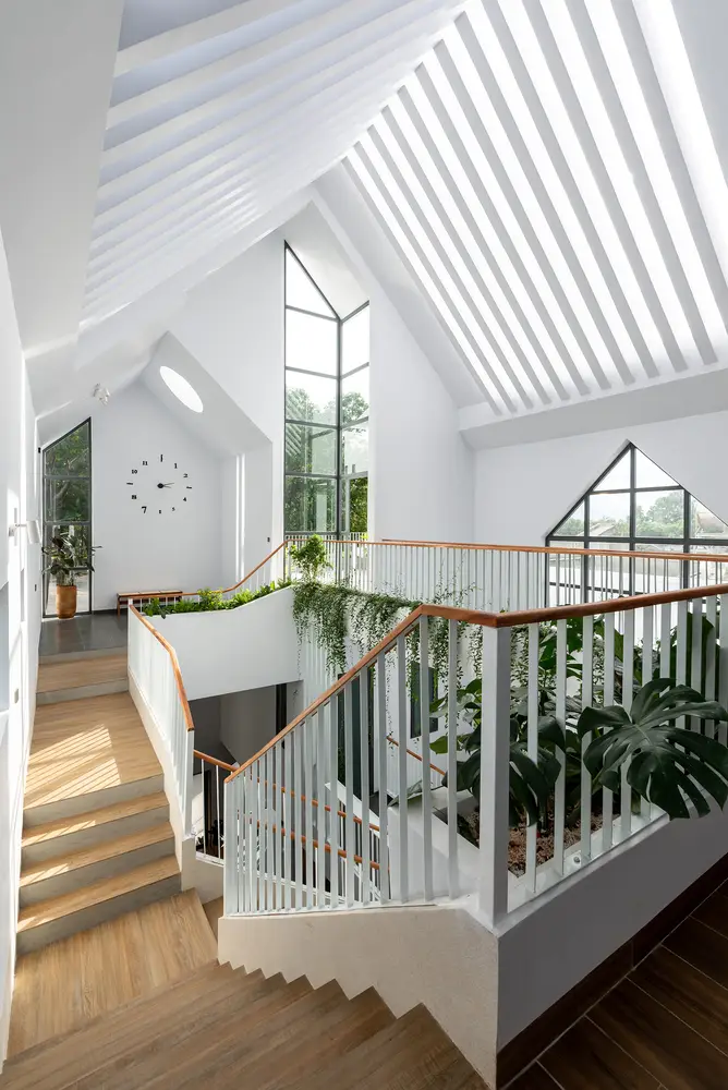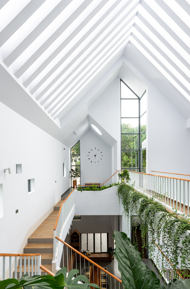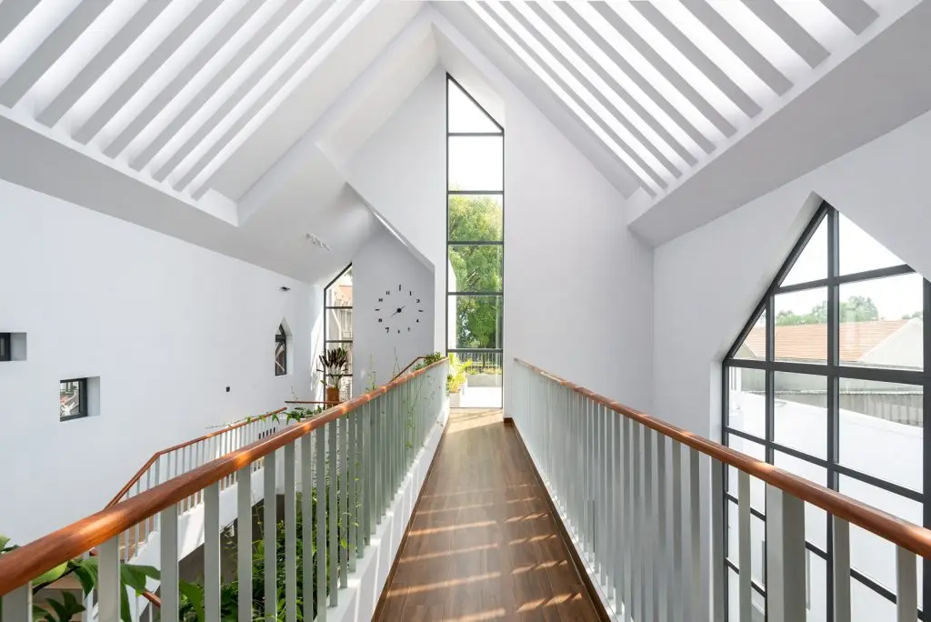 Phía sau là không gian dự kiến được phát triển thành phòng trưng bày kỷ vật gia đình và khu vực phơi đồ. Phần mái ở giữa nhà được làm bằng các thanh bê tông kết hợp với mái kính để đón ánh sáng tự nhiên, mang đậm tinh thần gia đình Công giáo. Khi Chúa tạo dựng thế giới này, Ngài đã tạo ra ánh sáng. Vì vậy, ánh sáng tự nhiên rất quan trọng, việc bố trí nhiều ô cửa ở các vị trí khác nhau kết hợp với mái kính ở giữa nhà tạo ra nhiều tia sáng xen kẽ trên tường, làm cho không gian trở nên thú vị. Các cửa sổ mái và mặt tiền có thiết kế hình chóp để phù hợp với hình dạng của nhà thờ gần đó, tạo nên một tổng thể hài hòa ở bên ngoài, trong khi nội thất được thiết kế đơn giản và trực quan. Sử dụng ánh sáng tự nhiên làm điểm nhấn, ánh sáng sẽ thay đổi mỗi giờ để chúng ta không cảm thấy nhàm chán.