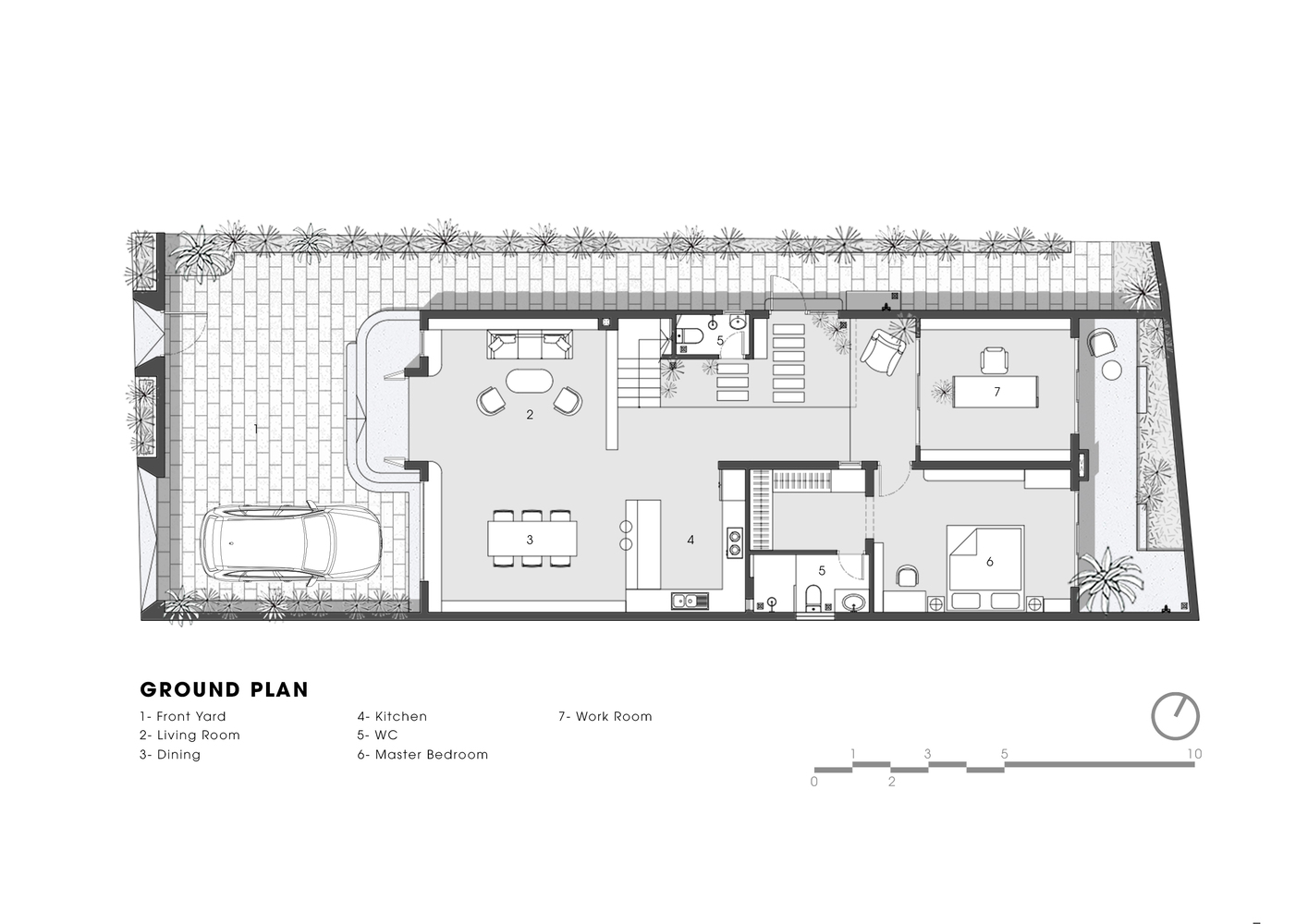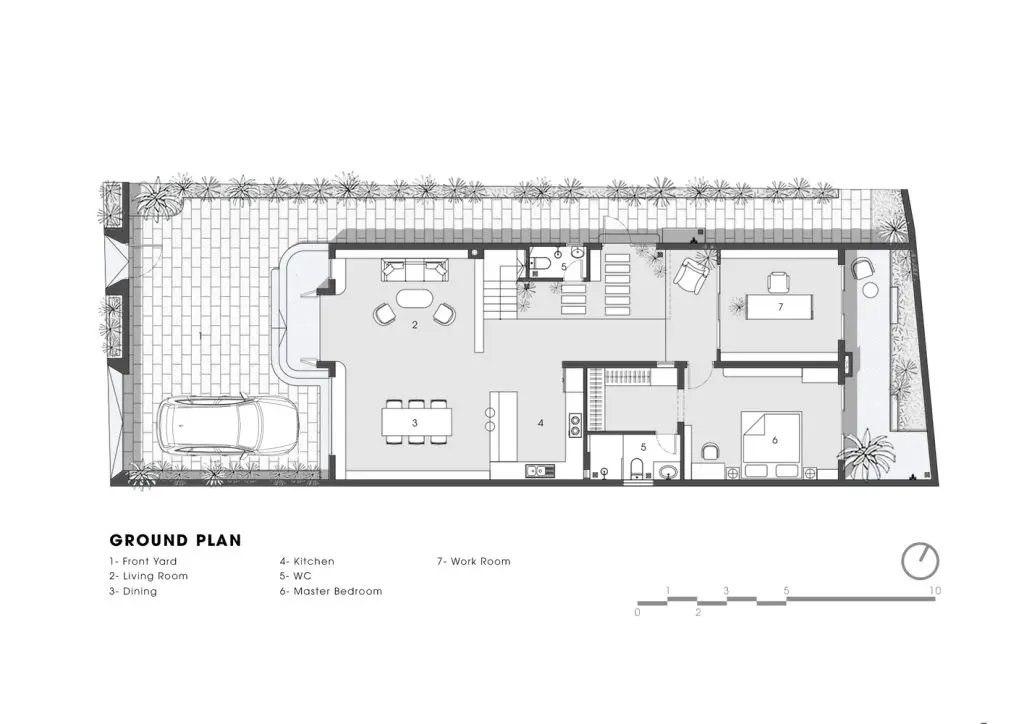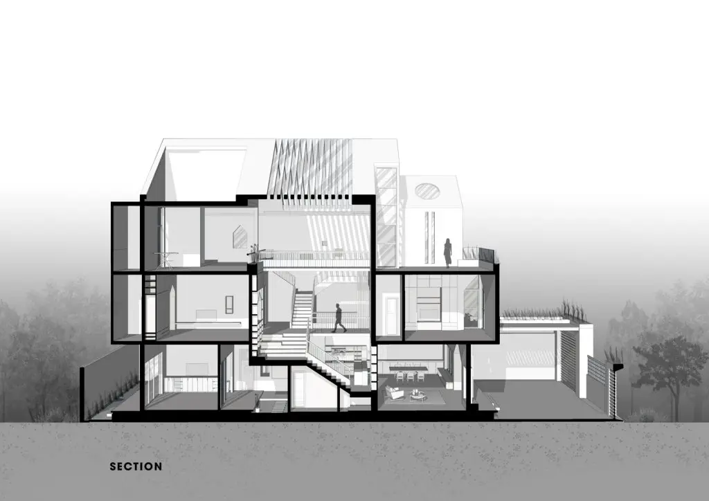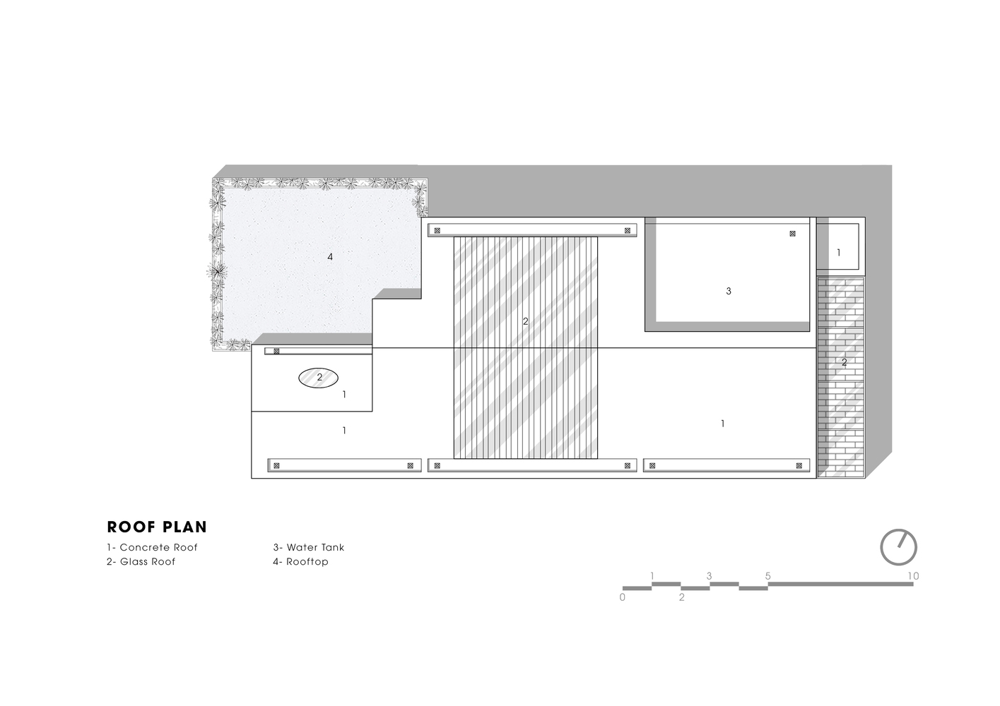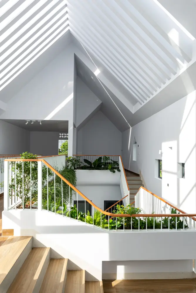 Phía sau là không gian dự kiến được phát triển thành phòng trưng bày kỷ vật gia đình và khu vực phơi đồ. Phần mái ở giữa nhà được làm bằng các thanh bê tông kết hợp với mái kính để đón ánh sáng tự nhiên, mang đậm tinh thần gia đình Công giáo. Khi Chúa tạo dựng thế giới này, Ngài đã tạo ra ánh sáng. Vì vậy, ánh sáng tự nhiên rất quan trọng, việc bố trí nhiều ô cửa ở các vị trí khác nhau kết hợp với mái kính ở giữa nhà tạo ra nhiều tia sáng xen kẽ trên tường, làm cho không gian trở nên thú vị. Các cửa sổ mái và mặt tiền có thiết kế hình chóp để phù hợp với hình dạng của nhà thờ gần đó, tạo nên một tổng thể hài hòa ở bên ngoài, trong khi nội thất được thiết kế đơn giản và trực quan. Sử dụng ánh sáng tự nhiên làm điểm nhấn, ánh sáng sẽ thay đổi mỗi giờ để chúng ta không cảm thấy nhàm chán.