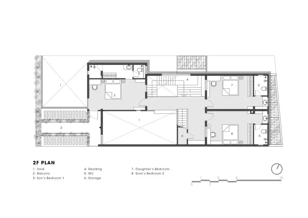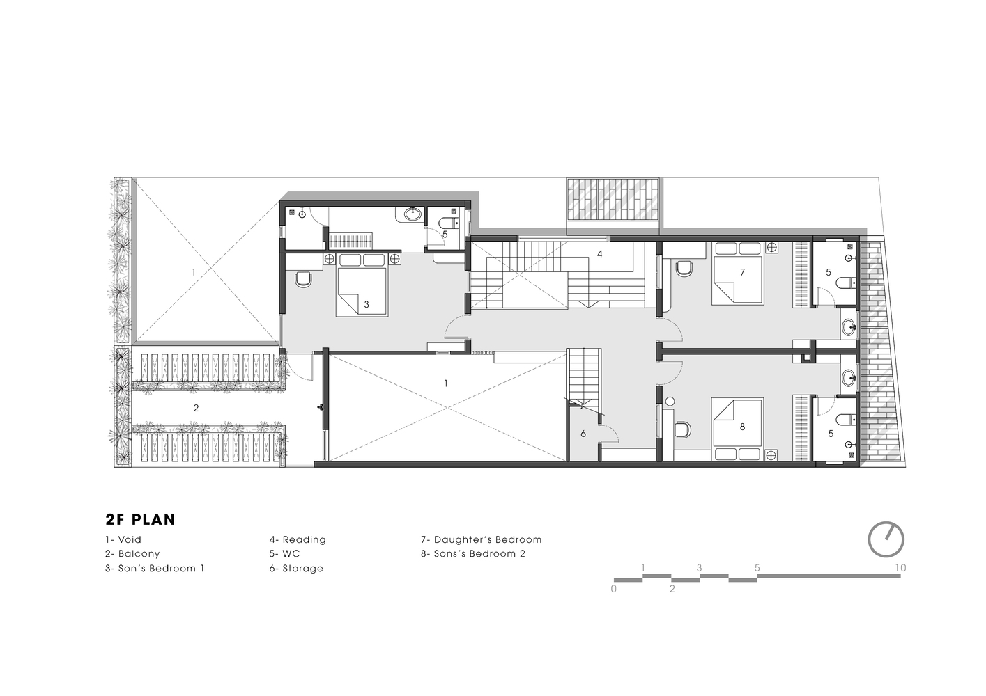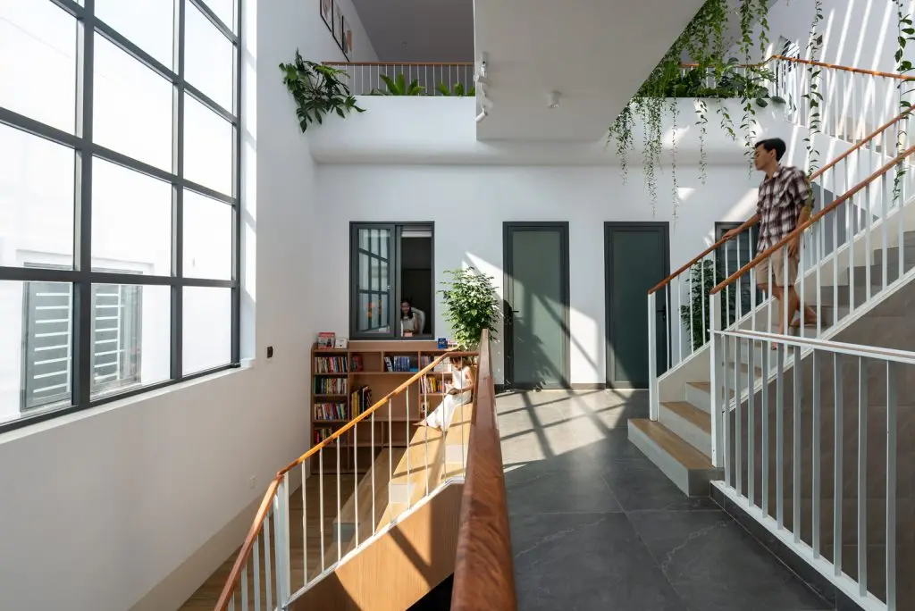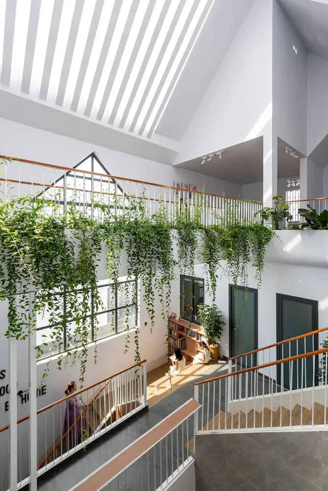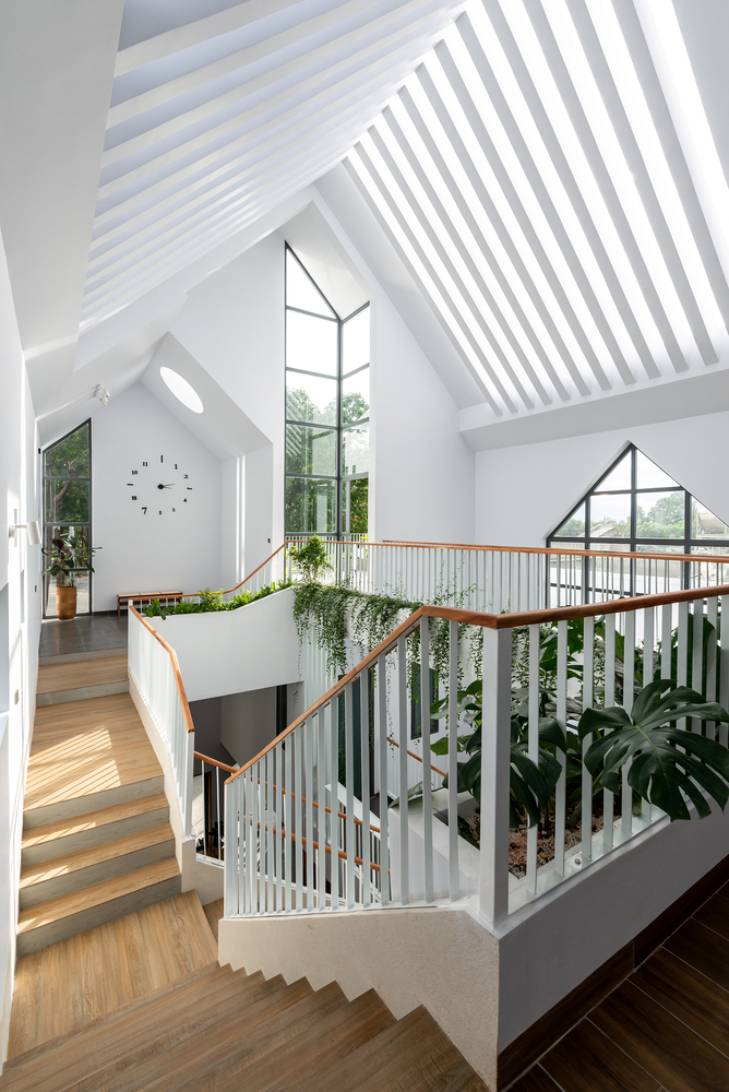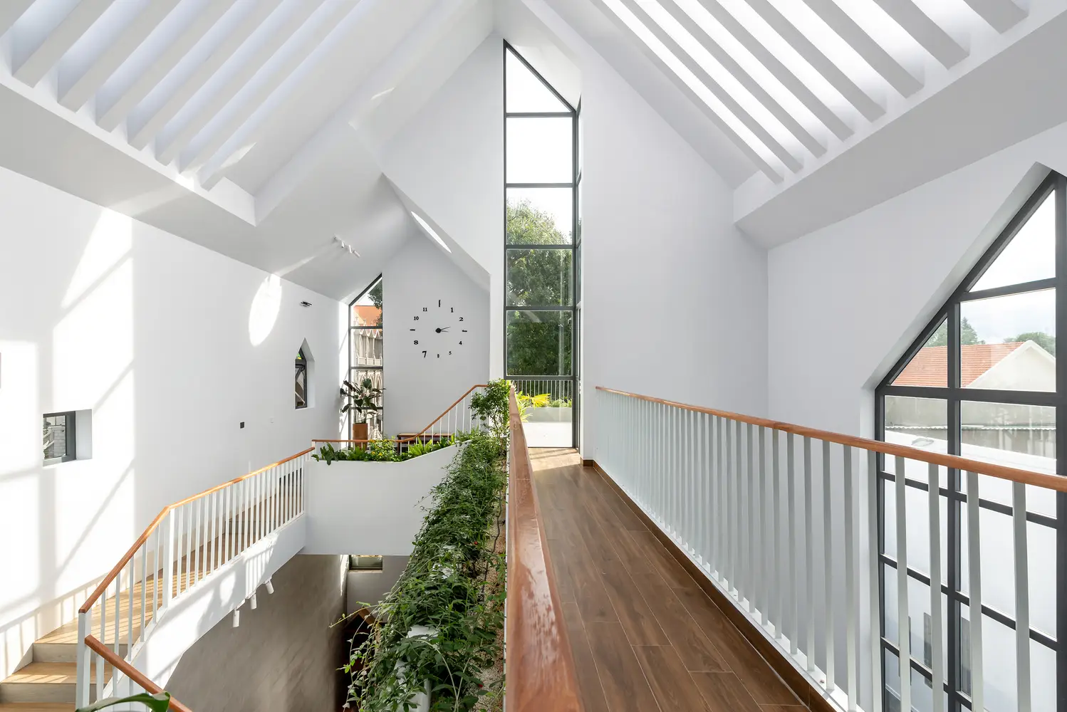 Tầng 2 là không gian dành cho trẻ em, bao gồm 3 phòng ngủ, các phòng ngủ này hướng ra sảnh và hành lang chung, một khu vực nơi trẻ em có thể giao lưu và kết nối thường xuyên. Không gian chiếu nghỉ cầu thang được thiết kế rộng rãi để có thể kết hợp làm khu vực đọc sách, hành lang rộng cũng tích hợp một quầy bar để mọi người thư giãn. Từ sảnh, hành lang và cầu thang của tầng 2 và tầng 3, bạn có thể quan sát và kết nối khu vực bếp và phòng khách nhờ giếng trời, để trẻ em có thể xem mẹ nấu ăn và cảm nhận hương vị của thức ăn. Khu vực phía trước tầng 3 là khu vực tĩnh tâm cầu nguyện của gia đình với cửa sổ nhìn ra nhà thờ và sân thượng có cây xanh để thư giãn.