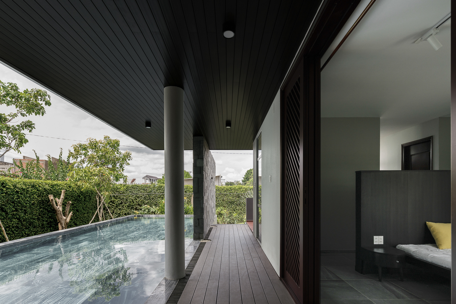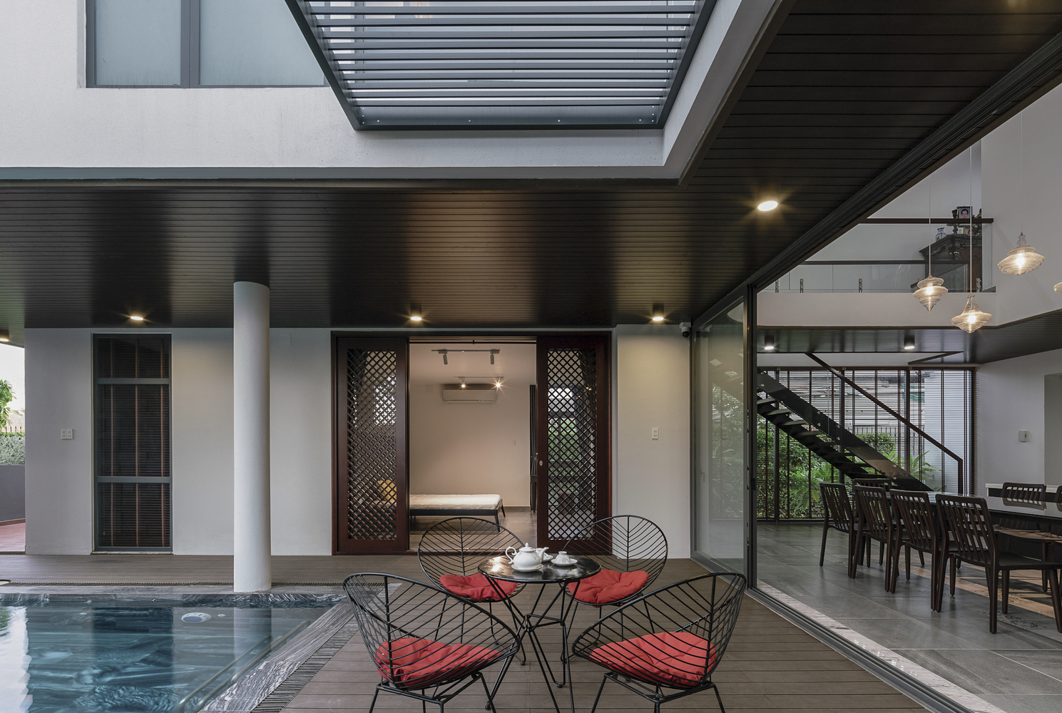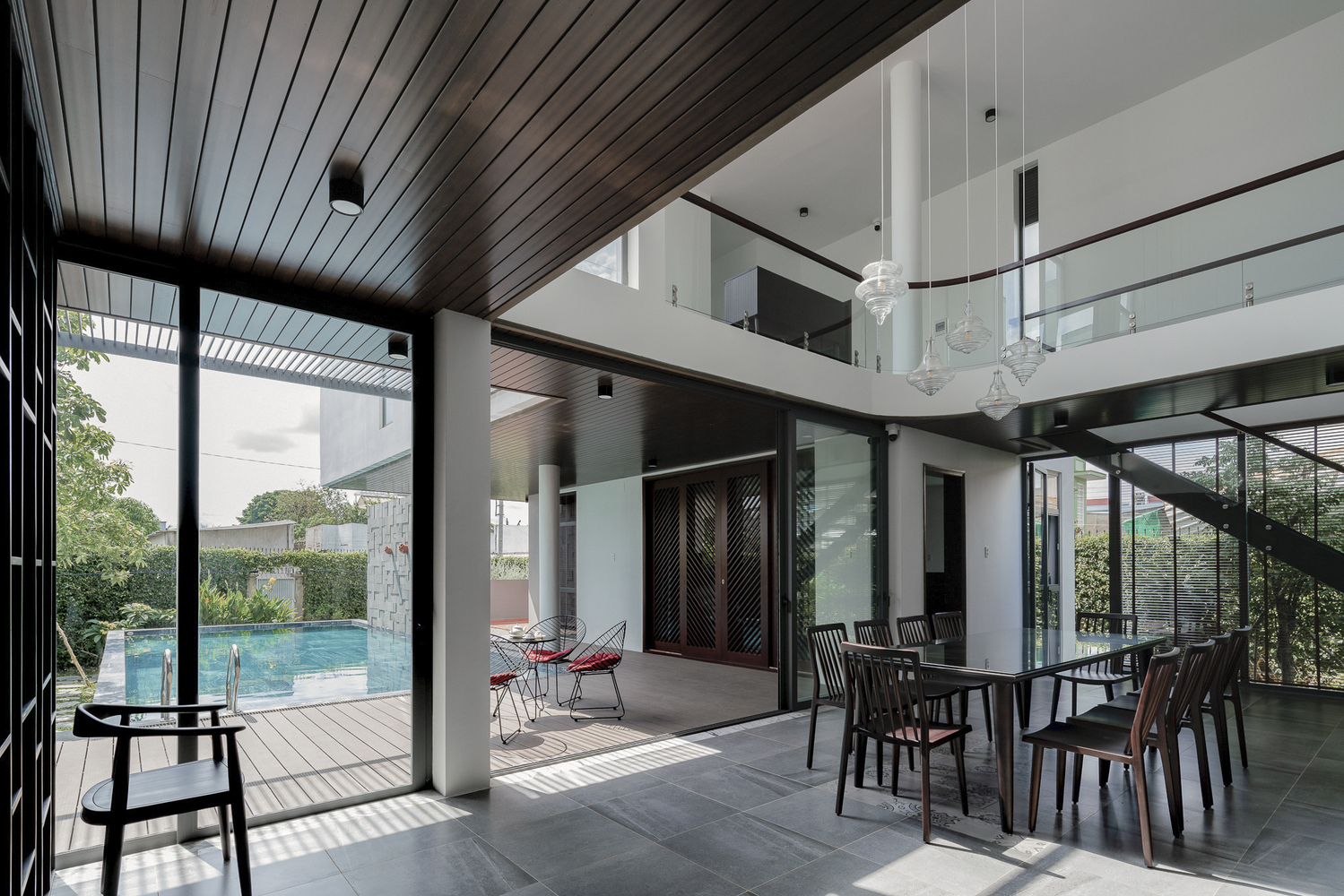 Các thành viên trong gia đình thường quây quần bên nhau để giải trí. Vì vậy, nhà bếp, phòng ăn và phòng sinh hoạt chung được thiết kế kết nối với bể bơi, giúp các thành viên gắn kết với nhau hơn. Vật liệu được sử dụng được tối giản một cách có chủ ý để định nghĩa yếu tố kiến ​​trúc chỉ như một phông nền cho mọi hoạt động của con người và tạo ra một bầu không khí yên tĩnh. Cuối cùng, với công trình này, chúng tôi muốn thể hiện quan điểm của mình về tư duy không gian phù hợp với bối cảnh địa phương.