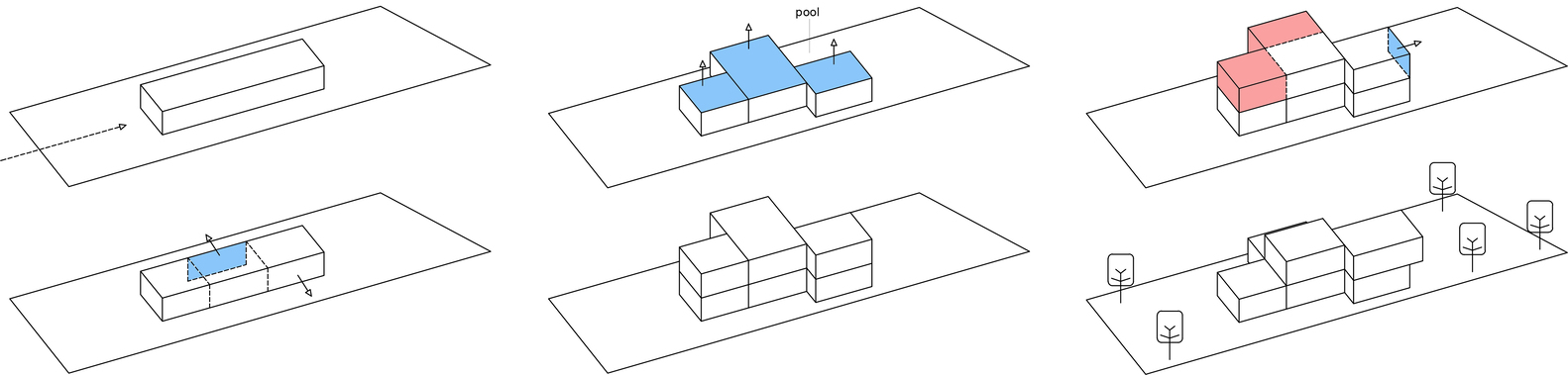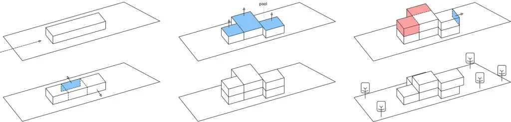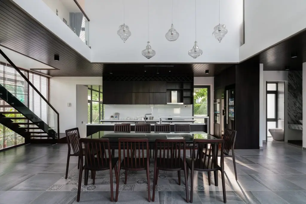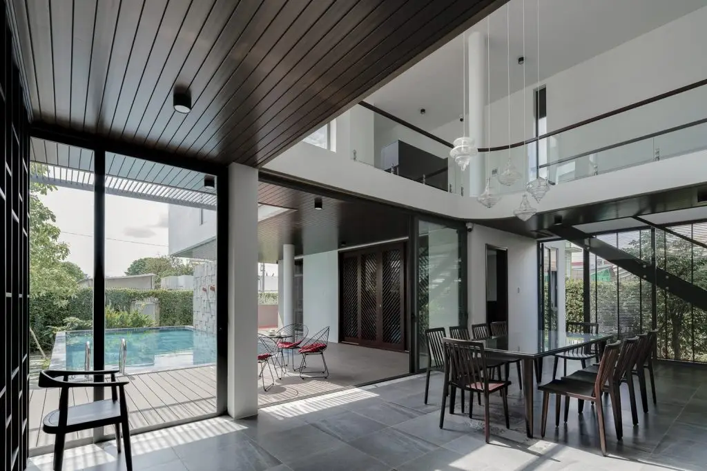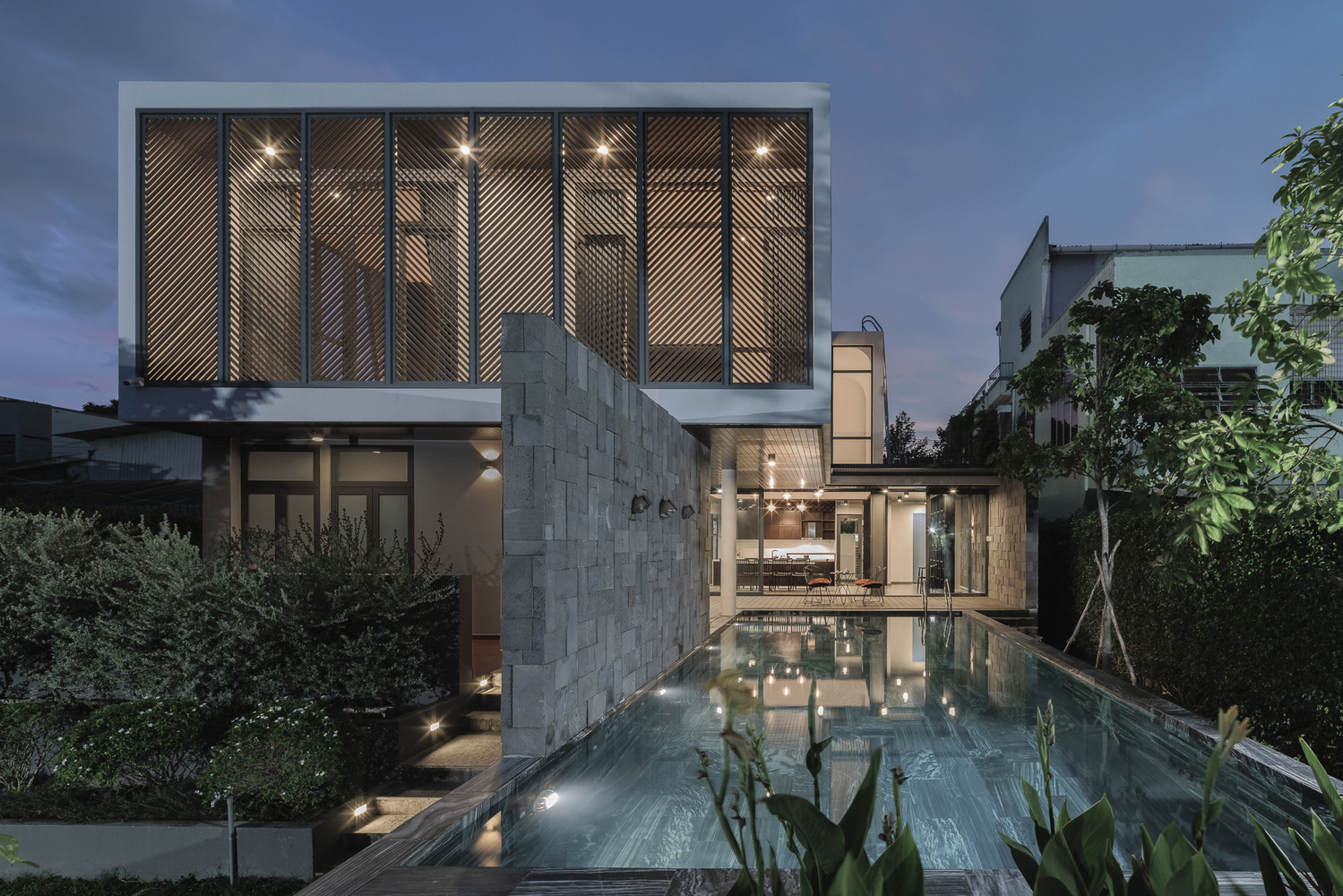 Các thành viên trong gia đình thường quây quần bên nhau để giải trí. Vì vậy, nhà bếp, phòng ăn và phòng sinh hoạt chung được thiết kế kết nối với bể bơi, giúp các thành viên gắn kết với nhau hơn. Vật liệu được sử dụng được tối giản một cách có chủ ý để định nghĩa yếu tố kiến ​​trúc chỉ như một phông nền cho mọi hoạt động của con người và tạo ra một bầu không khí yên tĩnh. Cuối cùng, với công trình này, chúng tôi muốn thể hiện quan điểm của mình về tư duy không gian phù hợp với bối cảnh địa phương.