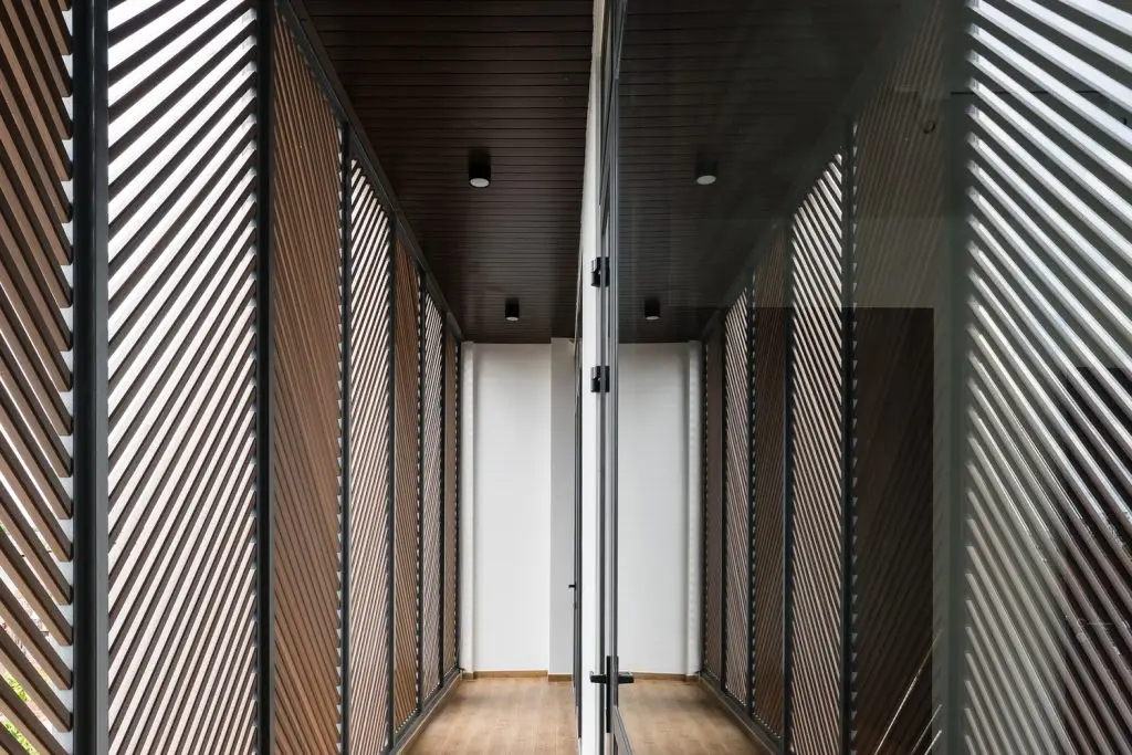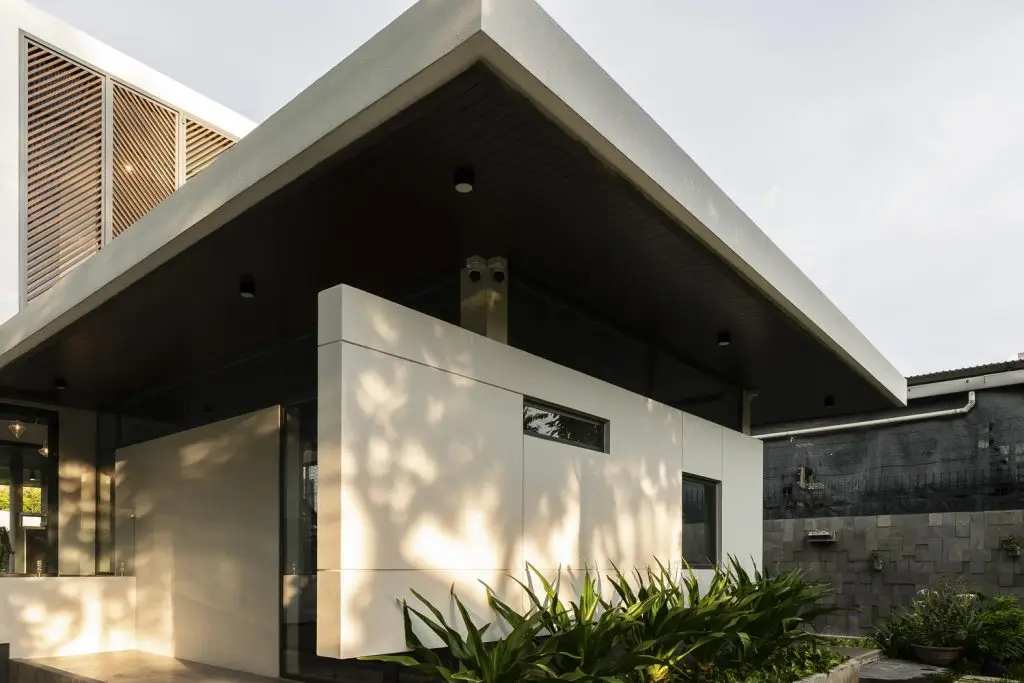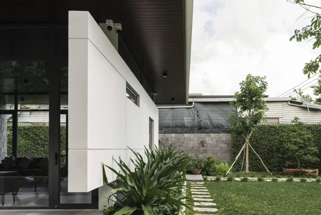 Ẩn sau hàng rào bê tông đơn giản, qua khu vườn rộng lớn hài hòa phía trước, mặt tiền của tòa nhà dần trải dài dưới bóng cây, tạo nên vẻ ngoài khiêm tốn cho kiến ​​trúc biệt thự. Việc sử dụng mái hiên rộng và cửa thông gió bằng gỗ giúp hạn chế ánh nắng mặt trời, trong khi vẫn cho phép mở cửa kính từ bên trong, tối đa hóa sự tương tác giữa không gian nội thất và ngoại thất của ngôi nhà.