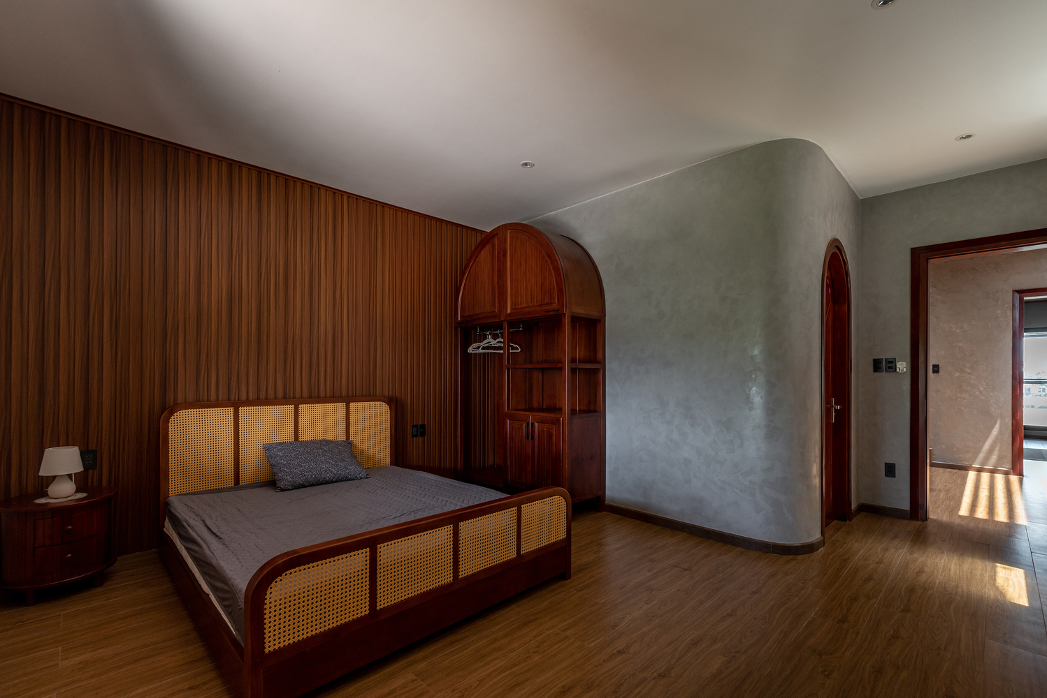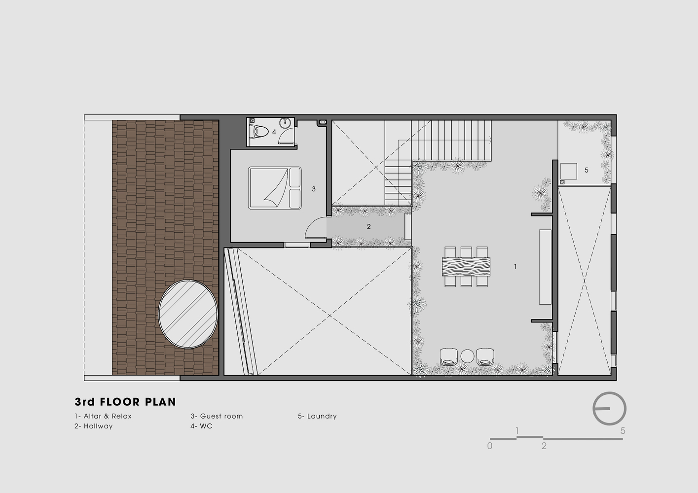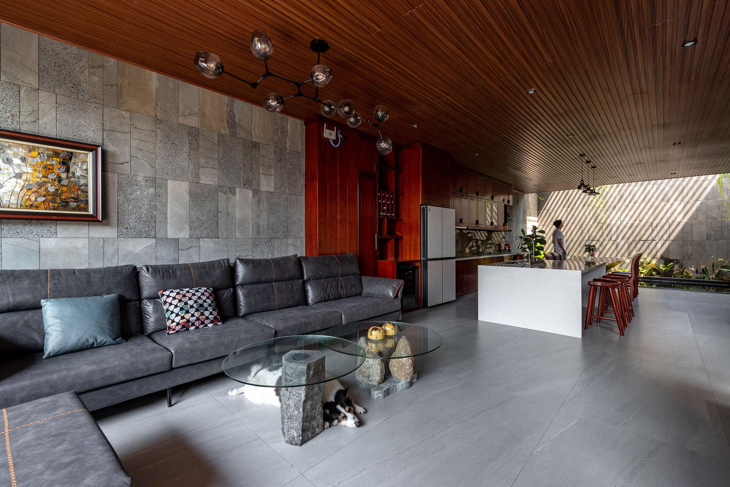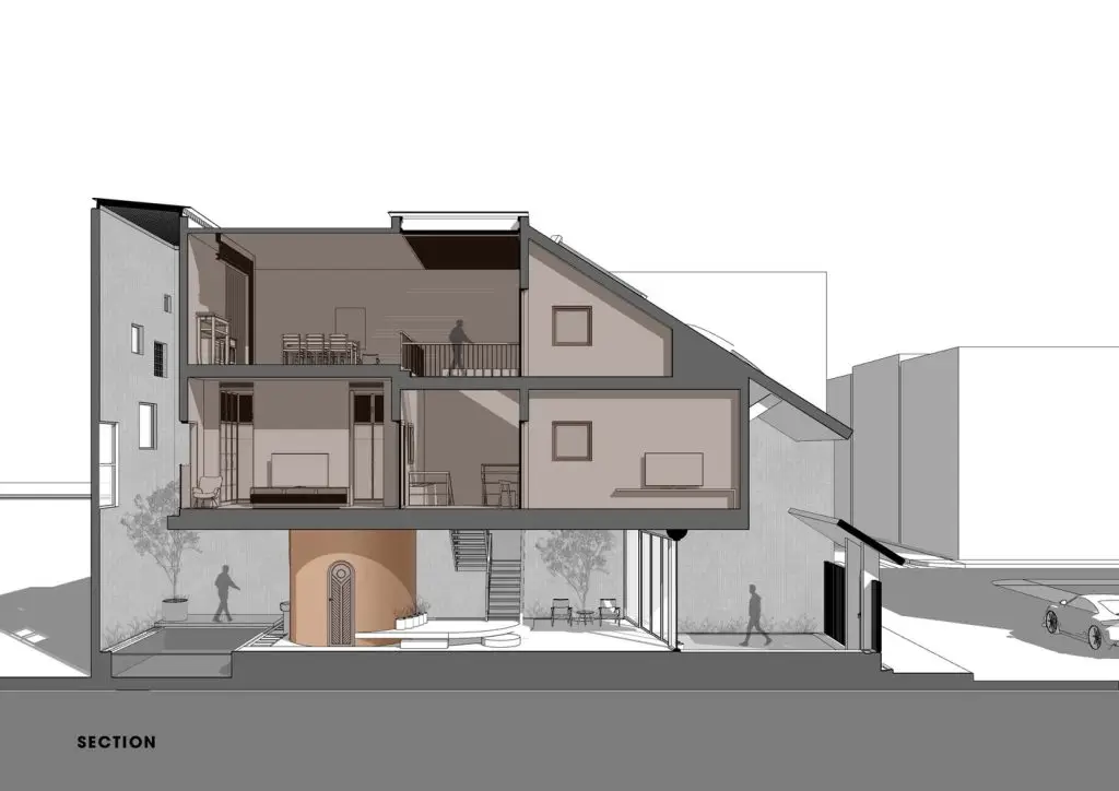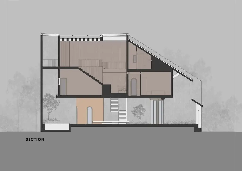 Dự án này phát triển ý tưởng giảm bớt căng thẳng đô thị và kết nối nhiều hơn với thiên nhiên, bắt đầu từ việc giải phóng hệ thống kết cấu cột thẳng và dầm vuông. Thay vào đó, hình dạng hữu hình là một khối đá terrazzo hình trụ tròn và một dầm gỗ tròn đặt chéo qua ngôi nhà, chịu tải trọng chính của toàn bộ ngôi nhà. Điều này tạo nên một cấu hình thú vị và gợi lại vẻ ngoài quen thuộc của những ngôi nhà gỗ Việt Nam xưa.