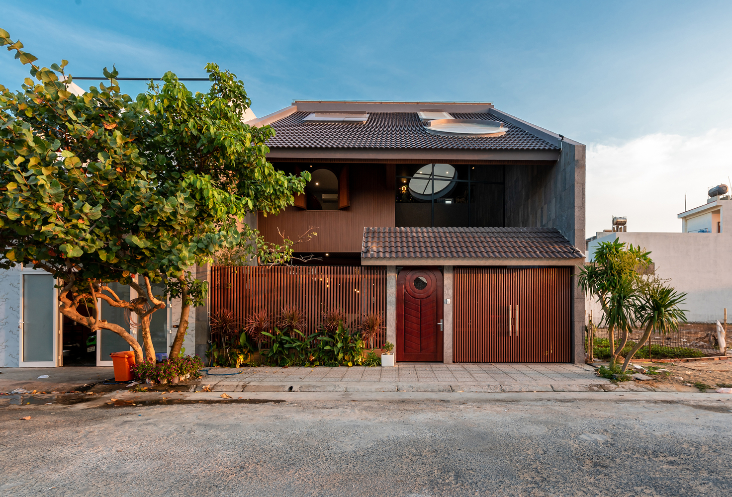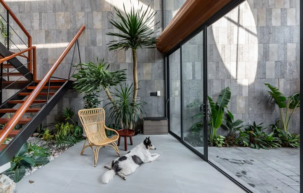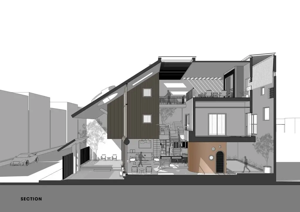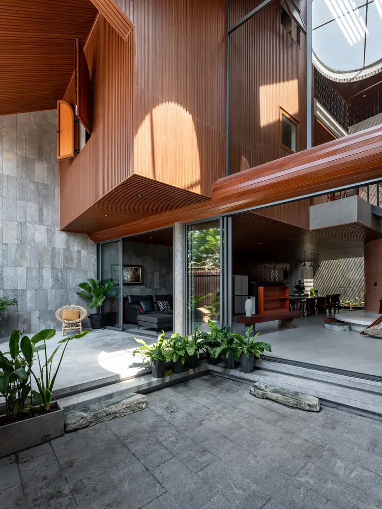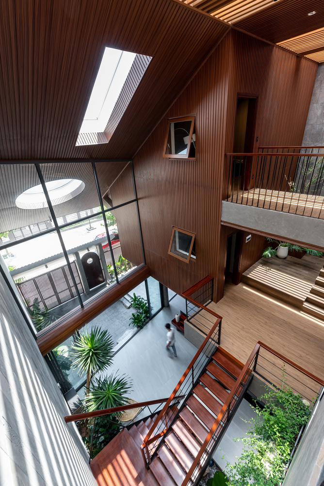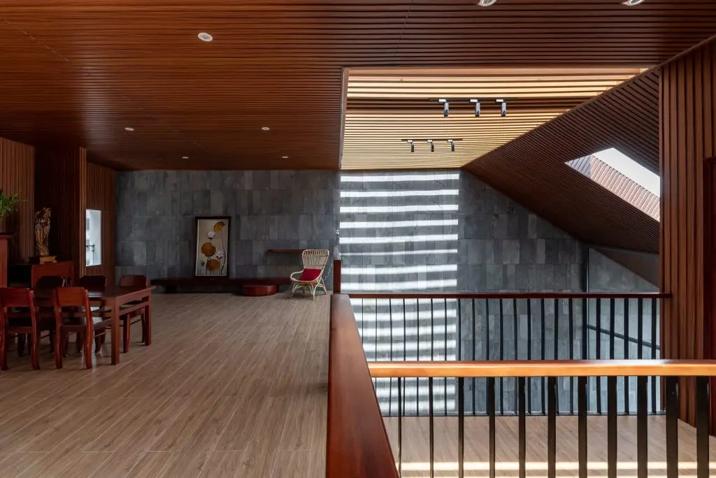 Mái nhà cũng được khoét rỗng để tạo thành các cửa sổ kính giúp đưa ánh sáng vào trung tâm ngôi nhà, làm cho ngôi nhà trở nên vui vẻ, sống động và tràn đầy năng lượng. Đồng thời, cửa sổ mái ở phòng ngủ tầng 3 giúp chủ nhà có thể ngắm nhìn bầu trời đêm từ trên giường. Các vật liệu mộc mạc như đá mài, gỗ, tôn tổ ong, gối và các vật liệu địa phương đặc trưng của Việt Nam tạo nên cảm giác quen thuộc và có phần hoài niệm cho những chủ nhà trung niên.