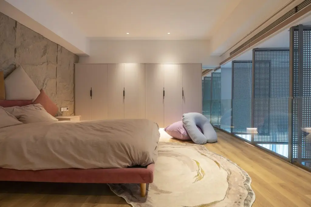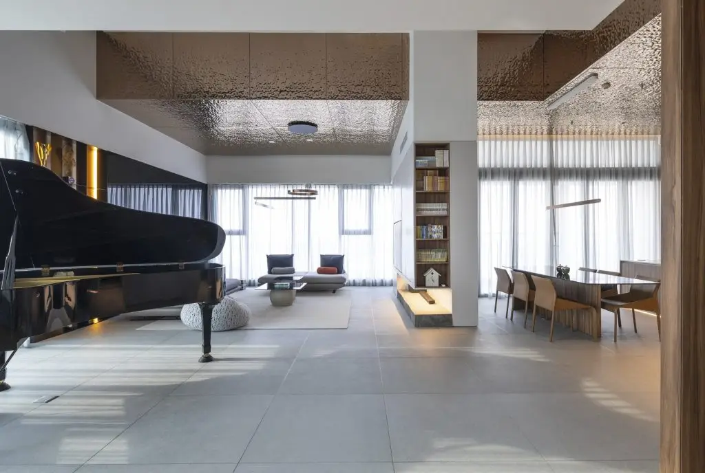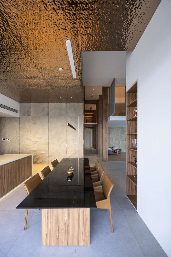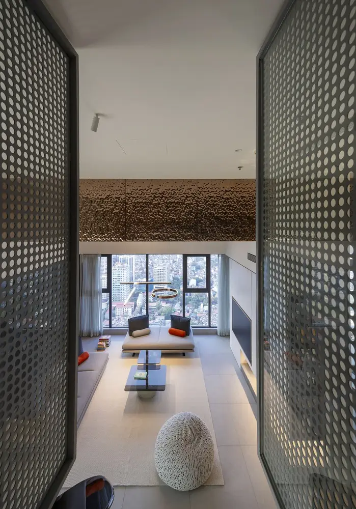 Không gian chung được mở rộng, loại bỏ các vách ngăn để hợp nhất liền mạch và mang lại tầm nhìn toàn cảnh ra xung quanh. Các chức năng phụ trợ được giấu trong các tủ âm tường và các phòng ẩn trong các bức tường đá, tối ưu hóa việc tận dụng không gian. Các chức năng cụ thể được tổ chức thành các mô-đun riêng lẻ, chẳng hạn như góc tắm vòi sen đứng, nhà vệ sinh, bồn tắm, phòng giặt và kho chứa đồ. Những cánh cửa ẩn được sử dụng một cách có chiến lược nhằm tạo ra những điều bất ngờ trong quá trình sử dụng, cho phép các không gian kết nối hoặc mở ra một cách liền mạch tùy theo mục đích sử dụng. Thiết kế này nhấn mạnh sự sáng tạo, cảm hứng và sự tự do của căn hộ.