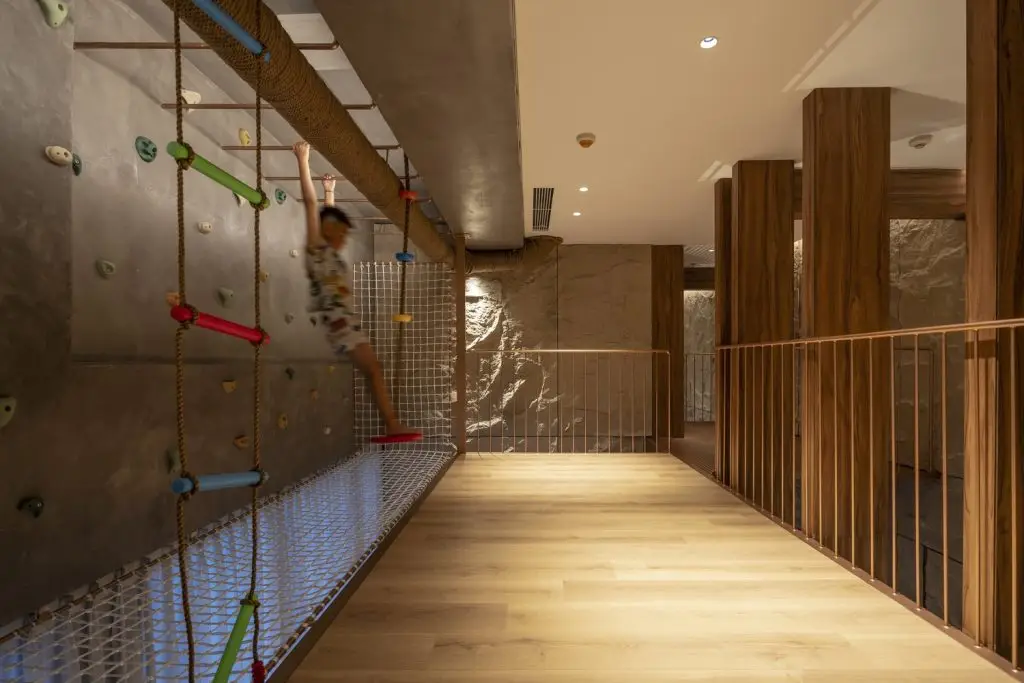 Một sàn thép lớn được hỗ trợ bởi hệ thống cột gỗ được nâng lên để tạo tầng lửng cho trẻ em. Ngược lại, các hệ thống bổ sung như vệ sinh, kho chứa và các phòng chức năng được giấu bên trong bức tường đá lớn, được nối với nhau bằng sàn thép mỏng. Sự tương phản giữa các vật liệu tạo ra sự tương đồng hấp dẫn với hang động hoặc khu rừng, với các cột gỗ tạo thành những không gian linh hoạt có thể biến đổi và thích ứng với nhiều chức năng khác nhau dựa trên nhu cầu và trí tưởng tượng của người dùng.