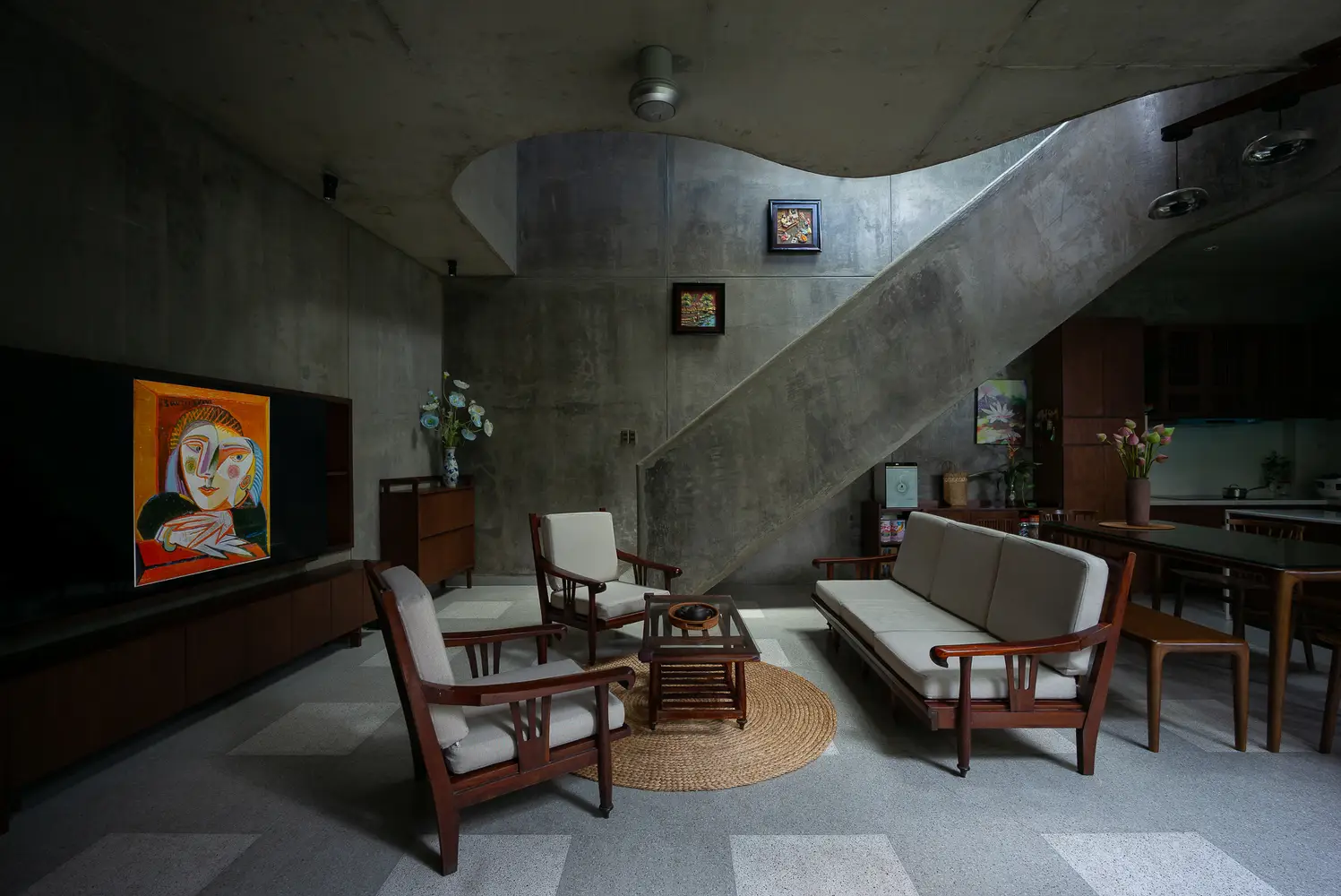 4. Tối ưu hóa kích thước hạn chế: Khu đất có chiều sâu hạn chế, diện tích mỗi sàn khoảng 40m2 nhưng khoảng lùi quy hoạch lớn – điều này làm tăng thách thức về diện tích sử dụng. Để tránh cảm giác chật chội và tăng độ thông thoáng, những bức tường kiên cố được hạn chế tối đa. Thay vào đó, các khối gỗ xác định không gian riêng tư trong khi các tấm kính lớn được sử dụng để mở tầm nhìn ra vườn và mang lại ánh sáng tự nhiên vào ban ngày. Độ nhám của vật liệu (đá núi lửa, đá mài, xi măng đánh bóng…) kết hợp với tông màu trầm chủ đạo tạo nên sự mát mẻ, đồng thời tăng vẻ sang trọng cho công trình.