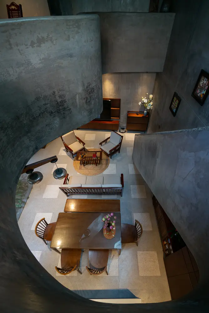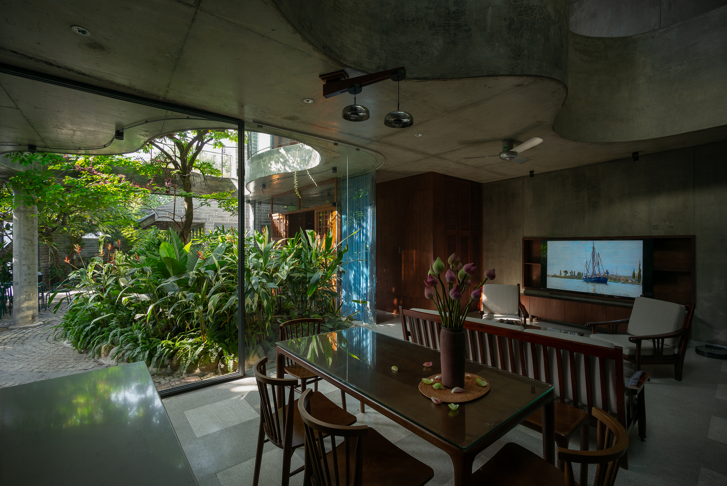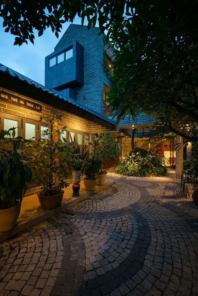3. Tăng cường gắn kết gia đình: Không gian sinh hoạt chung và phòng ông bà được bố trí ở tầng trệt thuận tiện cho việc ra vào không gian thờ cúng, lăng mộ, sân vườn. Thông qua việc mở khoảng hiên rộng trong vườn, ông bà luôn có thể quan sát và trò chuyện với các cháu khi vui chơi. Không gian của gia chủ được bố trí ở tầng trên cùng đảm bảo sự riêng tư.  Sự luân chuyển theo chiều dọc được thiết kế có chủ đích để các thành viên trong gia đình đi qua các không gian chung một cách tự nhiên, thúc đẩy sự tương tác trong sinh hoạt hàng ngày