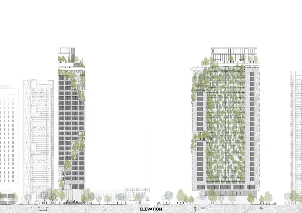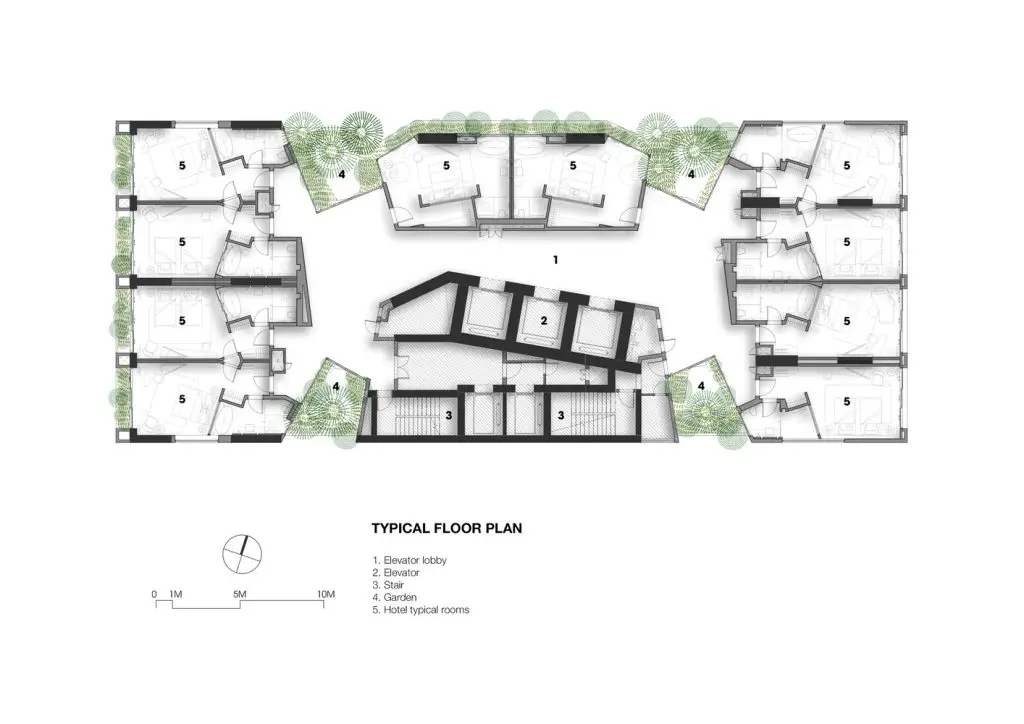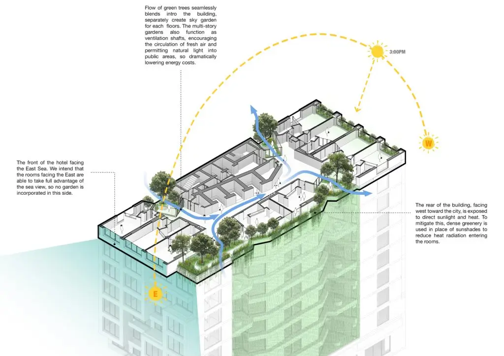 Việc bố trí các khu vườn xanh trên bề mặt khách sạn được kết hợp hài hòa với đa dạng không gian cho mỗi phòng. Các phòng hướng biển được xây dựng với tường kính lớn để tận dụng tầm nhìn ngoạn mục. Trong khi đó, các phòng hướng Tây, hướng về trung tâm thành phố, được bố trí lùi về phía sau để tận dụng không gian vườn xanh. Điều này không chỉ mang đến một góc xanh mát giữa lòng đô thị mà còn tạo bóng mát cho các phòng và làm mát toàn bộ không gian bên trong. Tất nhiên, điều này cũng giúp tiết kiệm chi phí sưởi ấm và làm mát.