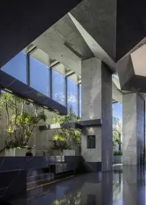 Khách sạn M được thiết kế dựa trên ý tưởng về một dòng suối chảy trên bề mặt núi đá. Vật liệu bê tông mặt phẳng gợi lên hình ảnh một kết cấu vững chắc, tựa như một khối núi hùng vĩ trong tự nhiên. Trong khi đó, dòng suối chảy được thể hiện bằng những đường cong uốn lượn của cây xanh, đan xen liền mạch với tòa nhà. Cách tiếp cận này tạo nên một tổng thể kiến trúc hài hòa, hòa quyện tuyệt đẹp với cảnh quan thiên nhiên ven biển đô thị.