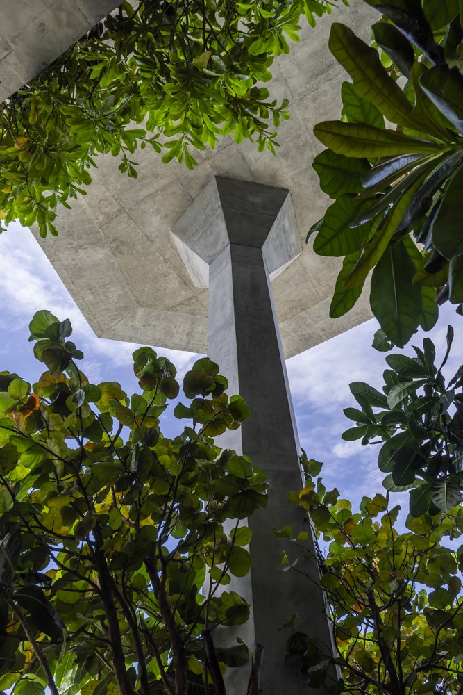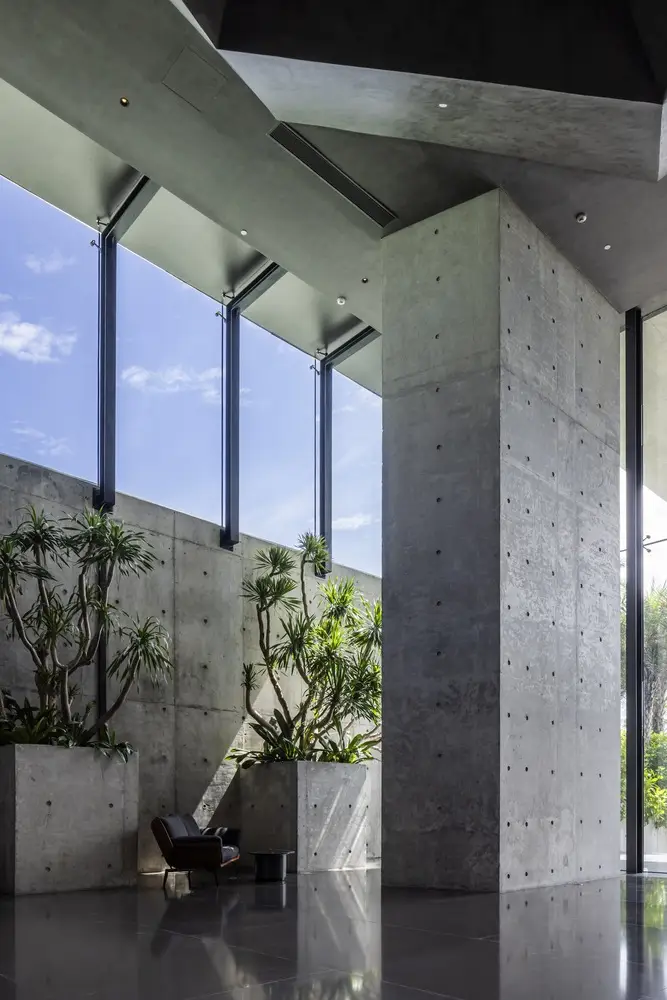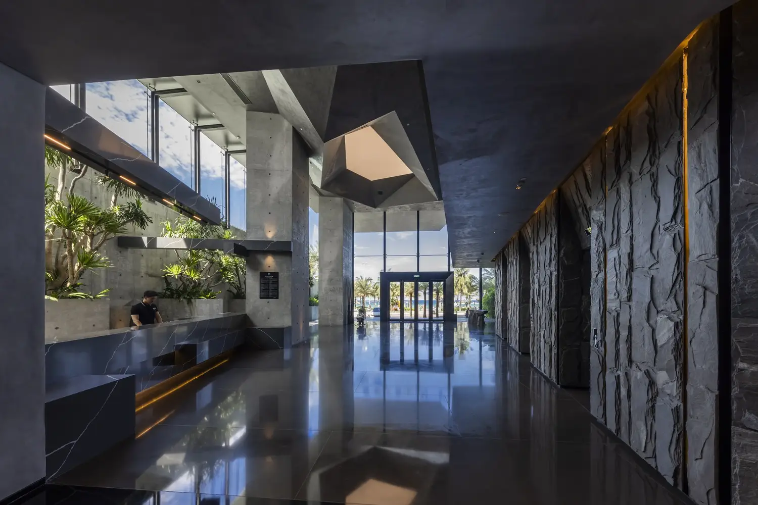 Khách sạn M được thiết kế dựa trên ý tưởng về một dòng suối chảy trên bề mặt núi đá. Vật liệu bê tông mặt phẳng gợi lên hình ảnh một kết cấu vững chắc, tựa như một khối núi hùng vĩ trong tự nhiên. Trong khi đó, dòng suối chảy được thể hiện bằng những đường cong uốn lượn của cây xanh, đan xen liền mạch với tòa nhà. Cách tiếp cận này tạo nên một tổng thể kiến trúc hài hòa, hòa quyện tuyệt đẹp với cảnh quan thiên nhiên ven biển đô thị.