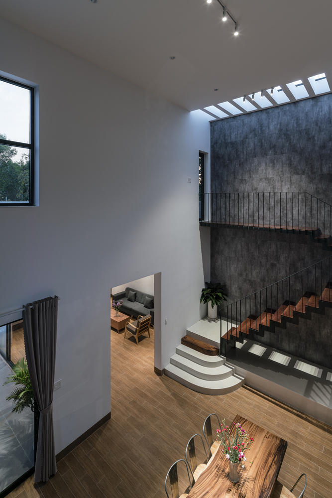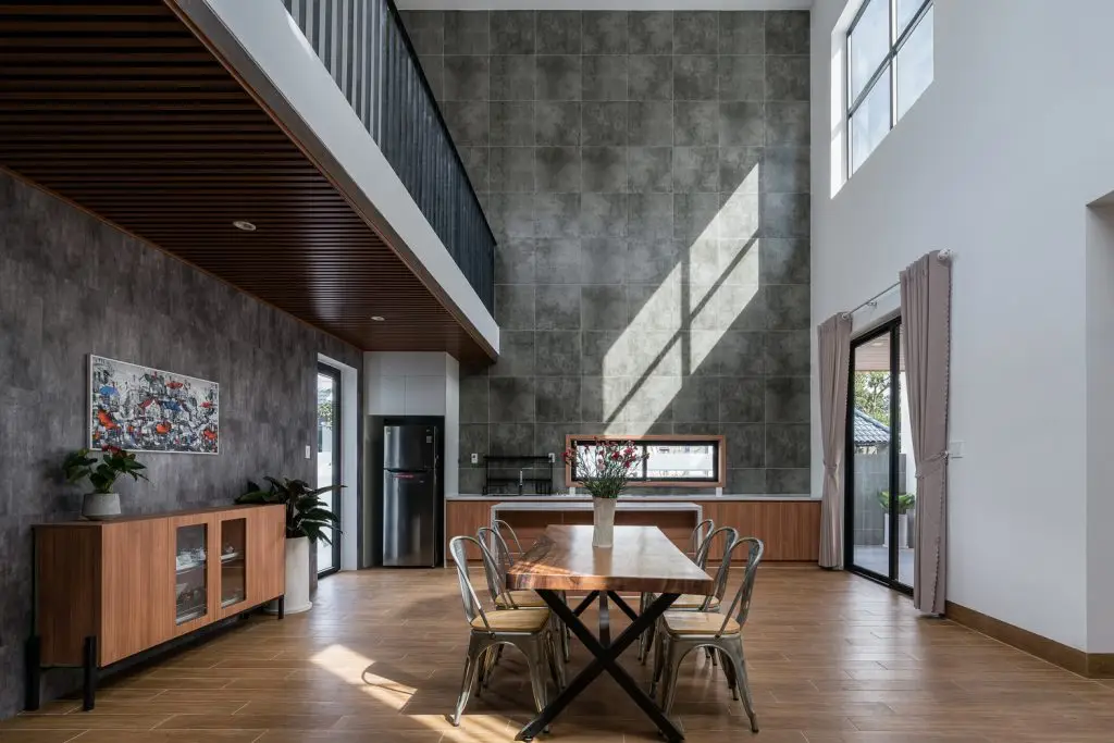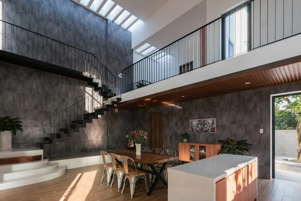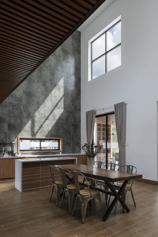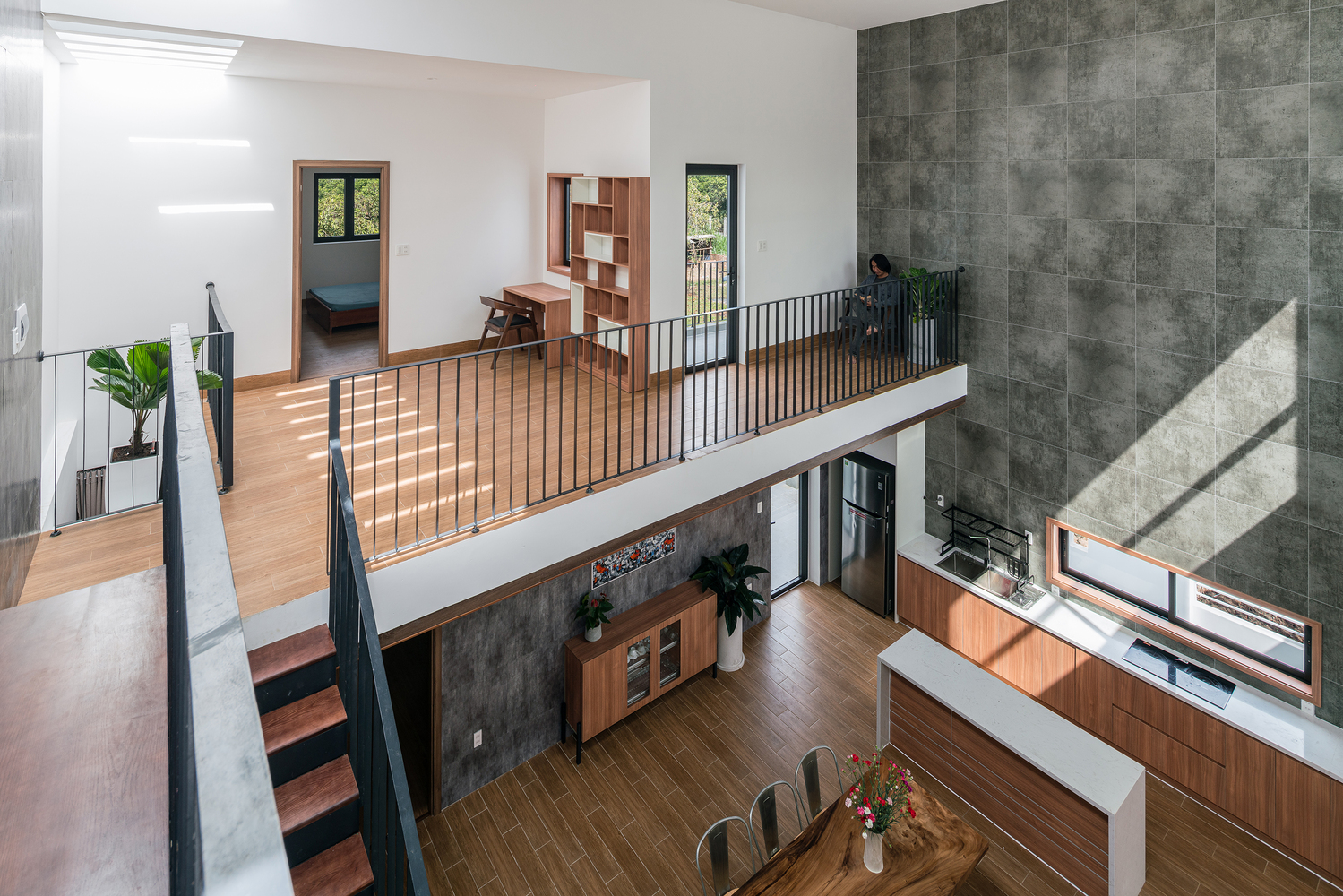 Để thuận tiện cho việc nấu nướng trong khi trông nom em bé, khu vực bếp được bố trí ở giữa nhà. Từ vị trí nấu nướng, người mẹ có thể yên tâm quan sát không gian chơi của bé mà vẫn đảm bảo sự tự do cho các bé. Khoảng không phía trên khu vực bếp tạo nên một không gian mở, thoải mái, giúp người mẹ thư giãn khi nấu nướng. Từ đây, ánh nắng mặt trời và gió có thể xuyên qua, xuống sàn nhà, giúp không gian luôn thoáng mát và sạch sẽ.