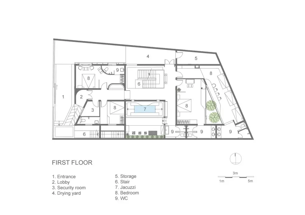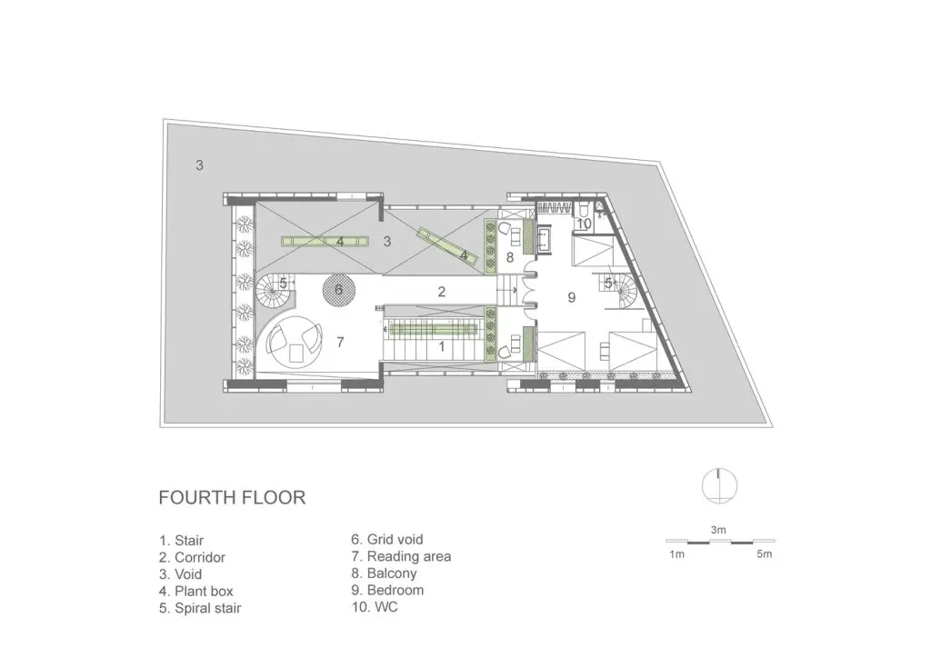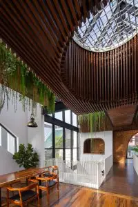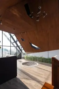 Không gian nội thất được chia thành 3 tầng và 1 tầng áp mái, kết nối các tầng với nhau bằng cầu thang dẫn từ sảnh chính lên khu vực sinh hoạt chung. Tầng này còn có một nhà bếp nhỏ xinh xắn kết hợp với khu vực ăn uống vô cùng thoải mái và khu vực làm việc. Tổng cộng có 9 phòng, bao gồm cả khu vực sinh hoạt chung và khu vực vệ sinh riêng, được thiết kế để đáp ứng mọi nhu cầu của khách, trong đó phòng thông tầng là điểm nhấn chính của khu vực gác mái.
