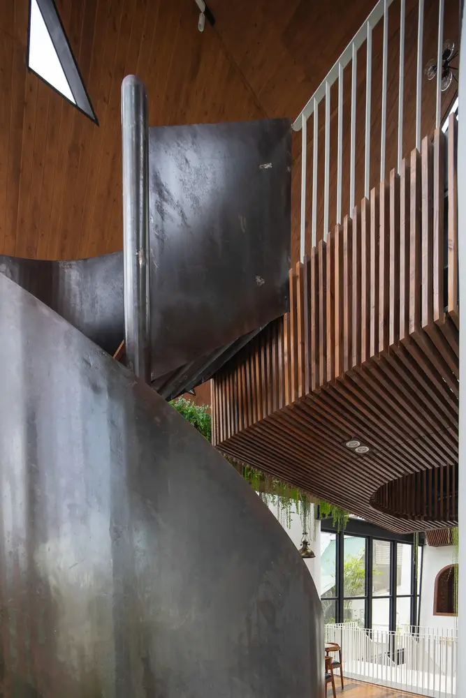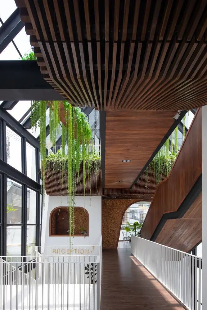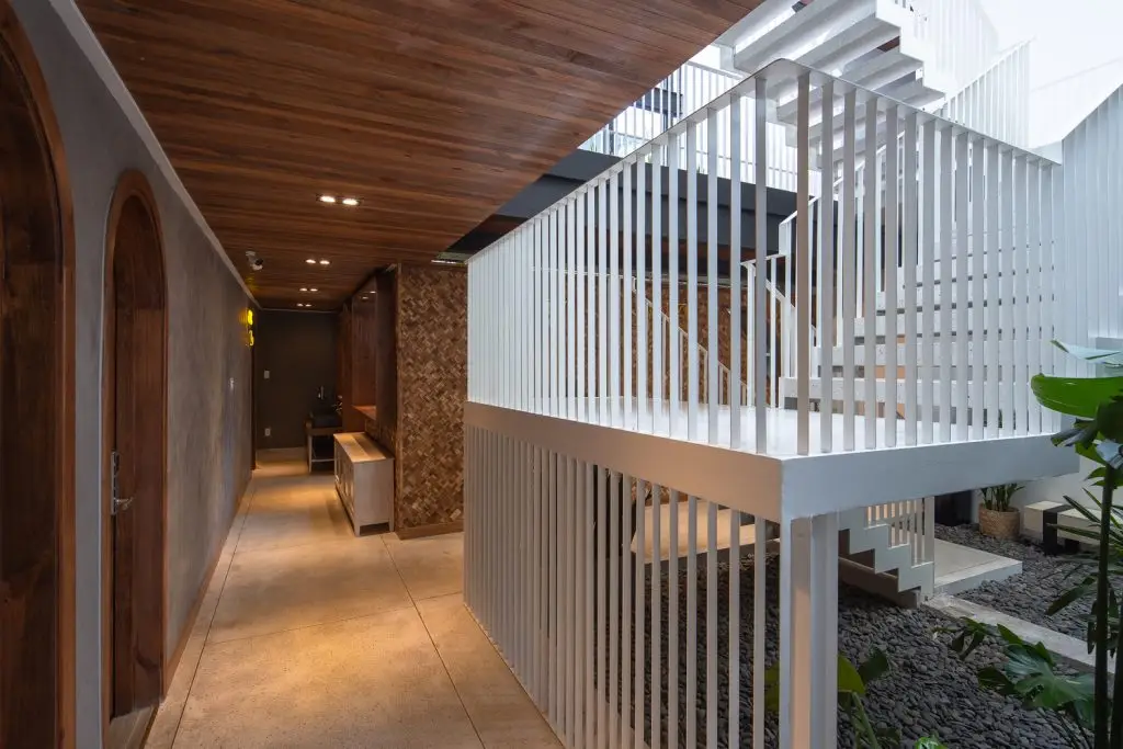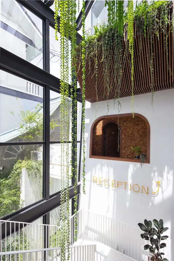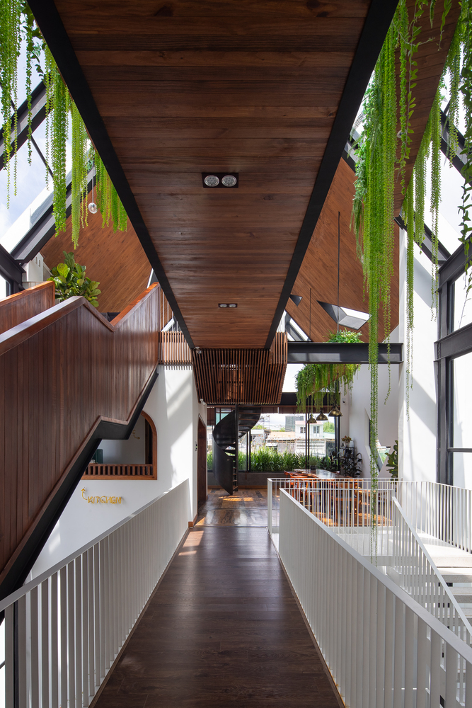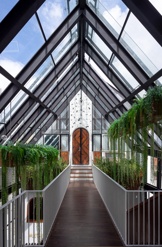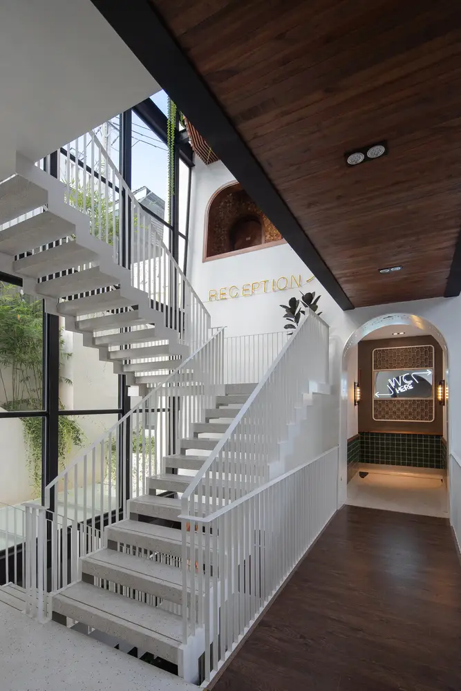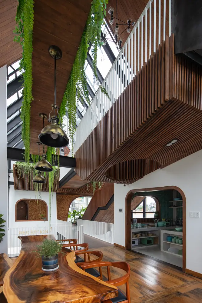 Không gian nội thất được chia thành 3 tầng và 1 tầng áp mái, kết nối các tầng với nhau bằng cầu thang dẫn từ sảnh chính lên khu vực sinh hoạt chung. Tầng này còn có một nhà bếp nhỏ xinh xắn kết hợp với khu vực ăn uống vô cùng thoải mái và khu vực làm việc. Tổng cộng có 9 phòng, bao gồm cả khu vực sinh hoạt chung và khu vực vệ sinh riêng, được thiết kế để đáp ứng mọi nhu cầu của khách, trong đó phòng thông tầng là điểm nhấn chính của khu vực gác mái.