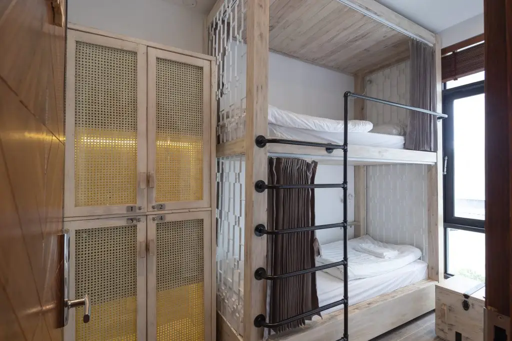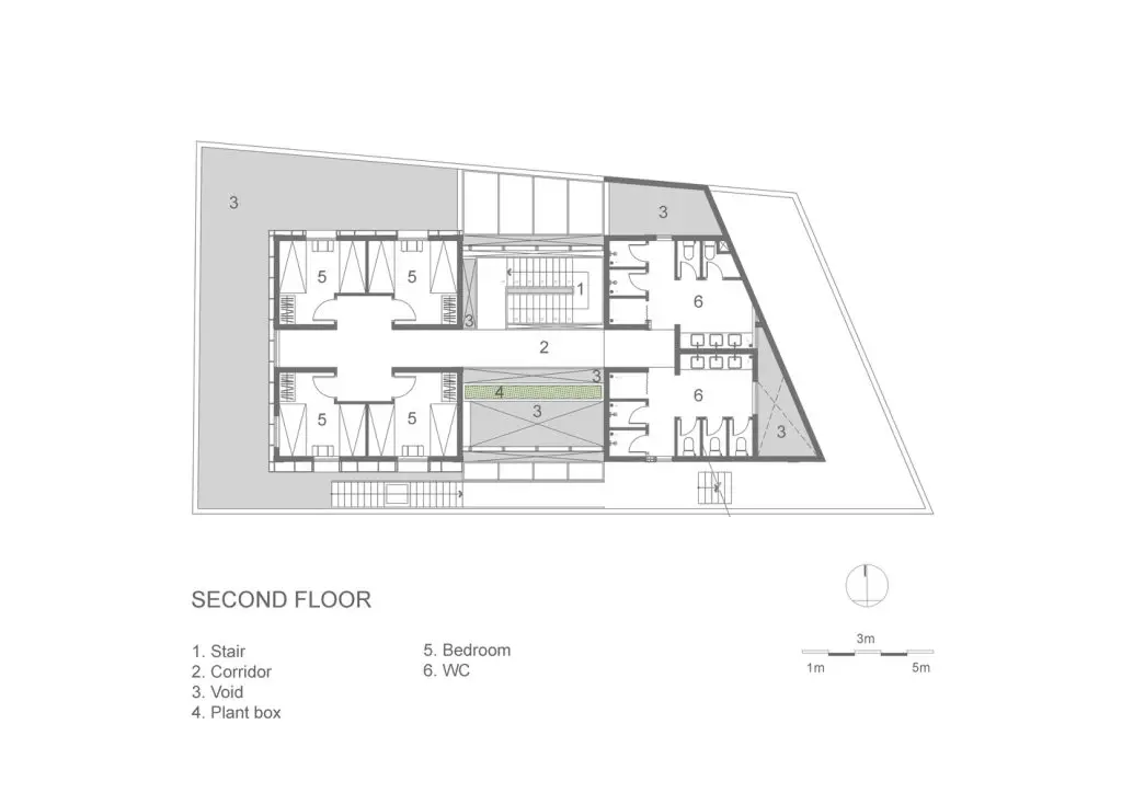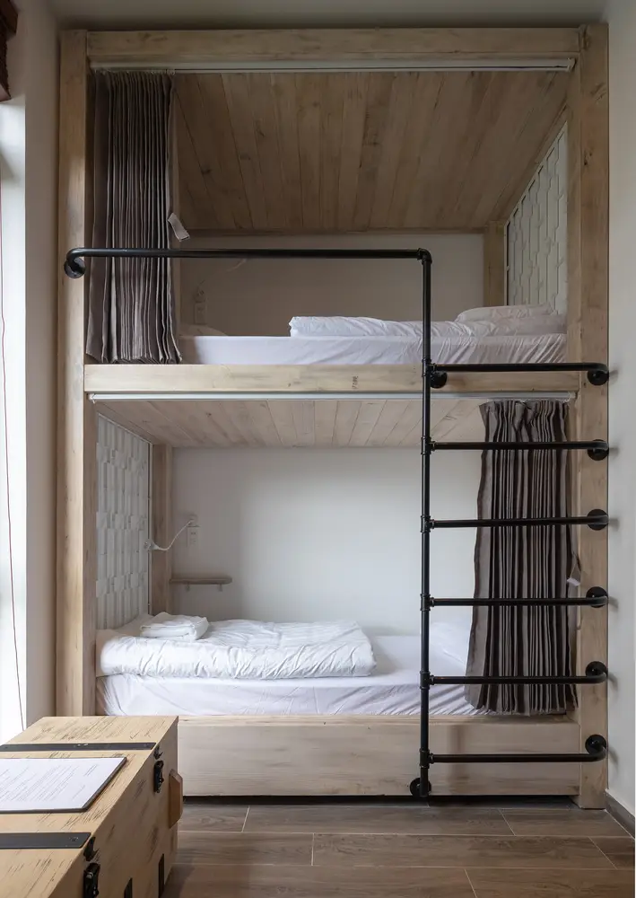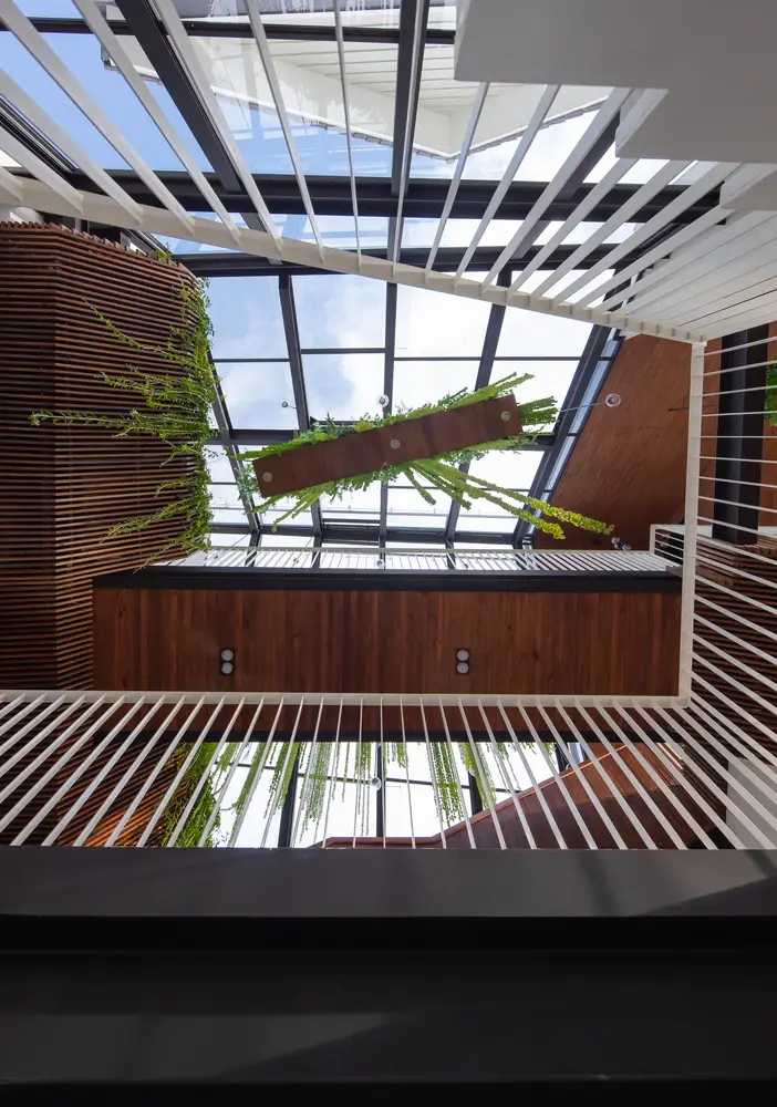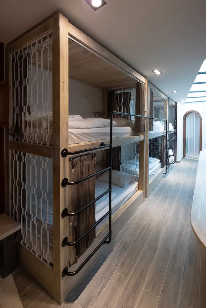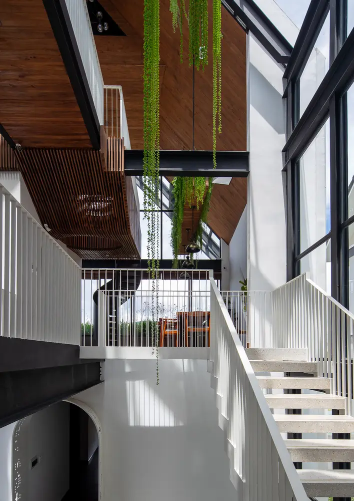 Không gian nội thất được chia thành 3 tầng và 1 tầng áp mái, kết nối các tầng với nhau bằng cầu thang dẫn từ sảnh chính lên khu vực sinh hoạt chung. Tầng này còn có một nhà bếp nhỏ xinh xắn kết hợp với khu vực ăn uống vô cùng thoải mái và khu vực làm việc. Tổng cộng có 9 phòng, bao gồm cả khu vực sinh hoạt chung và khu vực vệ sinh riêng, được thiết kế để đáp ứng mọi nhu cầu của khách, trong đó phòng thông tầng là điểm nhấn chính của khu vực gác mái.