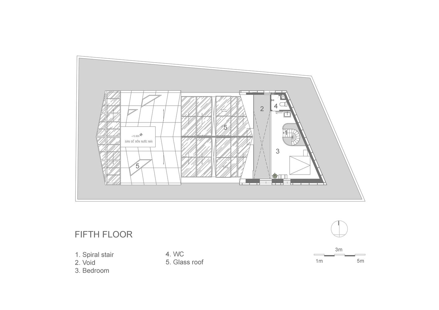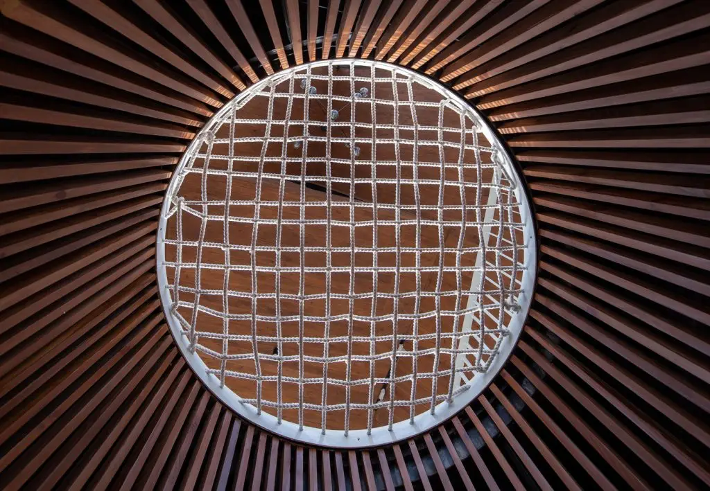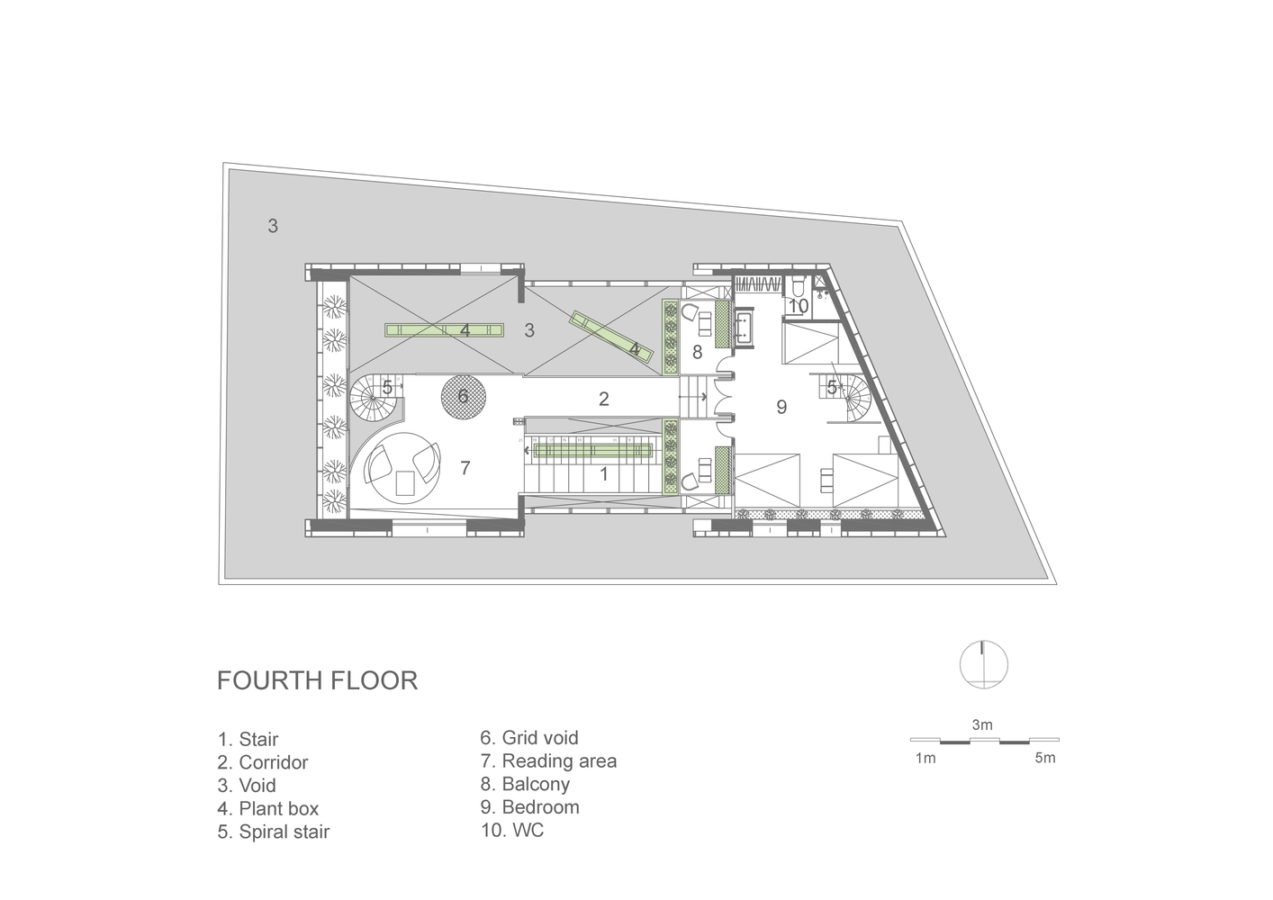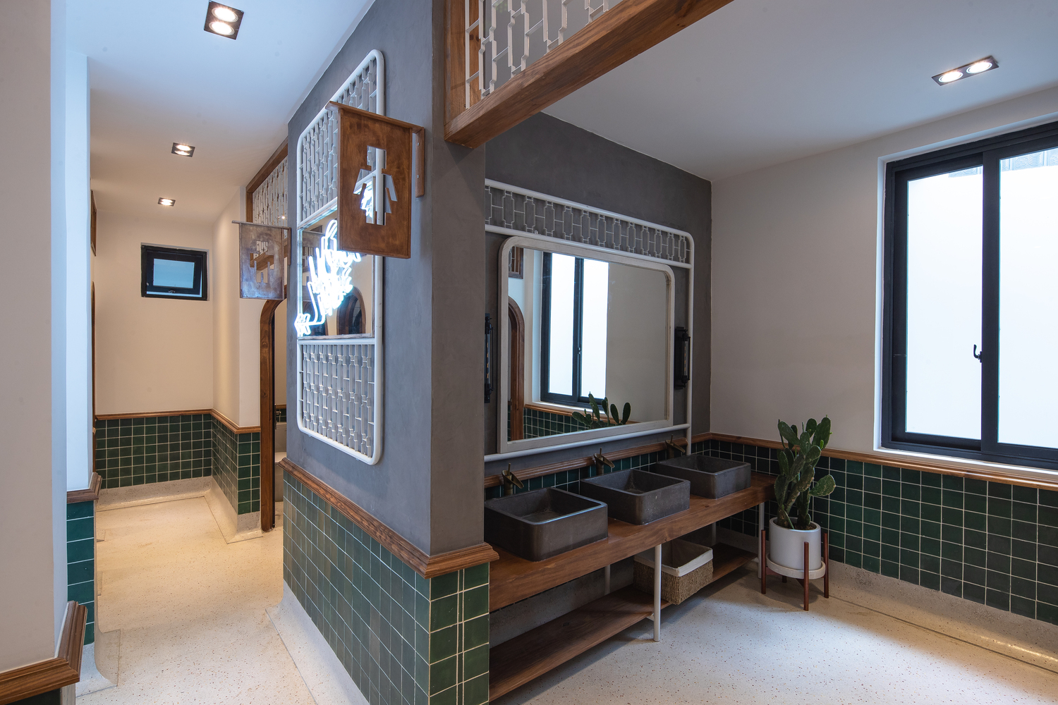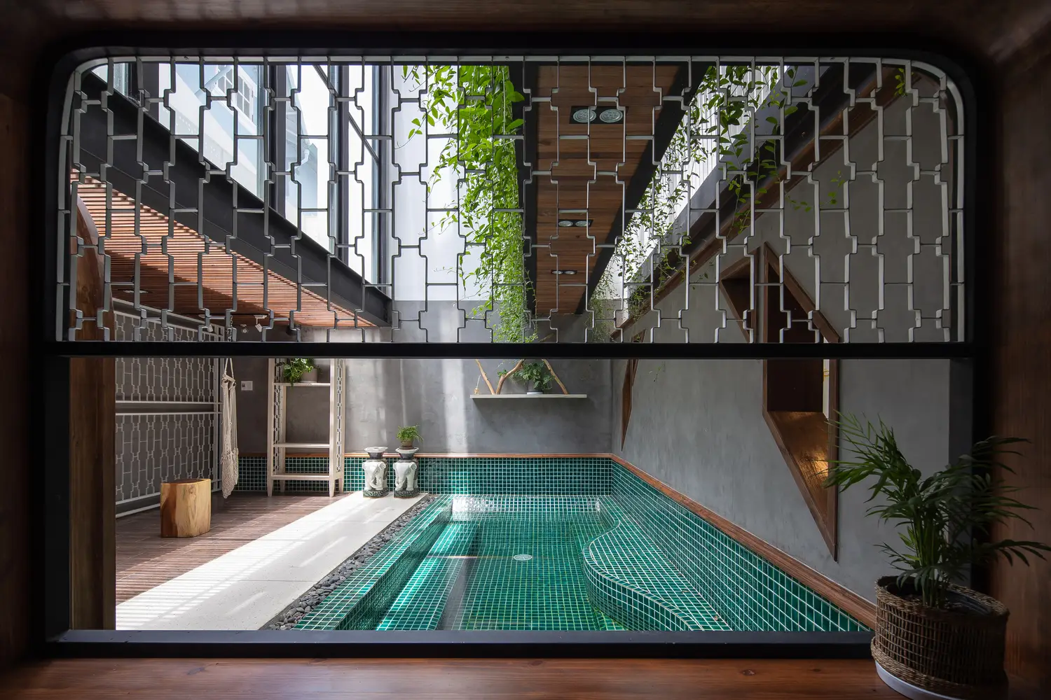 Không gian nội thất được chia thành 3 tầng và 1 tầng áp mái, kết nối các tầng với nhau bằng cầu thang dẫn từ sảnh chính lên khu vực sinh hoạt chung. Tầng này còn có một nhà bếp nhỏ xinh xắn kết hợp với khu vực ăn uống vô cùng thoải mái và khu vực làm việc. Tổng cộng có 9 phòng, bao gồm cả khu vực sinh hoạt chung và khu vực vệ sinh riêng, được thiết kế để đáp ứng mọi nhu cầu của khách, trong đó phòng thông tầng là điểm nhấn chính của khu vực gác mái.