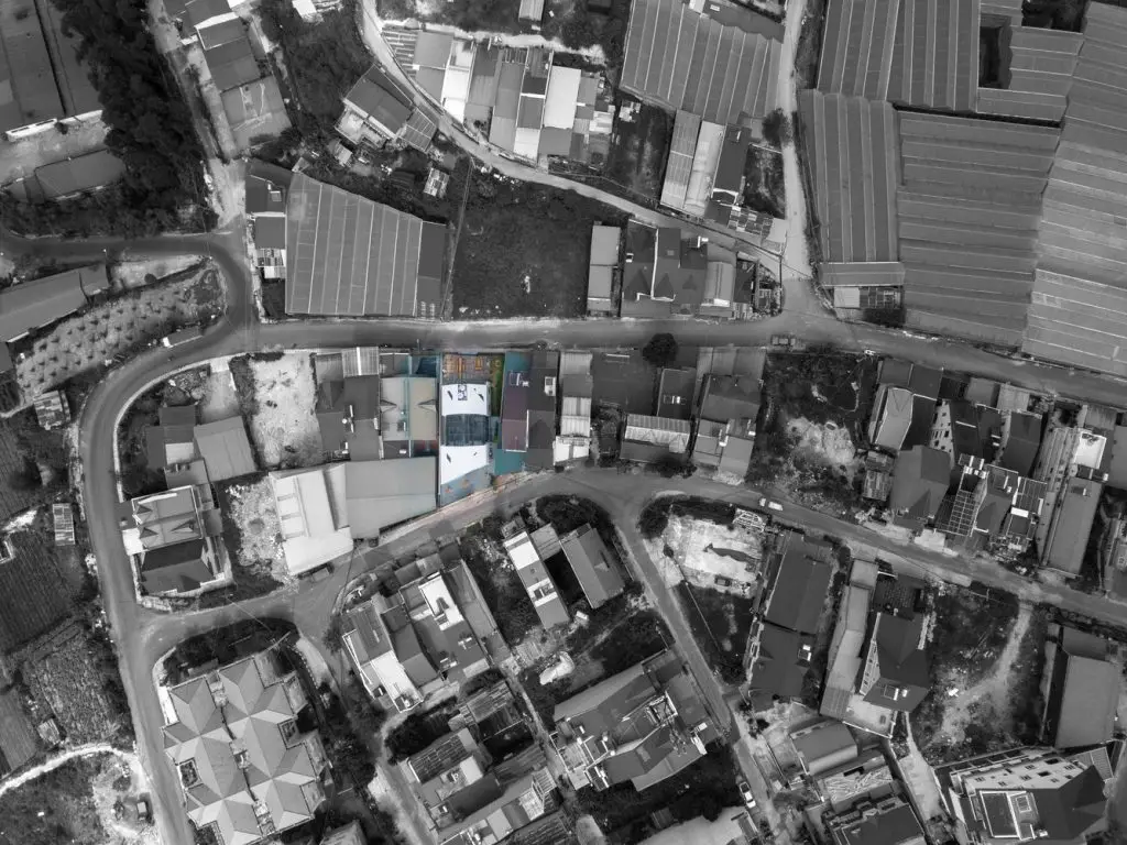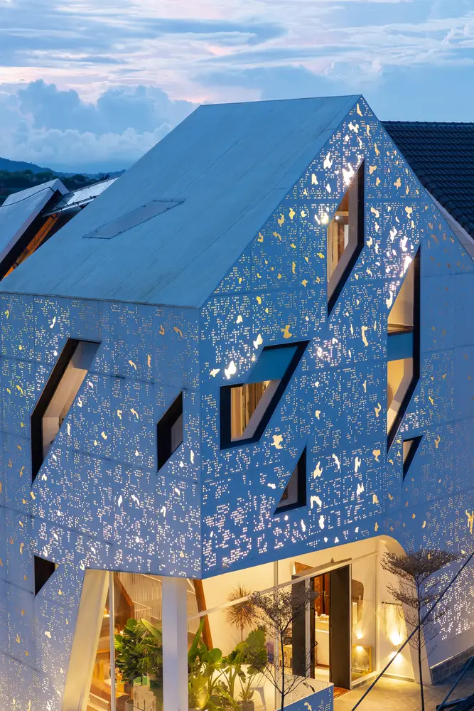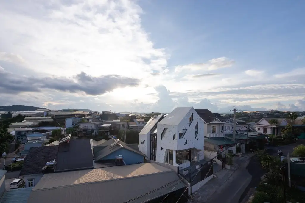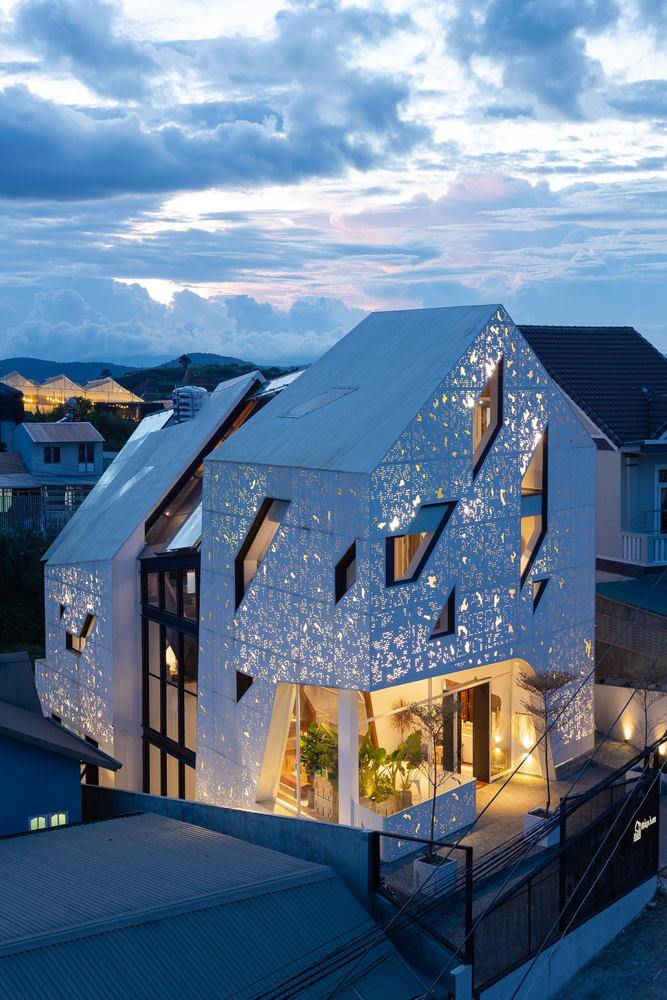Tọa lạc trên một sườn dốc cao, ẩn mình sâu trong một con hẻm nhỏ hẹp của Đà Lạt, công trình sở hữu hai mặt tiếp giáp với những địa hình khác nhau, càng làm tăng thêm sự thú vị. Điểm nhấn nổi bật giữa không gian xung quanh chính là màu trắng đặc trưng và kiến trúc mang đậm dấu ấn của thành phố sương mù. Tuy kế thừa phong cách kiến trúc hiện đại, mặt tiền của công trình được bao phủ hoàn toàn bằng lớp thép sơn trắng , đồng thời được gia công CNC với những họa tiết thiết kế riêng biệt.
