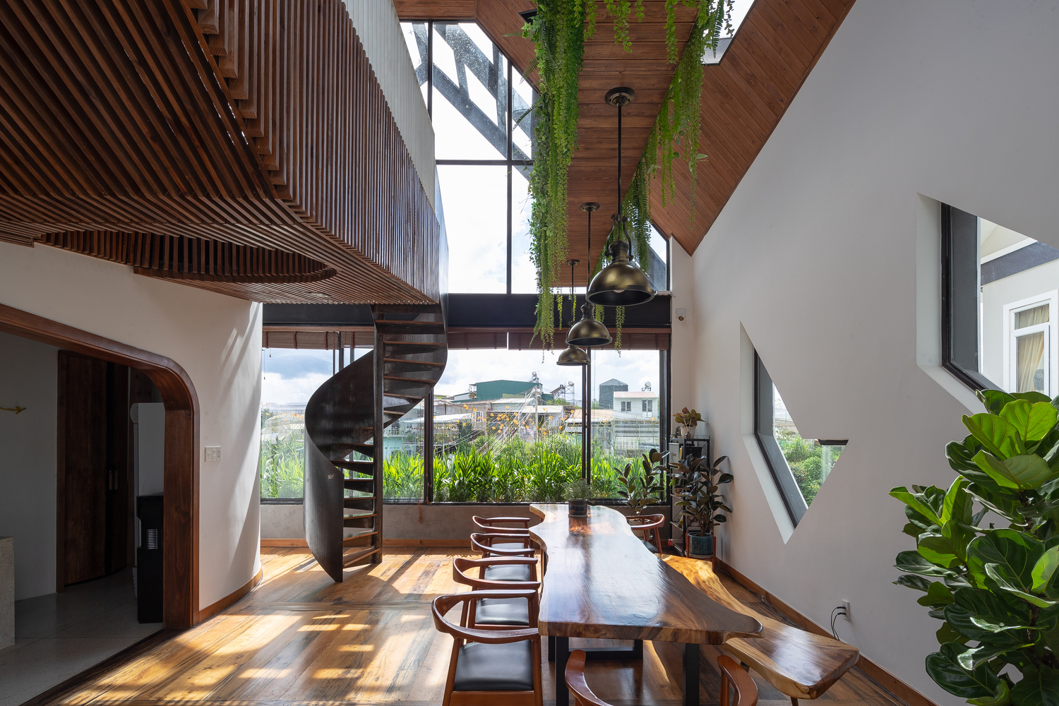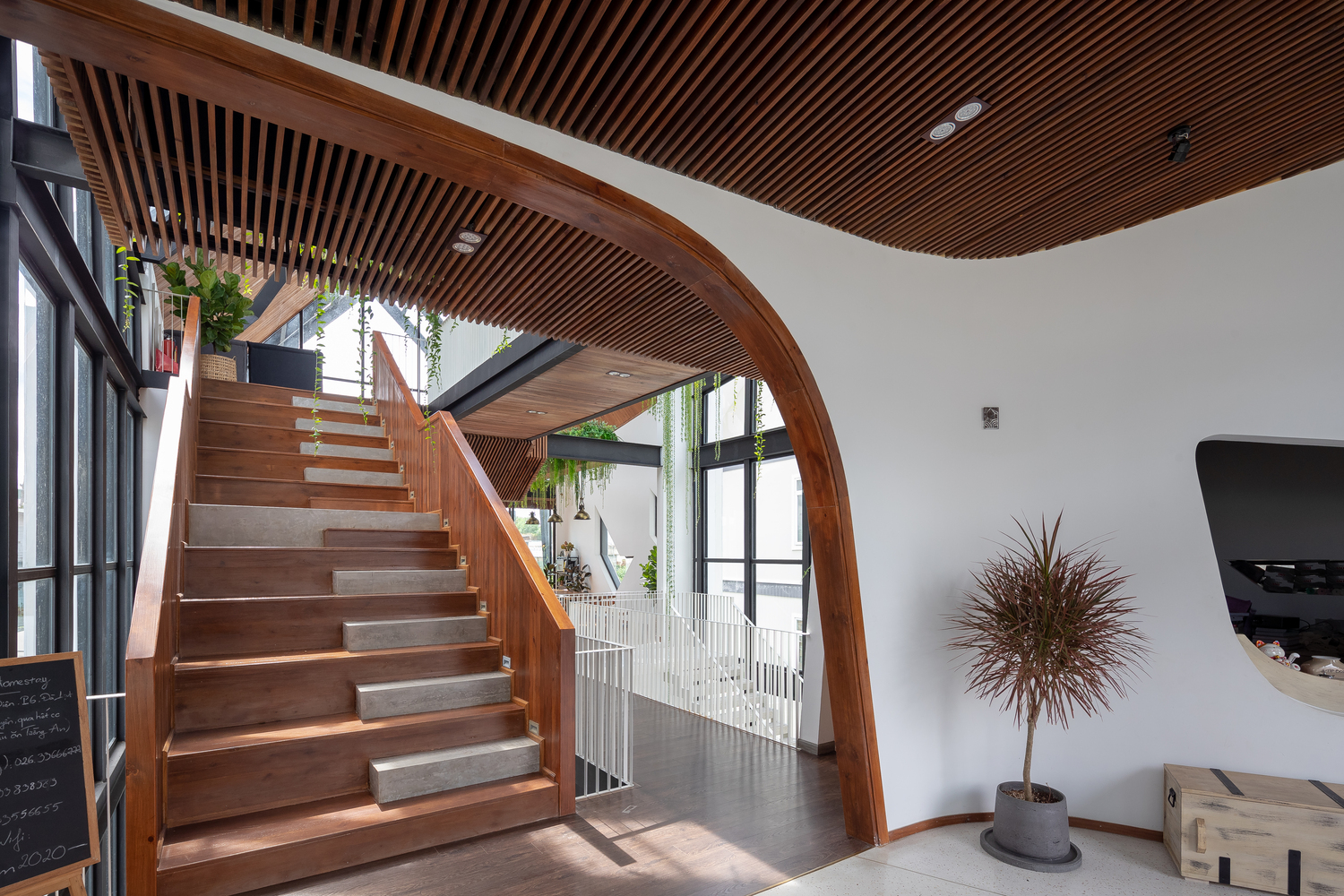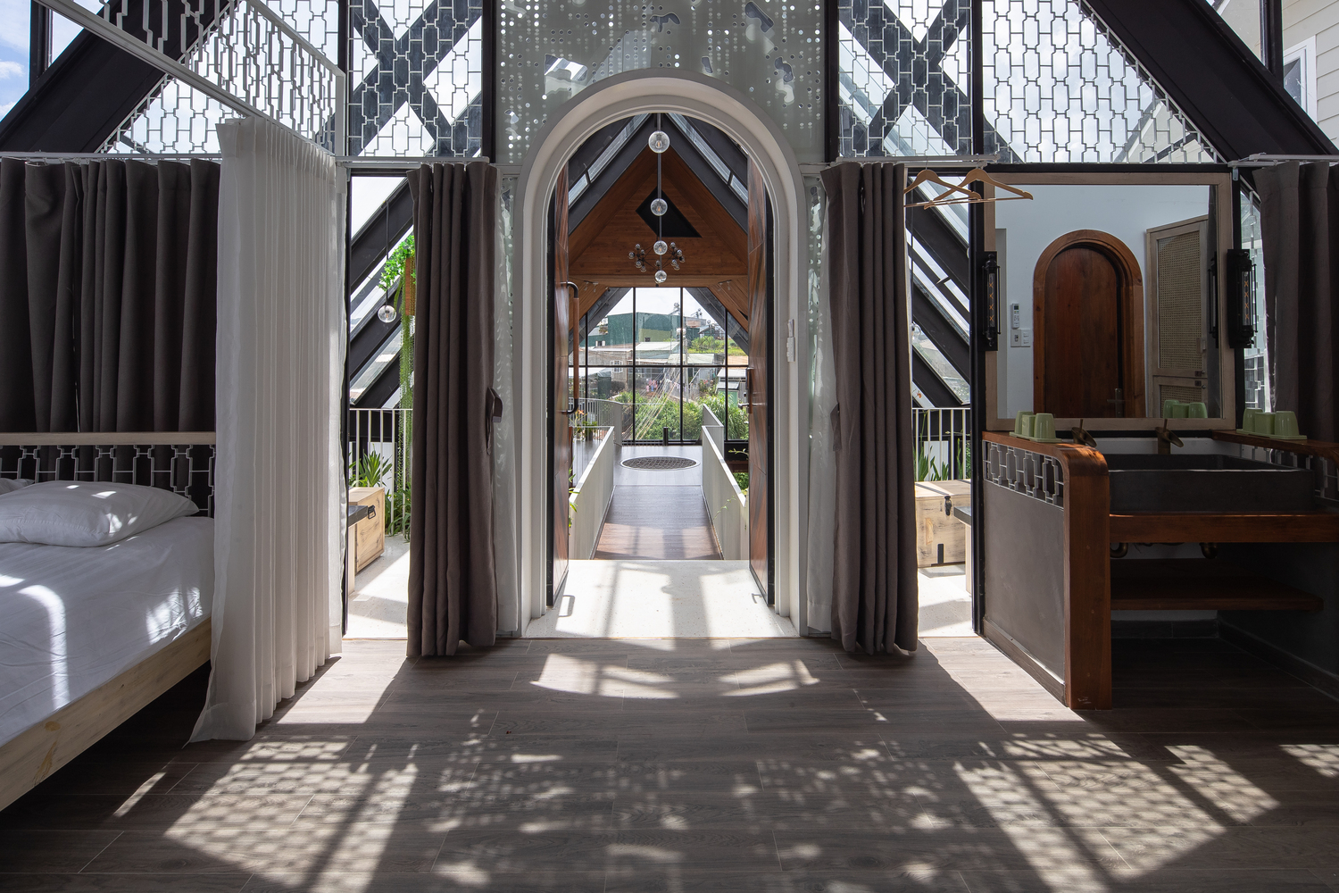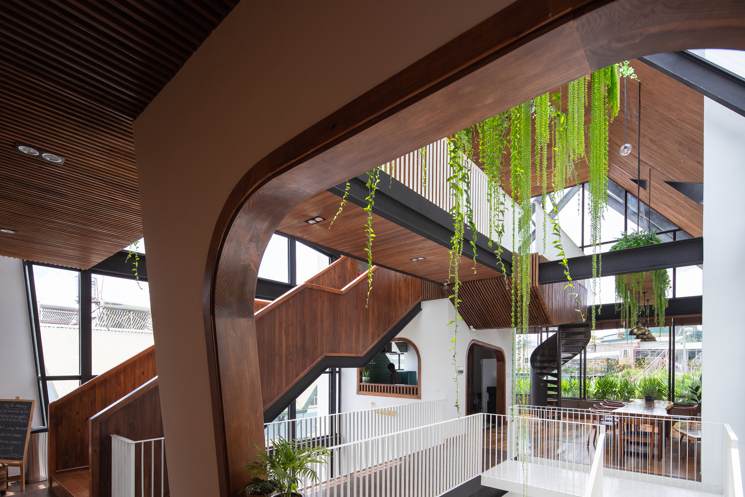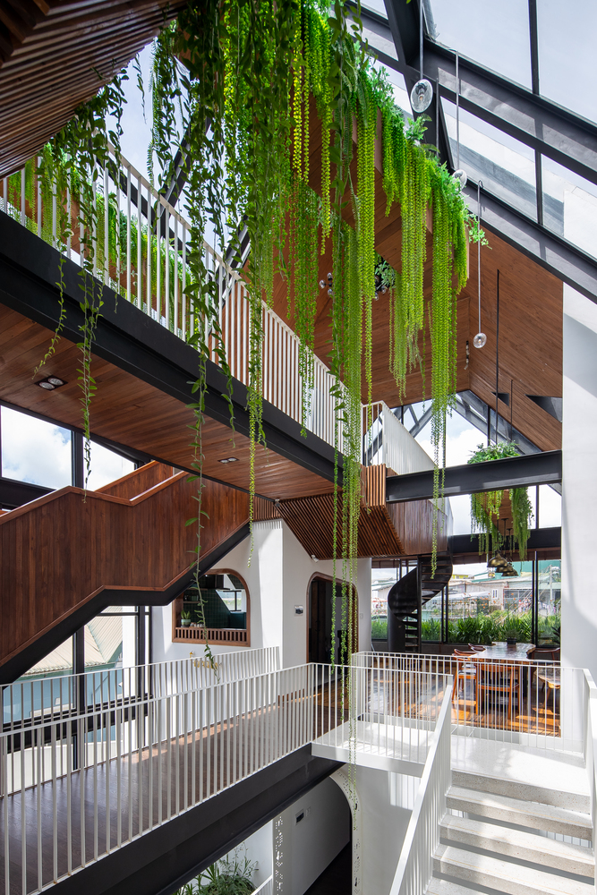 Kết cấu công trình được tạo nên từ sự kết hợp của các khối thép định hình nhưng không quá cứng nhắc. Mặt khác, sự kết hợp hài hòa giữa gỗ thông và màu trắng tạo nên nét gần gũi, dịu dàng, góp phần tạo nên một Đà Lạt đáng để trải nghiệm trong đời mỗi người.