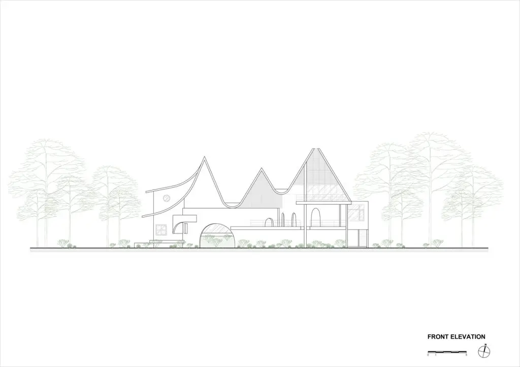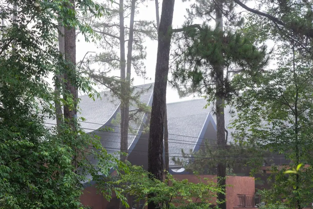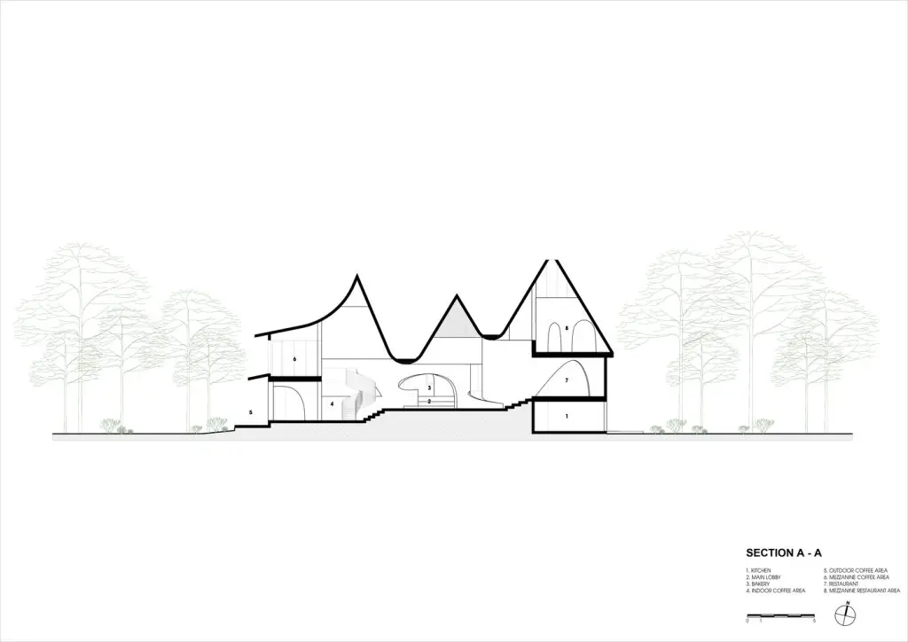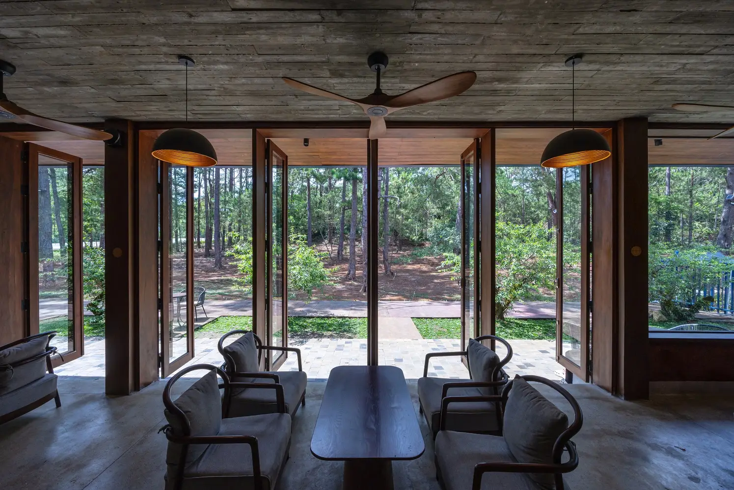 Dưới mái che thống nhất này, các bức tường được bố trí với cảm giác tự do và uyển chuyển, tách rời khỏi mái nhà để cho phép ánh sáng ban ngày và gió tự nhiên len lỏi qua những khoảng trống được thiết kế có chủ đích. Tất cả các khu vực chức năng được phân tán nhưng vẫn liên kết với nhau bởi mái nhà bao trùm, tạo nên một trải nghiệm không gian liền mạch. Lối vào chính xuyên qua một sân trong hình tròn ngoài trời, tạo ra một ranh giới nhẹ nhàng giữa không gian bên ngoài và bên trong. Từ điểm này, các không gian dần dần trải dài về phía rừng thông, những thay đổi tinh tế về độ cao khuyến khích sự thân mật và tương tác. Sự di chuyển qua các tầng này hé lộ một chuỗi sự kiện được dàn dựng cẩn thận giữa sự mở và khép kín, ánh sáng và bóng tối – đóng khung thiên nhiên trong những cái nhìn thoáng qua được chọn lọc thay vì phơi bày tất cả cùng một lúc.