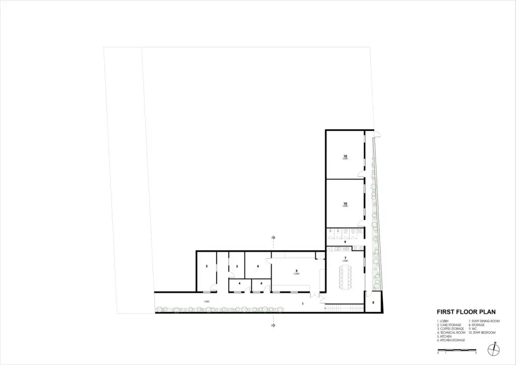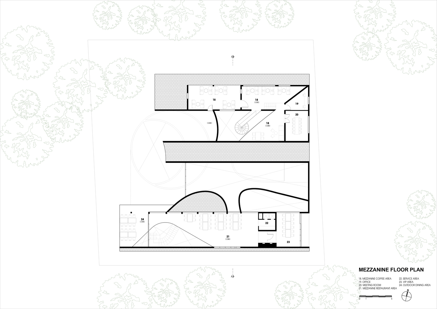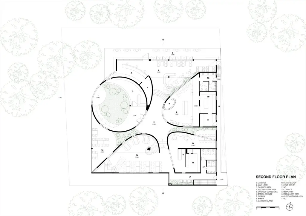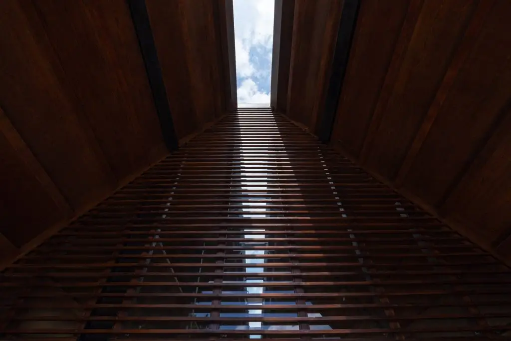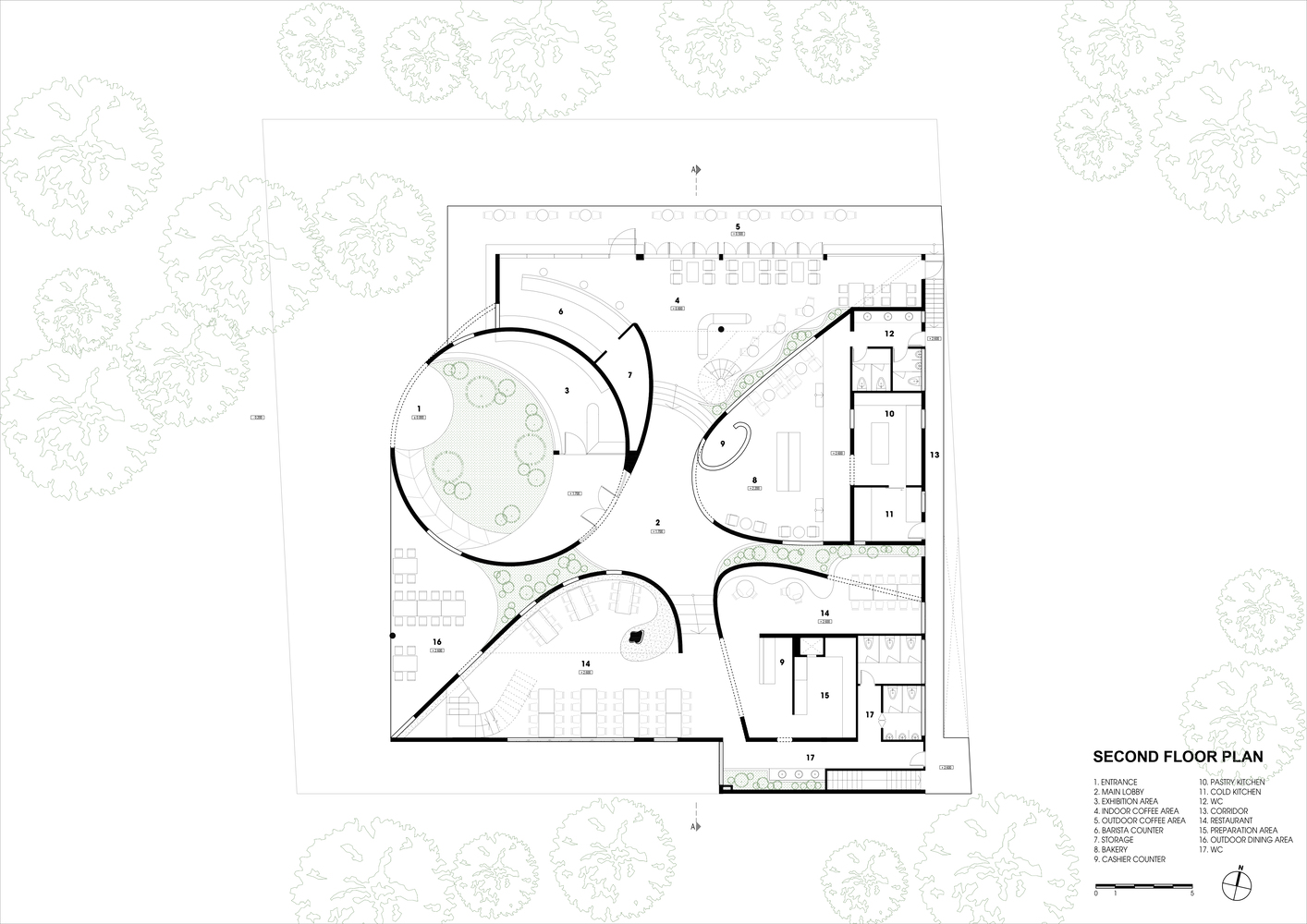 Dưới mái che thống nhất này, các bức tường được bố trí với cảm giác tự do và uyển chuyển, tách rời khỏi mái nhà để cho phép ánh sáng ban ngày và gió tự nhiên len lỏi qua những khoảng trống được thiết kế có chủ đích. Tất cả các khu vực chức năng được phân tán nhưng vẫn liên kết với nhau bởi mái nhà bao trùm, tạo nên một trải nghiệm không gian liền mạch. Lối vào chính xuyên qua một sân trong hình tròn ngoài trời, tạo ra một ranh giới nhẹ nhàng giữa không gian bên ngoài và bên trong. Từ điểm này, các không gian dần dần trải dài về phía rừng thông, những thay đổi tinh tế về độ cao khuyến khích sự thân mật và tương tác. Sự di chuyển qua các tầng này hé lộ một chuỗi sự kiện được dàn dựng cẩn thận giữa sự mở và khép kín, ánh sáng và bóng tối – đóng khung thiên nhiên trong những cái nhìn thoáng qua được chọn lọc thay vì phơi bày tất cả cùng một lúc.