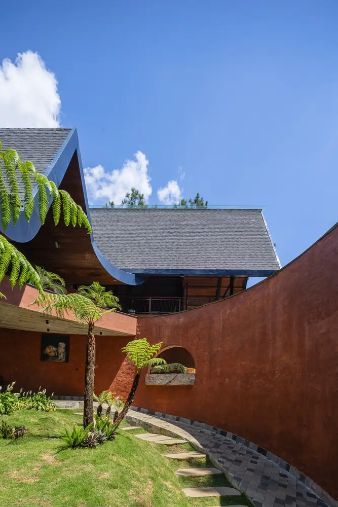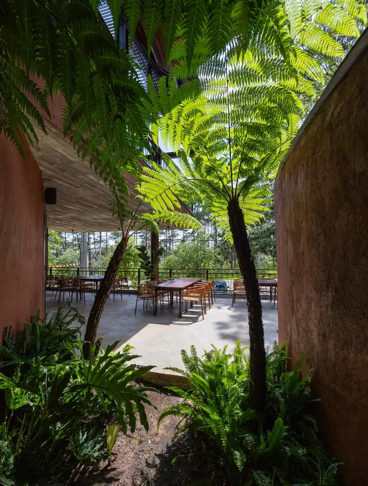 Nằm ẩn mình trong khu Mang Den, khu đất rộng 1.000 mét vuông được bao quanh ba phía bởi rừng thông nguyên sinh, một khung cảnh được định hình bởi sương mù, mưa và khí hậu cao nguyên mát mẻ, mang đến cho nơi đây một bầu không khí thanh bình, gần như huyền bí.