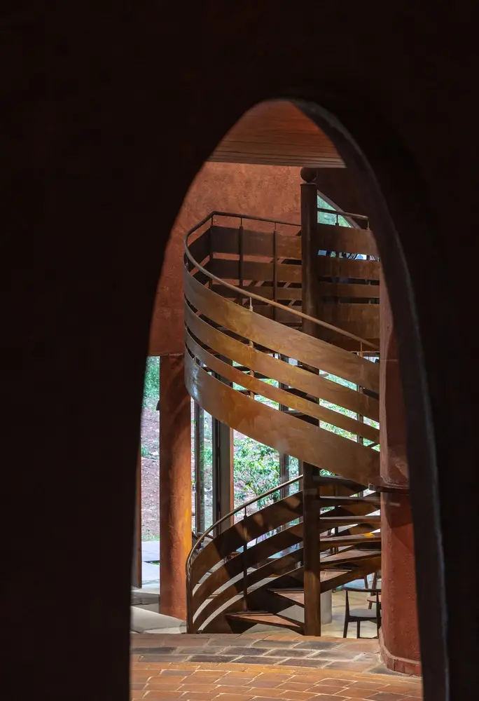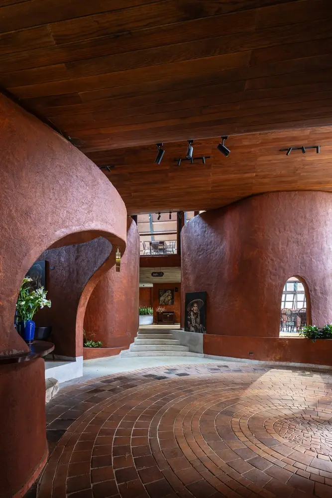 Tính vật chất củng cố sự tương tác này với không gian. Những bức tường xây bằng gạch trát vữa màu đỏ sẫm gợi lên màu đất bazan của vùng, trong khi trần bê tông giữ lại dấu ấn của ván khuôn gỗ thông. Sàn nhà thể hiện sự phân cấp không gian: gạch nung tỏa ra từ sảnh trung tâm, các lối đi kết nối sử dụng đá terrazzo, và các khu vực phụ được ốp bằng đá tự nhiên không đều. Những biến thể về xúc giác này mời gọi sự tương tác vượt ra ngoài thị giác, kích hoạt nhiều giác quan.