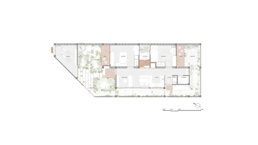 1. Kiến trúc thích ứng – Ngôi nhà được thiết kế để thích ứng với vi khí hậu địa phương đồng thời hỗ trợ khả năng tự cung tự cấp một phần lương thực thông qua việc tích hợp vườn rau và cây ăn quả như những yếu tố cảnh quan quan trọng. Bên cạnh việc đáp ứng các nhu cầu thiết yếu của chủ nhà, dự án còn hướng đến việc thúc đẩy lối sống sinh thái, chậm rãi cho gia đình.