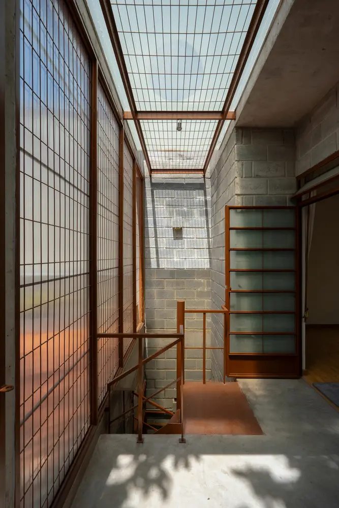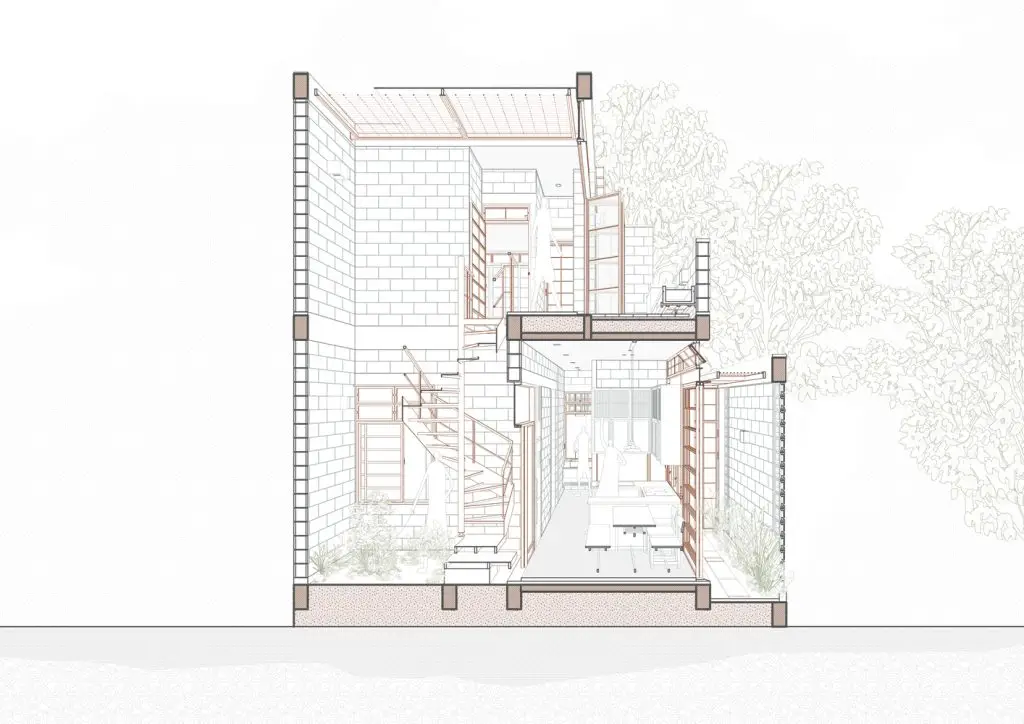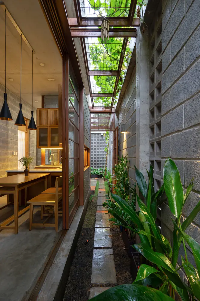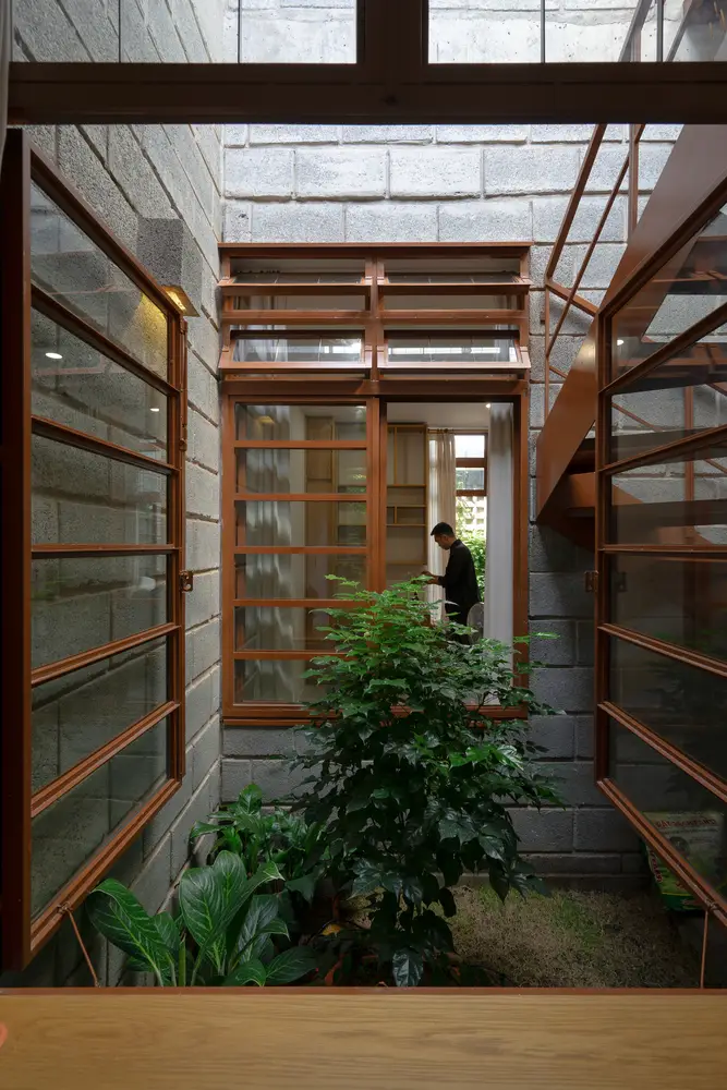 2. Không gian trong-giữa-ngoài – Ngôi nhà tích hợp nhiều không gian đệm, chẳng hạn như hiên nhà, sân trong và hành lang, để tạo ra sự chuyển tiếp liền mạch giữa kiến trúc và thiên nhiên, không gian nội thất và ngoại thất. Thiết kế này cải thiện sự lưu thông không khí và làm dịu ánh sáng tự nhiên, đồng thời đóng vai trò là khu vực đa chức năng kết nối cư dân với môi trường, vẫn đảm bảo sự riêng tư và an ninh.