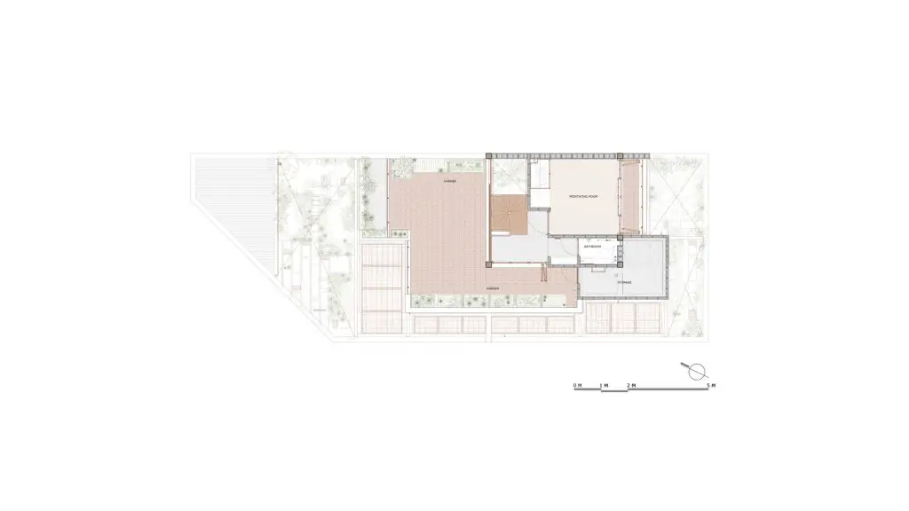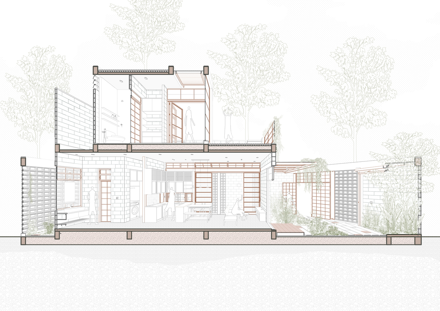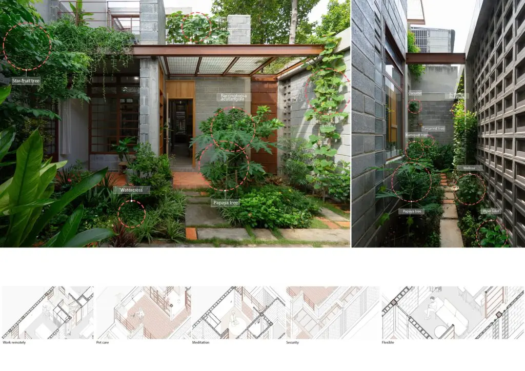 1. Kiến trúc thích ứng – Ngôi nhà được thiết kế để thích ứng với vi khí hậu địa phương đồng thời hỗ trợ khả năng tự cung tự cấp một phần lương thực thông qua việc tích hợp vườn rau và cây ăn quả như những yếu tố cảnh quan quan trọng. Bên cạnh việc đáp ứng các nhu cầu thiết yếu của chủ nhà, dự án còn hướng đến việc thúc đẩy lối sống sinh thái, chậm rãi cho gia đình.