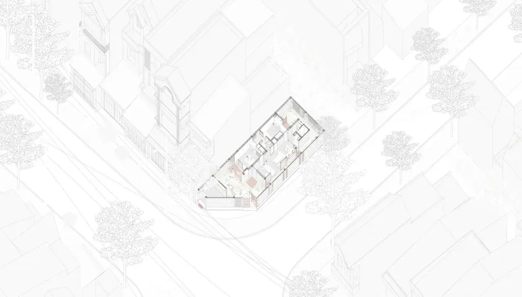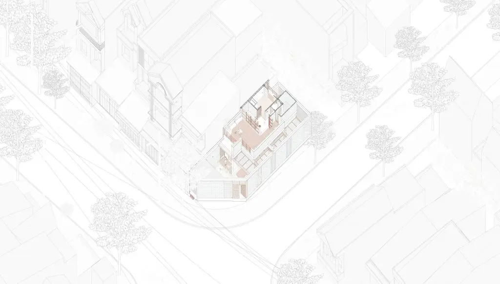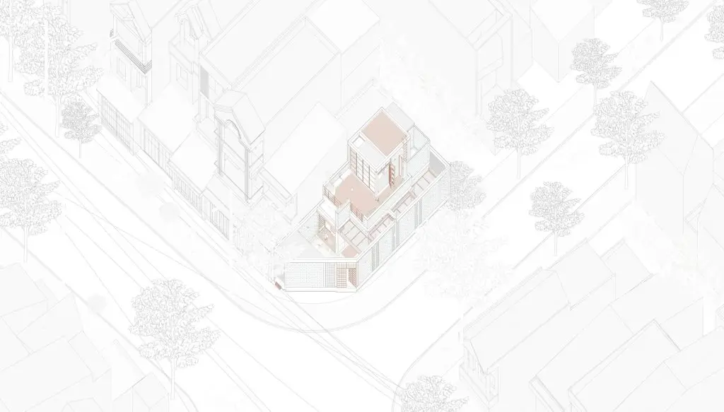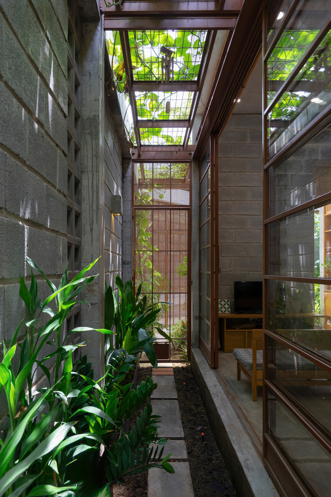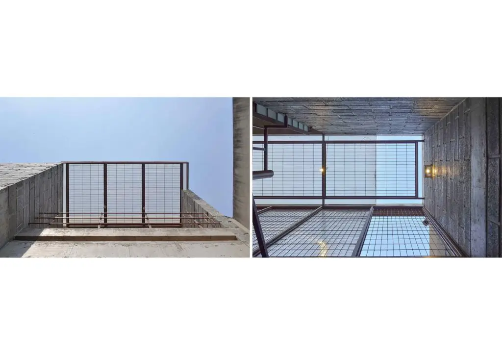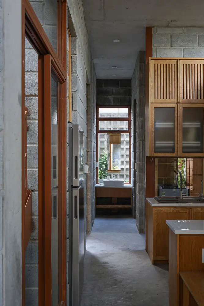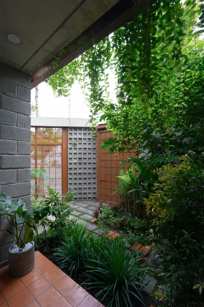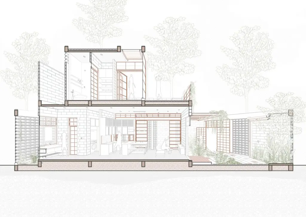 2. Không gian trong-giữa-ngoài – Ngôi nhà tích hợp nhiều không gian đệm, chẳng hạn như hiên nhà, sân trong và hành lang, để tạo ra sự chuyển tiếp liền mạch giữa kiến trúc và thiên nhiên, không gian nội thất và ngoại thất. Thiết kế này cải thiện sự lưu thông không khí và làm dịu ánh sáng tự nhiên, đồng thời đóng vai trò là khu vực đa chức năng kết nối cư dân với môi trường, vẫn đảm bảo sự riêng tư và an ninh.
