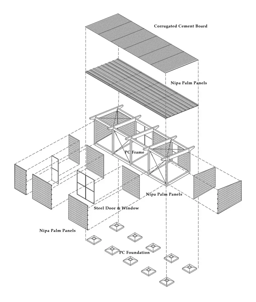 Ý tưởng của nguyên mẫu thứ hai là kết hợp các thành phần mô-đun và chiến lược tự làm (DIY). Việc chế tạo sẵn giúp kiểm soát chất lượng và chi phí, cũng như sản xuất hàng loạt trong tương lai. Khung và móng bê tông đúc sẵn đảm bảo độ ổn định và độ chính xác được xác định trước. Kết cấu nhẹ cho phép móng nhỏ gọn hơn và dễ dàng vận chuyển bằng thuyền nhỏ, vì đường thủy vẫn là phương tiện giao thông chủ yếu ở Đồng bằng sông Cửu Long. Khung nhẹ với kết nối bu lông đơn giản cũng khuyến khích người dân tham gia xây dựng. Tất cả vật liệu hoàn thiện có nguồn gốc địa phương đều có thể được người dân và hàng xóm lắp ráp và thay thế dễ dàng cho việc thay đổi hoặc mở rộng trong tương lai.