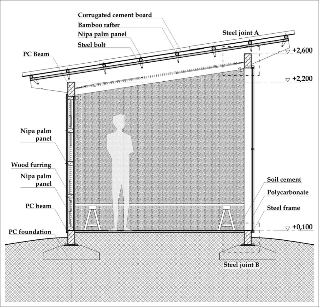 Để ứng phó với thời tiết khắc nghiệt của vùng, dự án áp dụng các chiến lược thiết kế thụ động. Dừa nước và xi măng sóng được kết hợp để tạo thành “mái kép”, giúp che chắn người dân khỏi mưa lớn mà vẫn đảm bảo đủ tiện nghi nhiệt. Tấm polycarbonate cho phép ánh sáng tự nhiên đi vào và giảm nhu cầu chiếu sáng nhân tạo, trong khi khoảng hở giữa mái và tường giúp tăng cường thông gió tự nhiên. Vì dừa nước gần như không tốn kém ở Đồng bằng sông Cửu Long, nó không chỉ là vật liệu quen thuộc với người dân địa phương mà còn hài hòa với cảnh quan xung quanh.