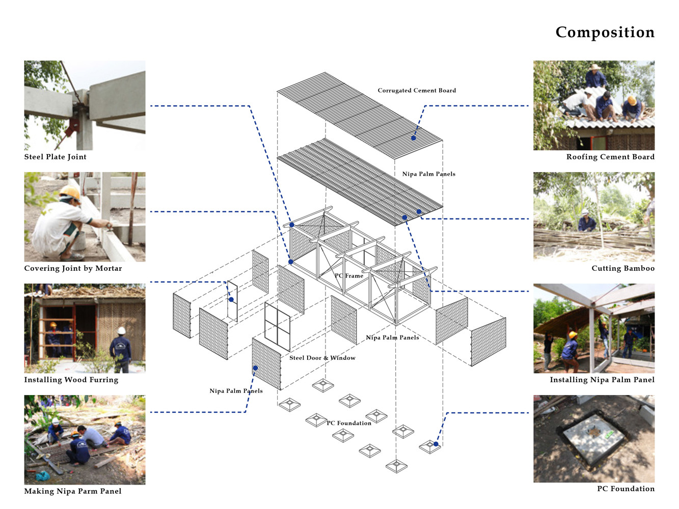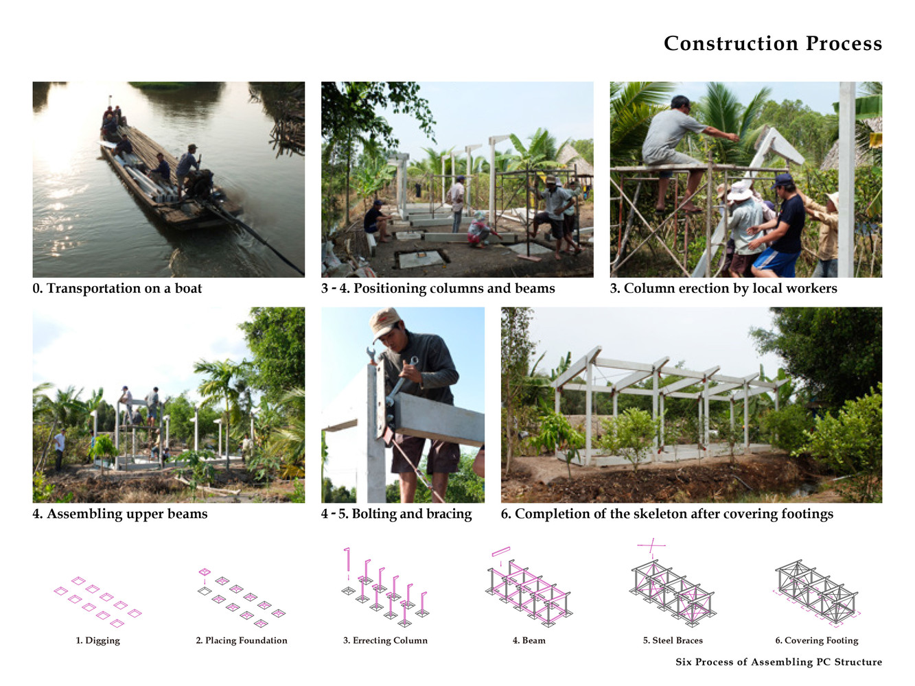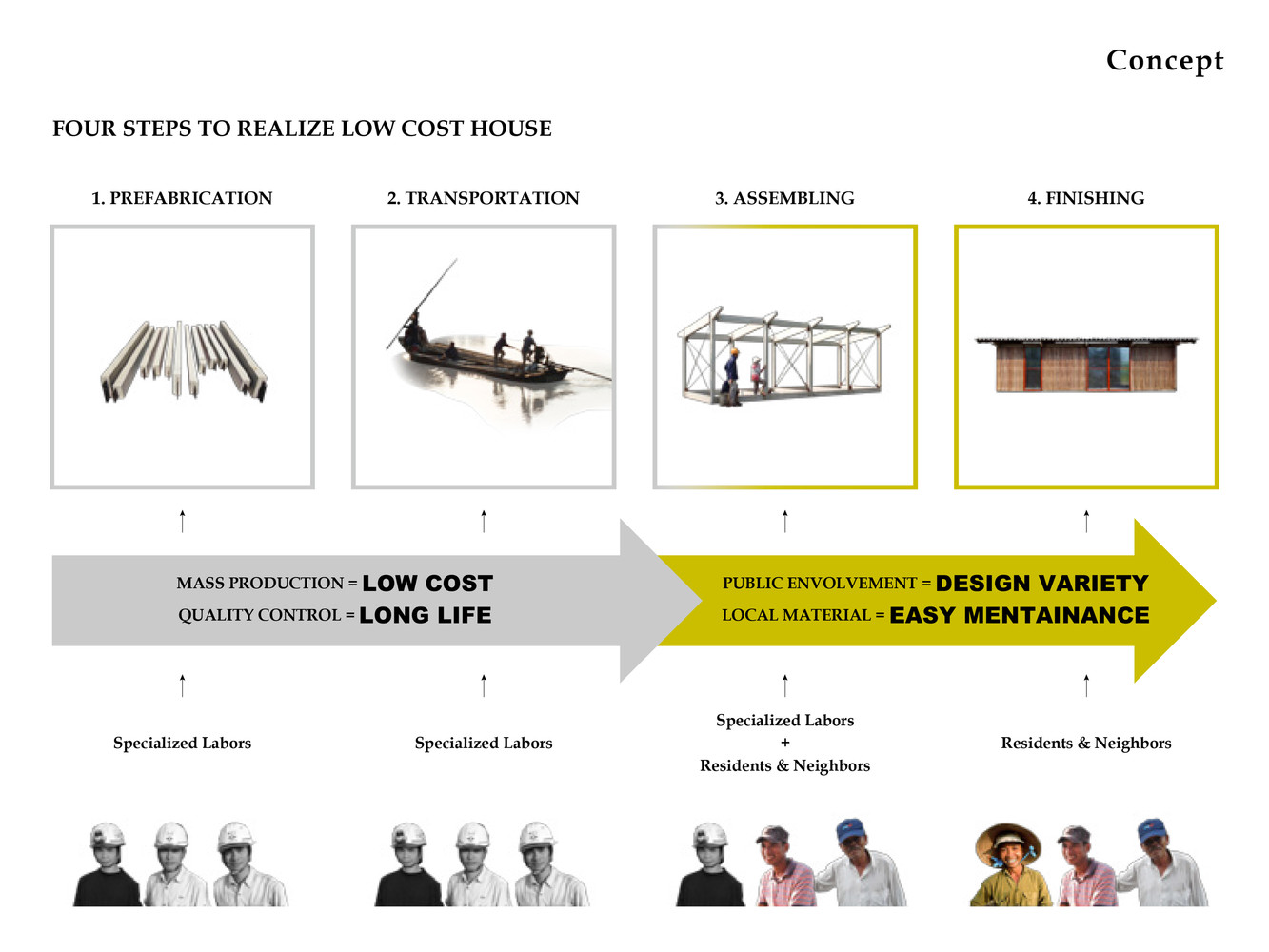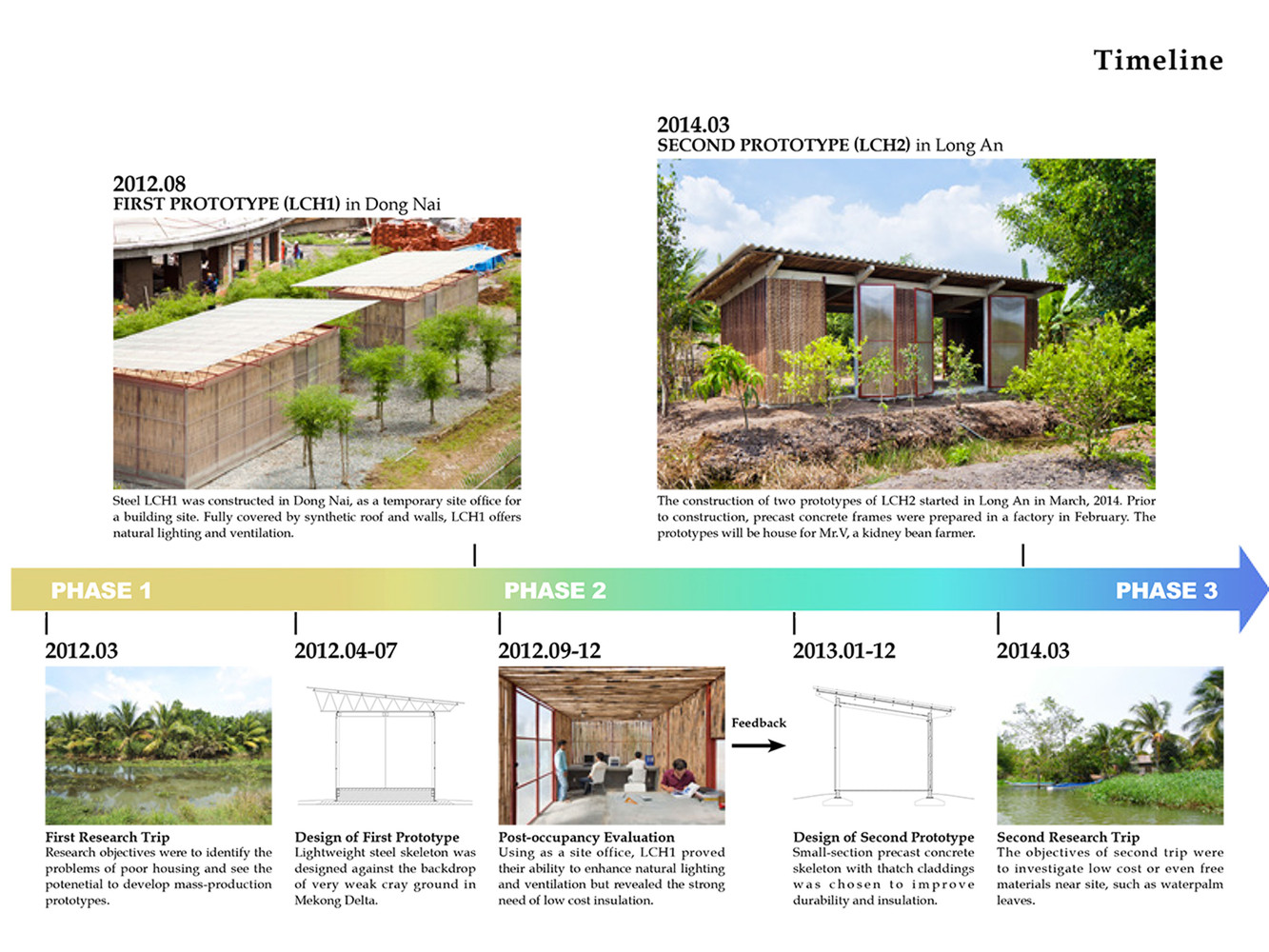 Giai đoạn đầu của dự án bắt đầu vào năm 2012 với một mẫu nhà khung thép. Từ năm 2013, nhằm hướng đến sự ổn định và thoải mái nhiệt độ cao hơn trong điều kiện khí hậu nhiệt đới, một mẫu nhà khung bê tông đúc sẵn mới đã được thiết kế và hai ngôi nhà đã được xây dựng tại tỉnh Long An.