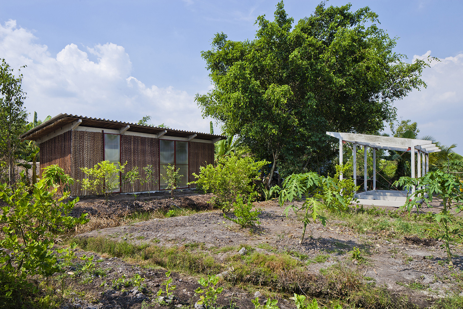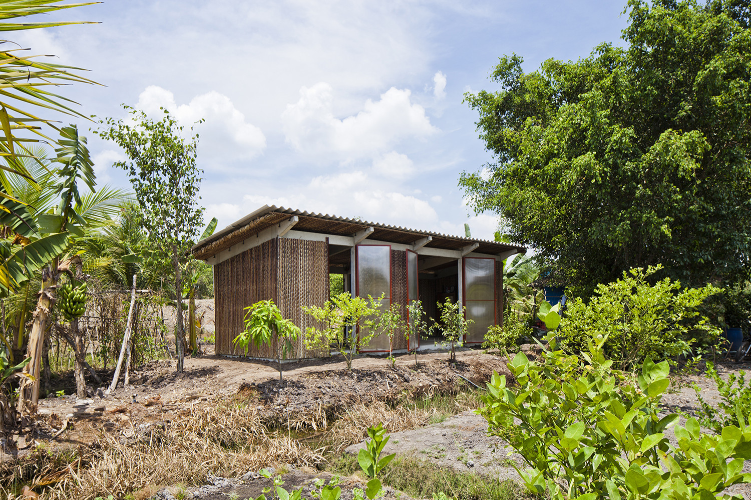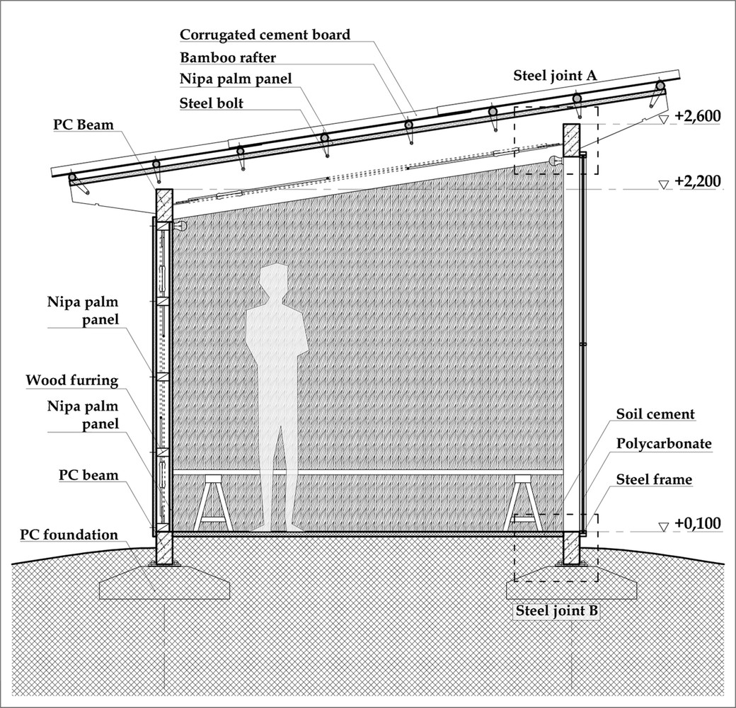 Để ứng phó với thời tiết khắc nghiệt của vùng, dự án áp dụng các chiến lược thiết kế thụ động. Dừa nước và xi măng sóng được kết hợp để tạo thành “mái kép”, giúp che chắn người dân khỏi mưa lớn mà vẫn đảm bảo đủ tiện nghi nhiệt. Tấm polycarbonate cho phép ánh sáng tự nhiên đi vào và giảm nhu cầu chiếu sáng nhân tạo, trong khi khoảng hở giữa mái và tường giúp tăng cường thông gió tự nhiên. Vì dừa nước gần như không tốn kém ở Đồng bằng sông Cửu Long, nó không chỉ là vật liệu quen thuộc với người dân địa phương mà còn hài hòa với cảnh quan xung quanh.