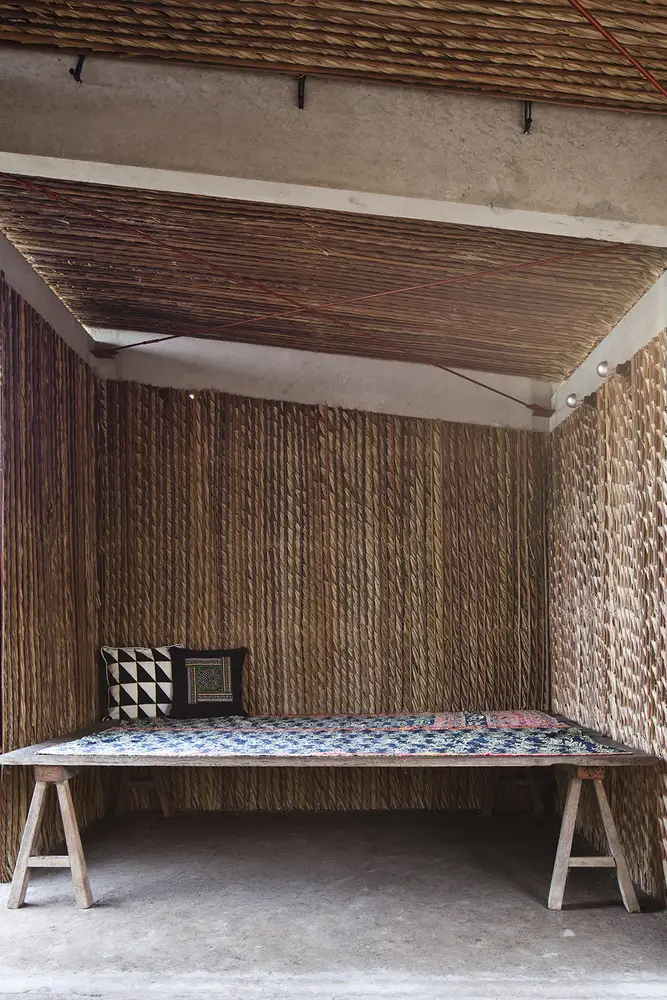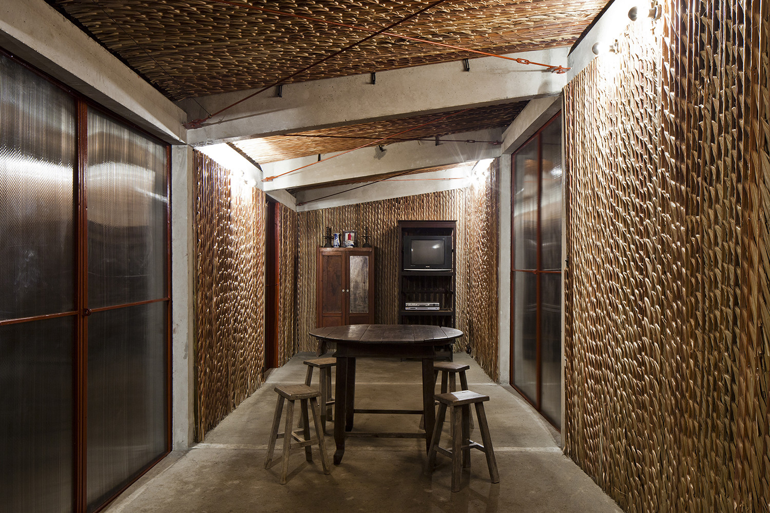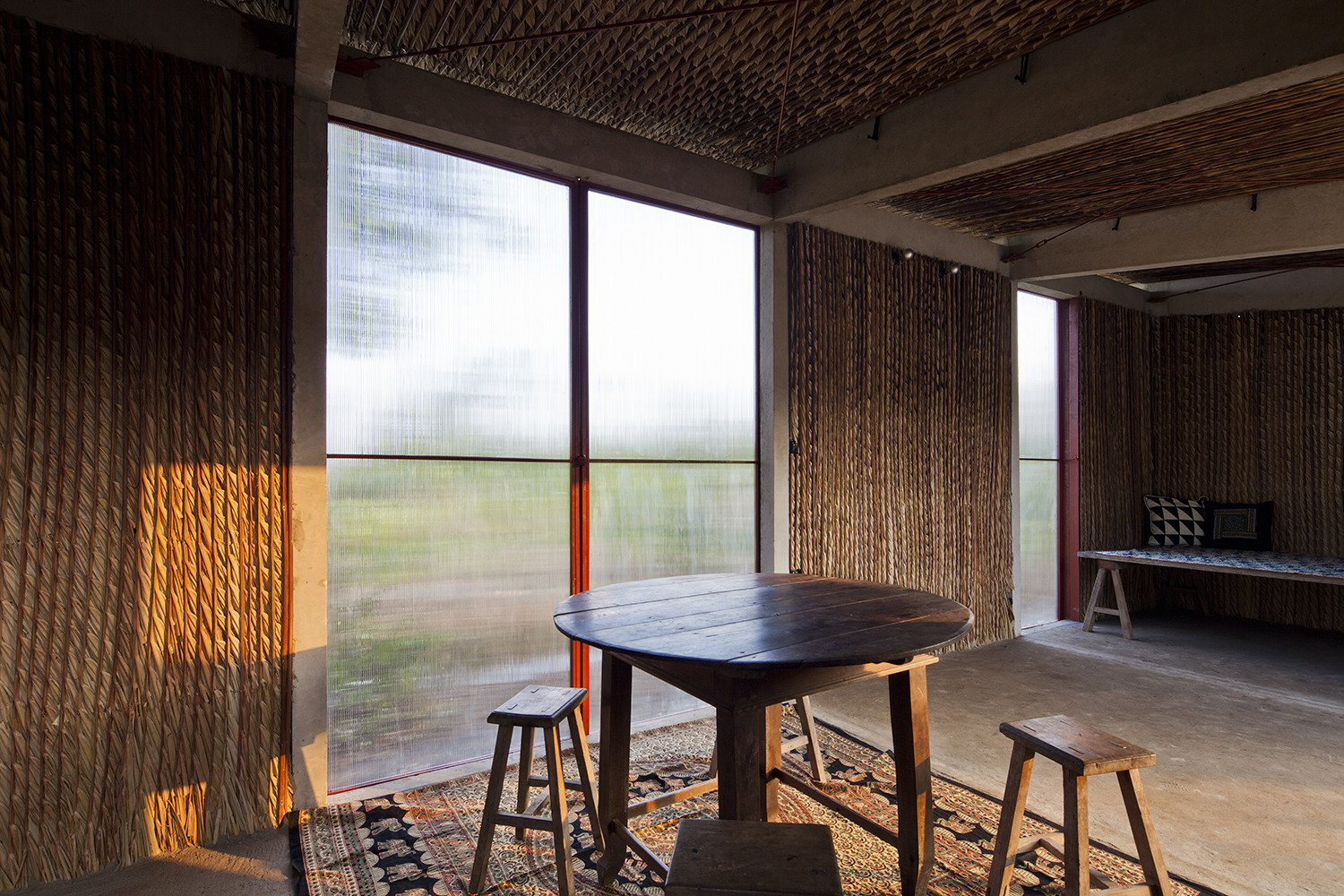 Để ứng phó với thời tiết khắc nghiệt của vùng, dự án áp dụng các chiến lược thiết kế thụ động. Dừa nước và xi măng sóng được kết hợp để tạo thành “mái kép”, giúp che chắn người dân khỏi mưa lớn mà vẫn đảm bảo đủ tiện nghi nhiệt. Tấm polycarbonate cho phép ánh sáng tự nhiên đi vào và giảm nhu cầu chiếu sáng nhân tạo, trong khi khoảng hở giữa mái và tường giúp tăng cường thông gió tự nhiên. Vì dừa nước gần như không tốn kém ở Đồng bằng sông Cửu Long, nó không chỉ là vật liệu quen thuộc với người dân địa phương mà còn hài hòa với cảnh quan xung quanh.