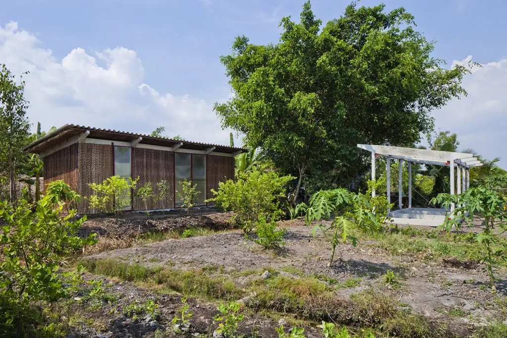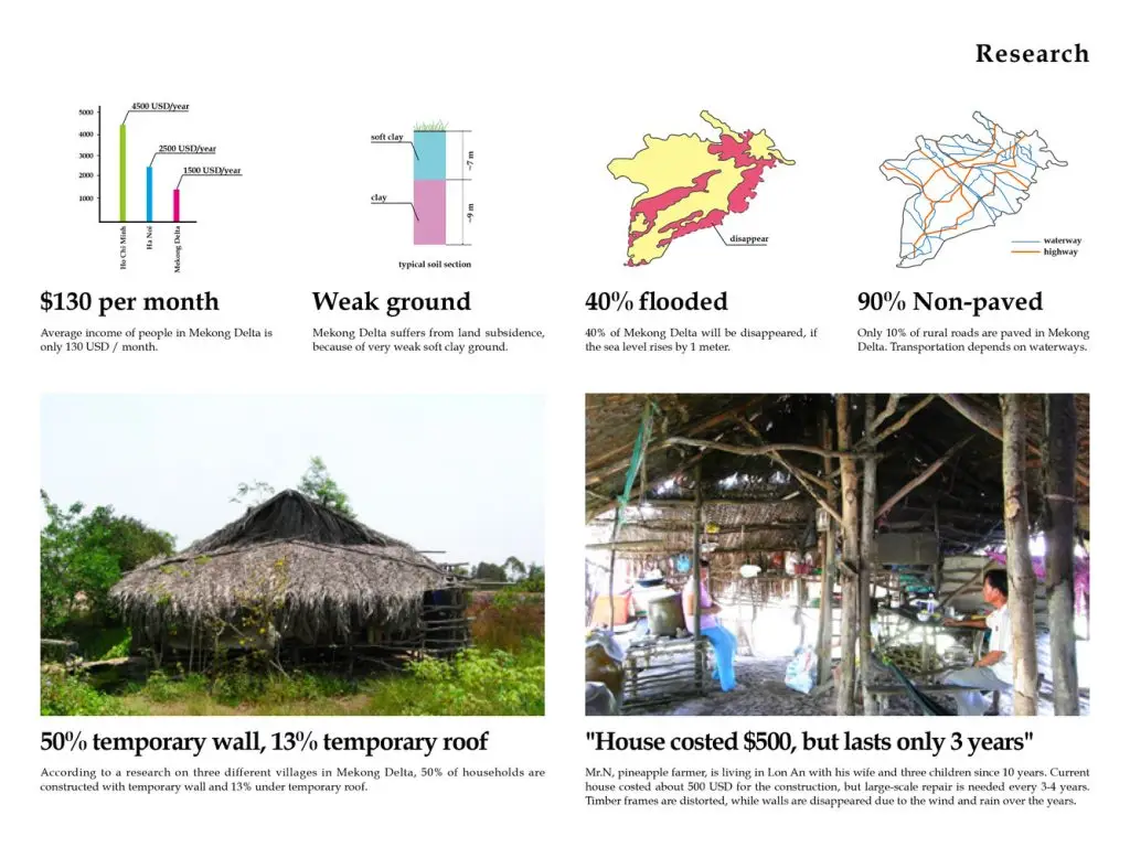 Mô tả văn bản do các kiến trúc sư cung cấp. Người dân Đồng bằng sông Cửu Long, với thu nhập trung bình dưới 100 đô la Mỹ mỗi tháng, chủ yếu sống trong những căn nhà tạm bợ giá rẻ. Trớ trêu thay, kết cấu kém chất lượng lại dẫn đến chi phí bảo trì cao. Do đó, nhà ở giá rẻ nhưng bền vững đang là một vấn đề xã hội cấp bách tại đây. Trước tình hình đó, mục tiêu của dự án “nhà S” là cung cấp những ngôi nhà kiên cố nhưng nhẹ, bền vững nhưng giá cả phải chăng với ngân sách 4.000 đô la Mỹ mỗi căn (30m2).