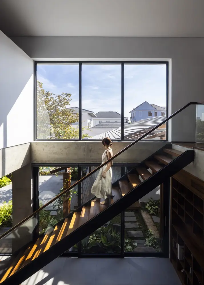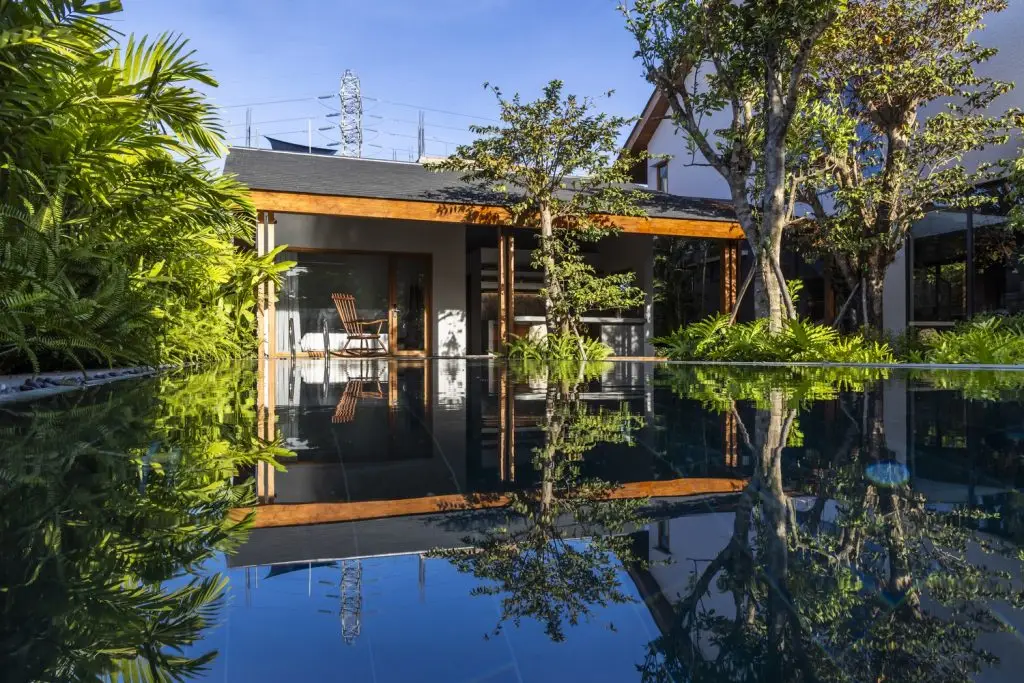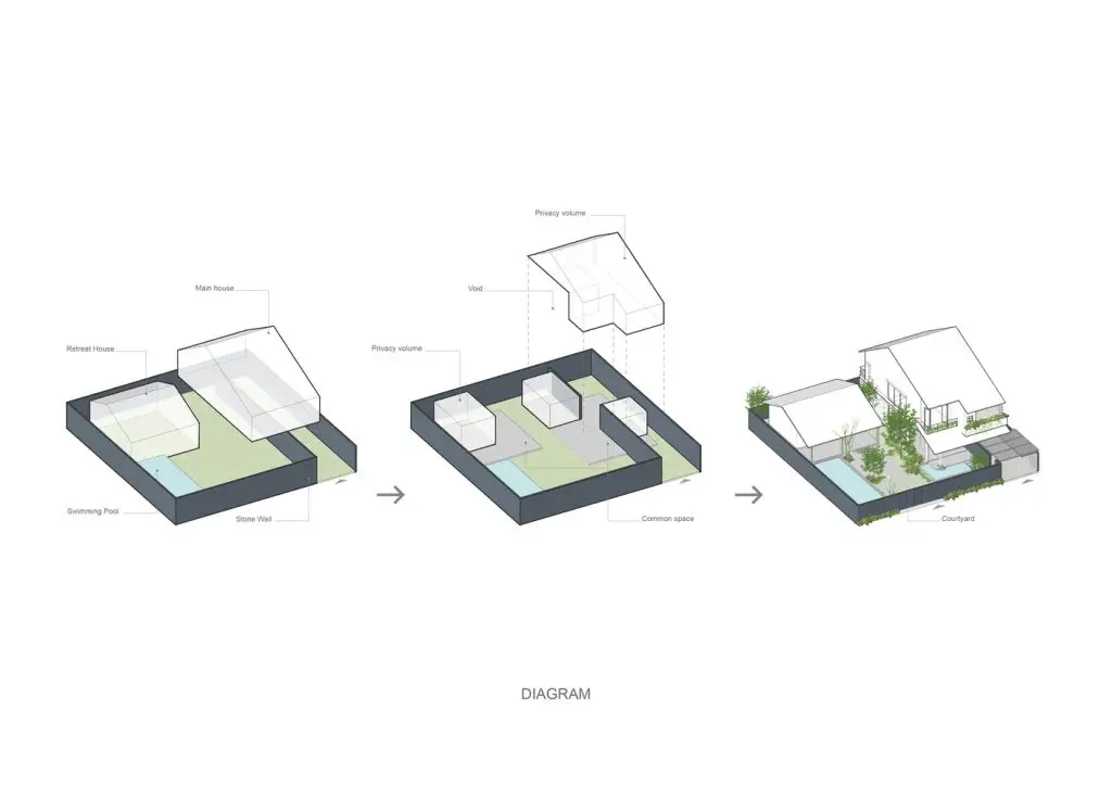 Trong ngôi nhà chính, phòng khách, bếp và khu vực đọc sách ở tầng 1 tạo thành không gian mở hình chữ Z, kết nối sân trước và sân sau, tạo sự thông thoáng và đón những làn gió mát từ hướng Đông Nam. Tầng 2 riêng tư và ấm cúng hơn, bao gồm phòng ngủ chính, một phòng ngủ nhỏ, phòng thờ và một không gian làm việc linh hoạt có thể đóng mở. Tầng 2 và tầng 1 được kết nối bởi một khoảng trống lớn ở trung tâm ngôi nhà, kết nối tầm nhìn và sự thông gió tự nhiên. Nhà nghỉ dưỡng bao gồm 2 phòng ngủ dành cho khách và một nhà bếp ngoài trời cạnh một hiên lớn nối thẳng ra hồ bơi và khu vườn.