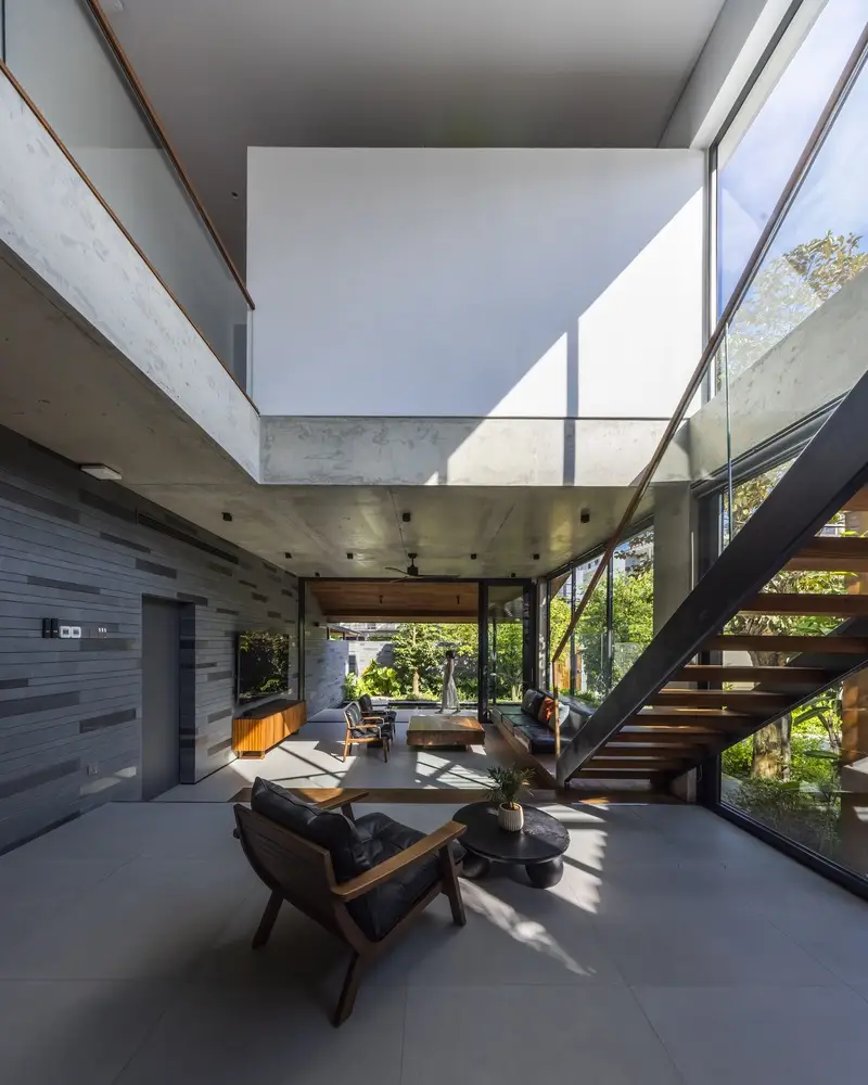 Các vật liệu tự nhiên được lựa chọn kỹ lưỡng và chế tác thủ công khéo léo, bao gồm: tường đá sa thạch, sàn đá bazan và gỗ tếch cho sàn nhà, cửa ra vào và đồ nội thất. Sự kết hợp hài hòa giữa trần bê tông thô và các vật liệu tự nhiên mang đến cảm giác nguyên bản của thiên nhiên, tạo nên sự yên tĩnh và thư thái. Trong ngôi nhà này, mục tiêu thiết kế là tạo không gian mở trong khu vực sinh hoạt, làm mới các yếu tố kiến ​​trúc nhiệt đới bản địa và tìm lại tinh thần nhà ở truyền thống Việt Nam hài hòa với thiên nhiên.