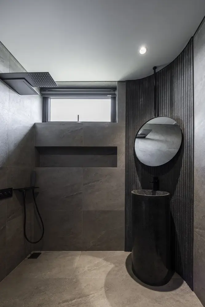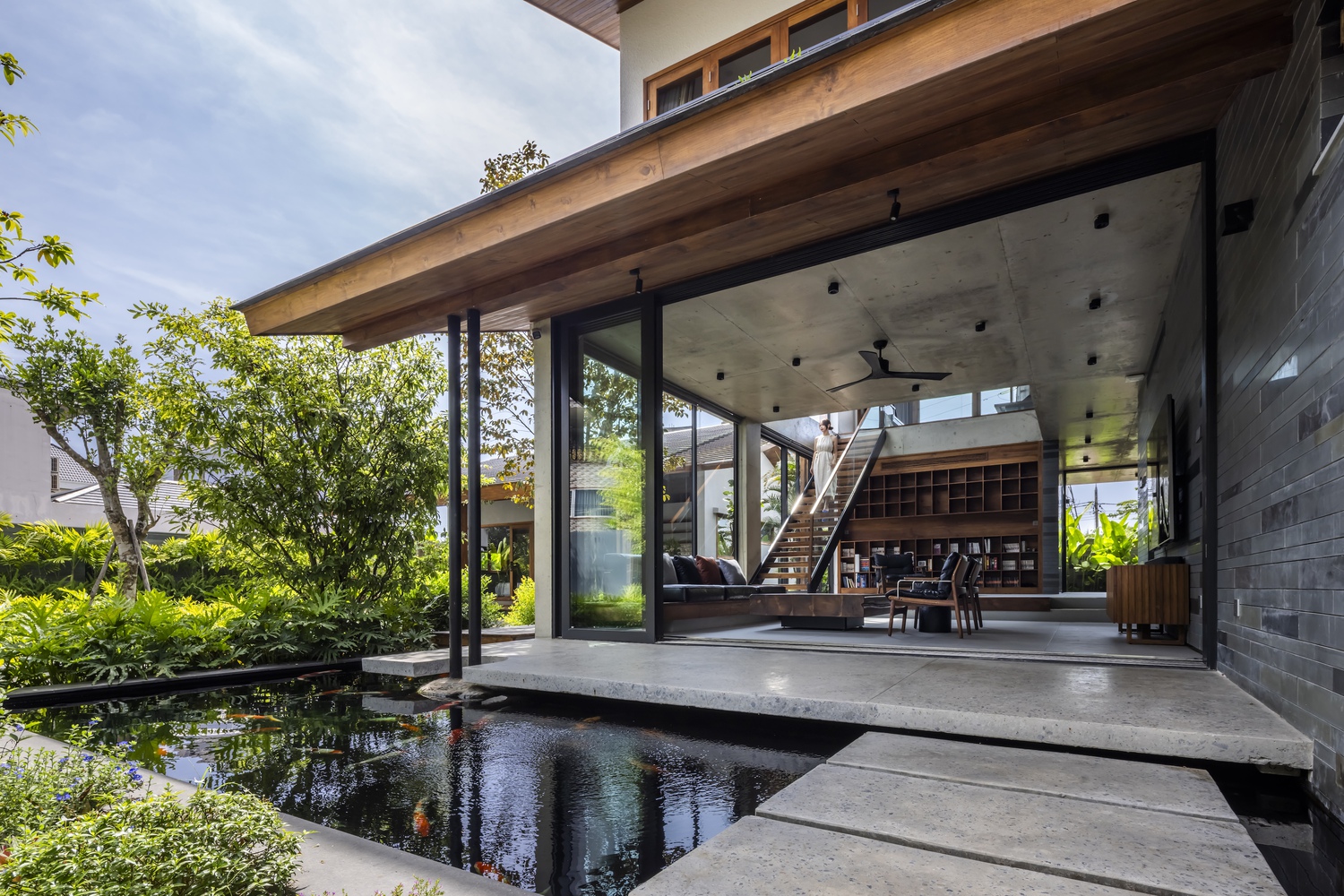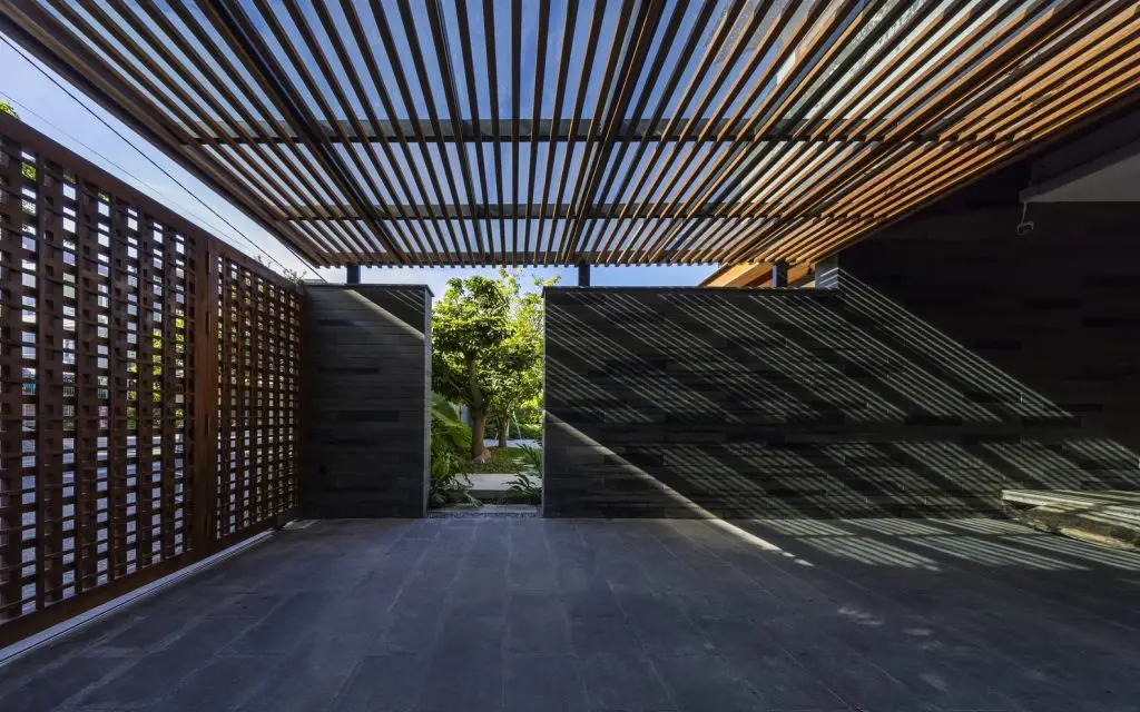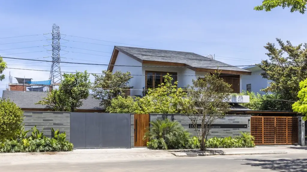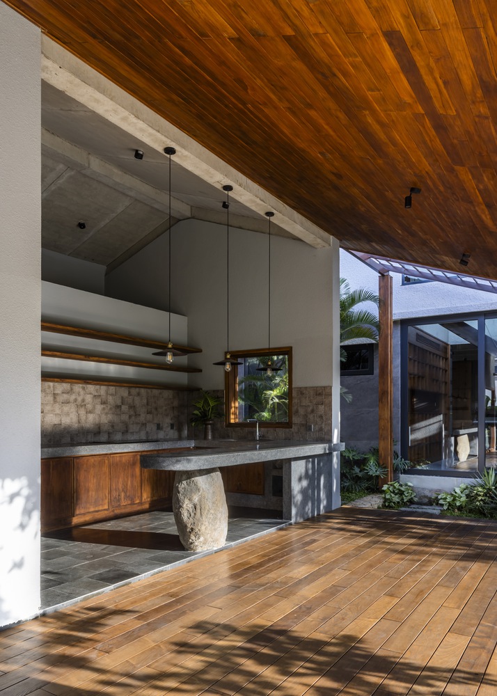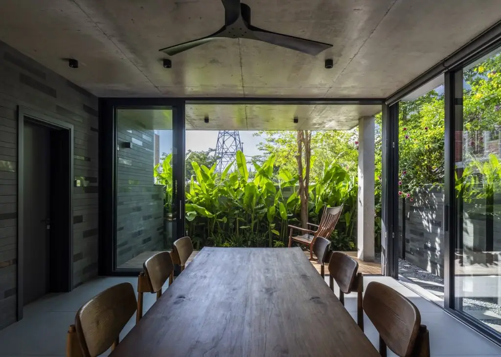 Các vật liệu tự nhiên được lựa chọn kỹ lưỡng và chế tác thủ công khéo léo, bao gồm: tường đá sa thạch, sàn đá bazan và gỗ tếch cho sàn nhà, cửa ra vào và đồ nội thất. Sự kết hợp hài hòa giữa trần bê tông thô và các vật liệu tự nhiên mang đến cảm giác nguyên bản của thiên nhiên, tạo nên sự yên tĩnh và thư thái. Trong ngôi nhà này, mục tiêu thiết kế là tạo không gian mở trong khu vực sinh hoạt, làm mới các yếu tố kiến ​​trúc nhiệt đới bản địa và tìm lại tinh thần nhà ở truyền thống Việt Nam hài hòa với thiên nhiên.