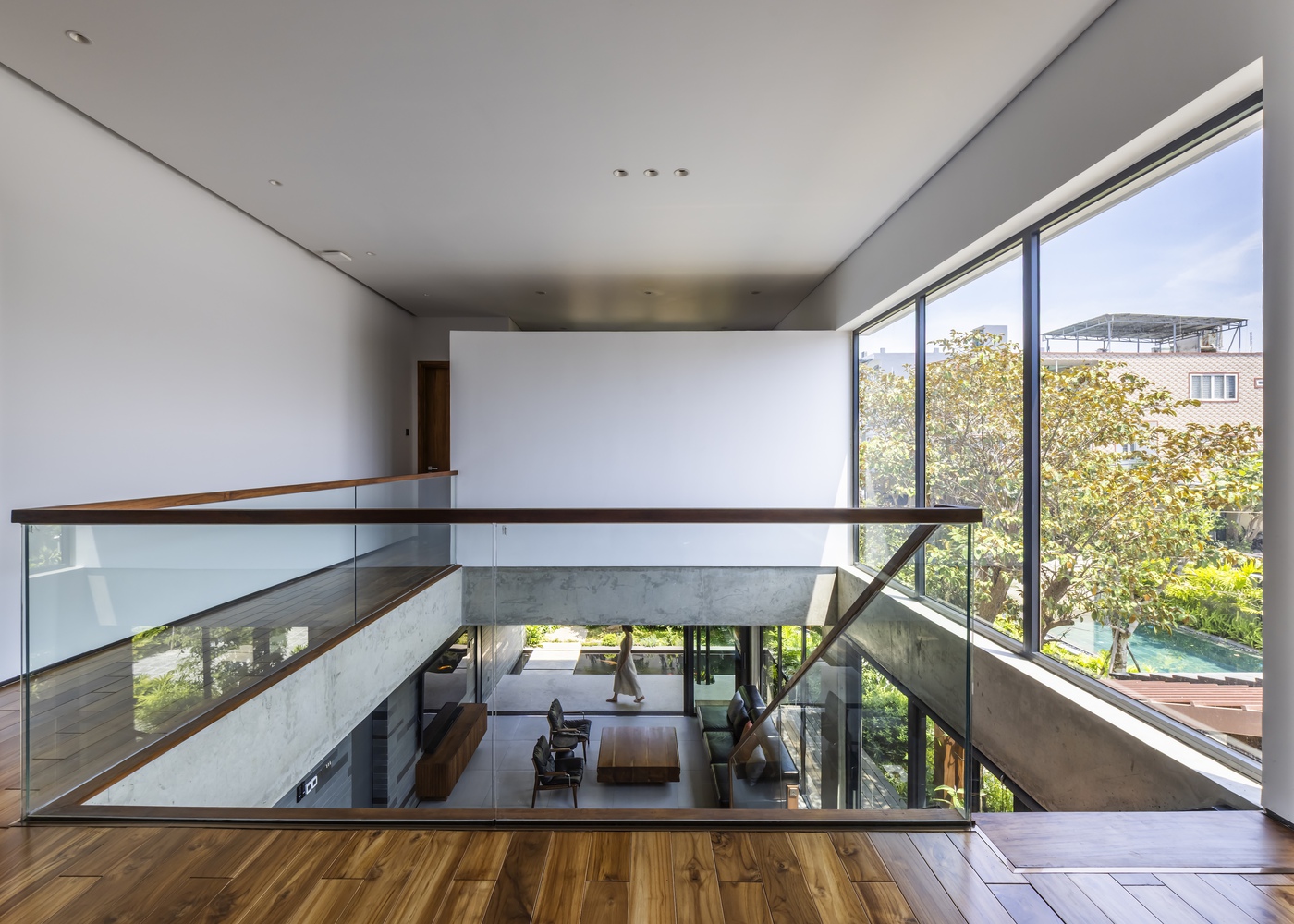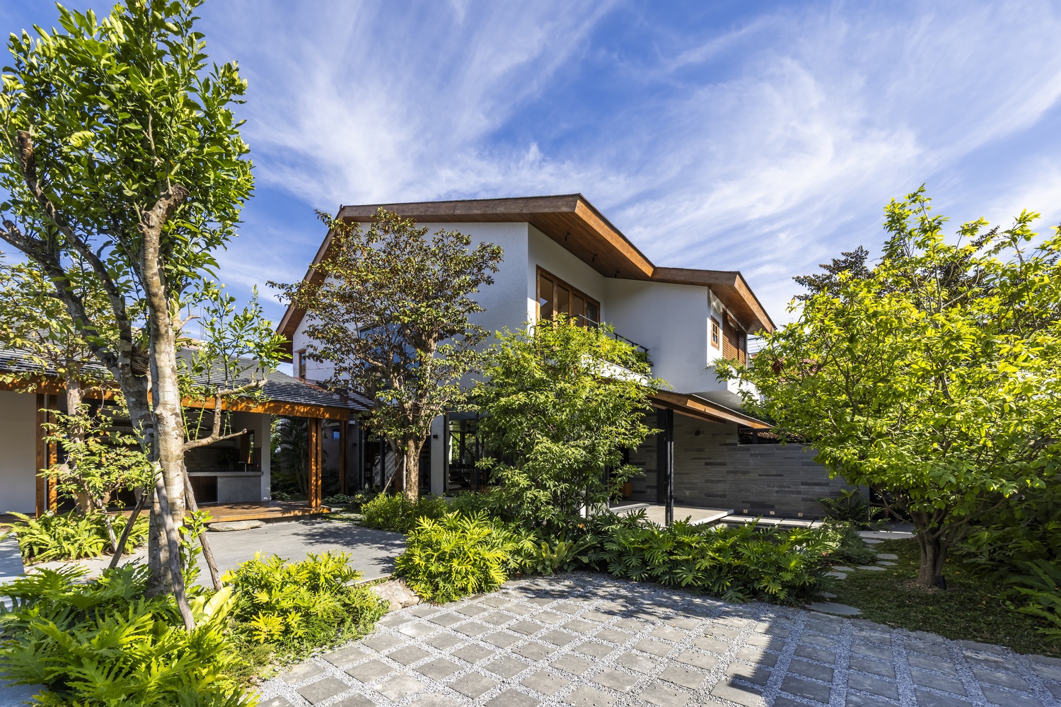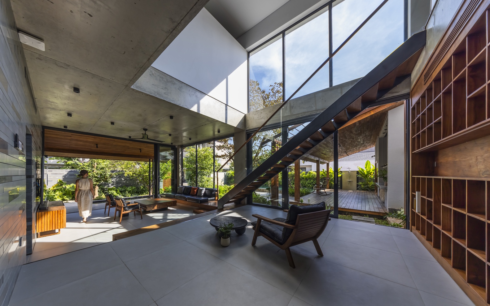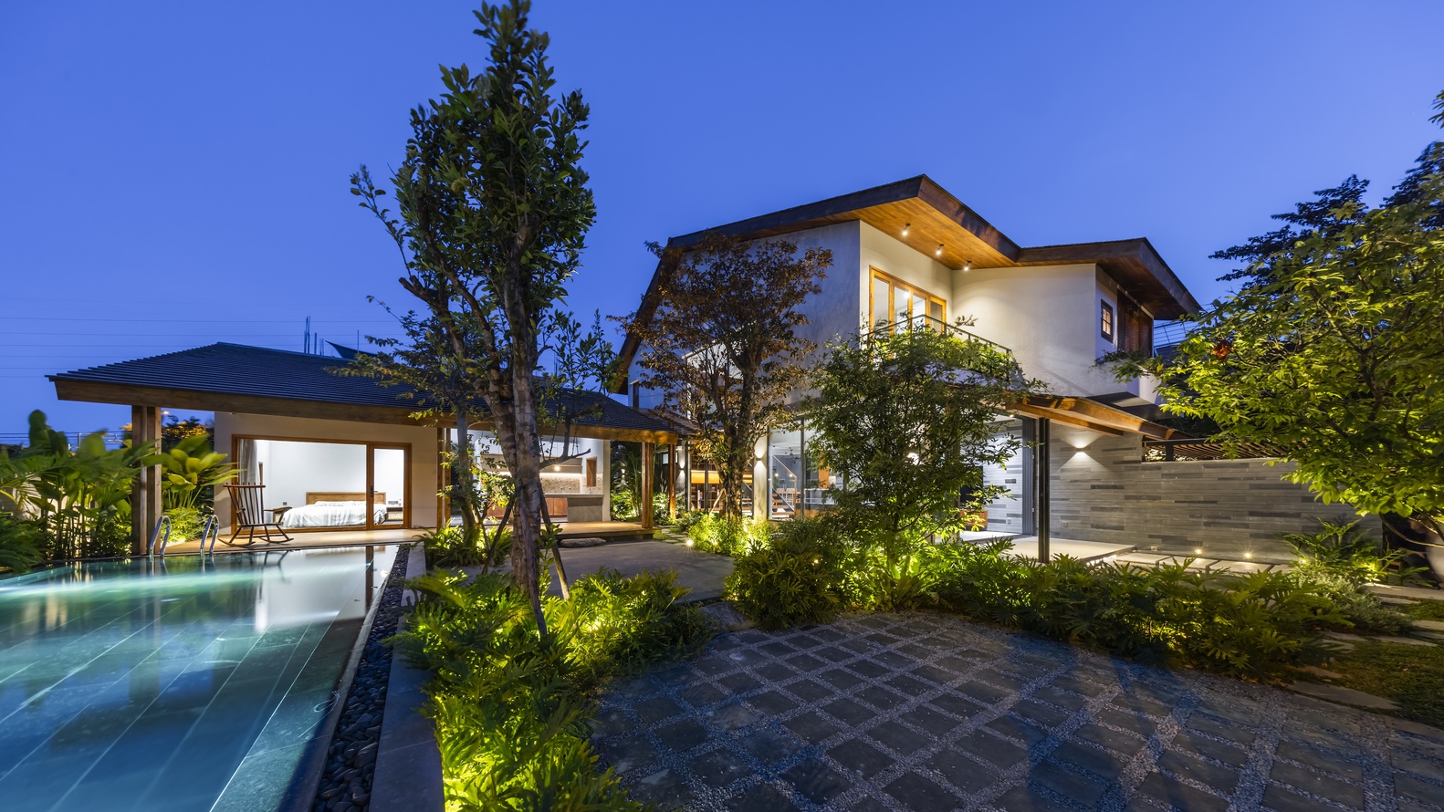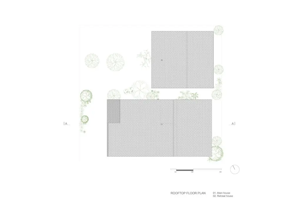 Trong ngôi nhà chính, phòng khách, bếp và khu vực đọc sách ở tầng 1 tạo thành không gian mở hình chữ Z, kết nối sân trước và sân sau, tạo sự thông thoáng và đón những làn gió mát từ hướng Đông Nam. Tầng 2 riêng tư và ấm cúng hơn, bao gồm phòng ngủ chính, một phòng ngủ nhỏ, phòng thờ và một không gian làm việc linh hoạt có thể đóng mở. Tầng 2 và tầng 1 được kết nối bởi một khoảng trống lớn ở trung tâm ngôi nhà, kết nối tầm nhìn và sự thông gió tự nhiên. Nhà nghỉ dưỡng bao gồm 2 phòng ngủ dành cho khách và một nhà bếp ngoài trời cạnh một hiên lớn nối thẳng ra hồ bơi và khu vườn.