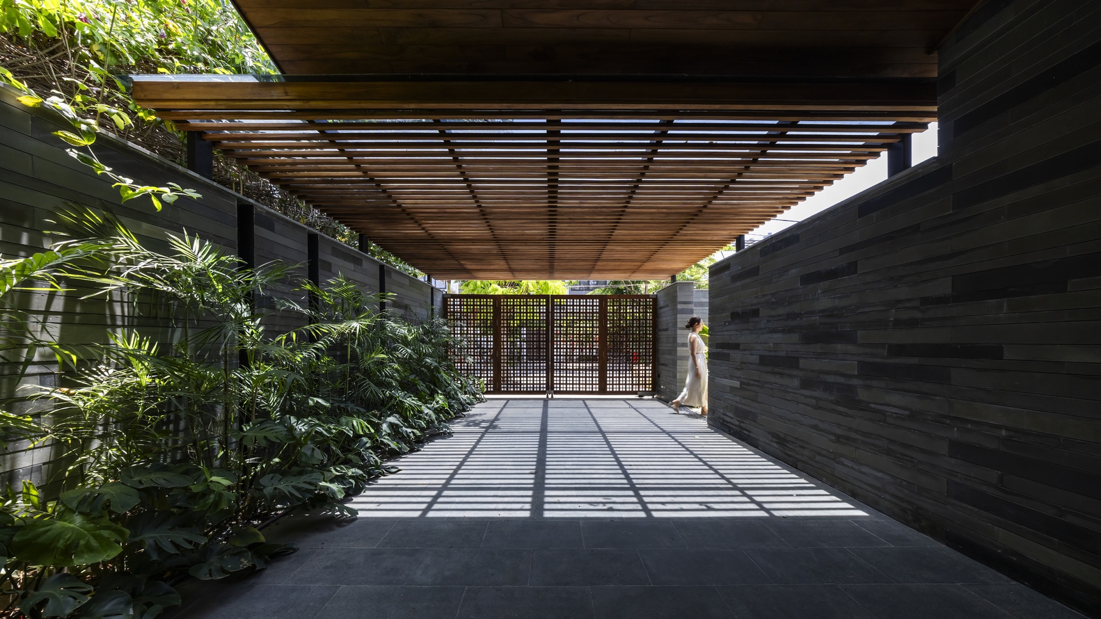 Biệt thự được bao bọc bởi một bức tường đá sa thạch hình xoắn ốc chạy dọc khắp nhà, tạo nên một mặt tiền riêng tư để chắn tầm nhìn từ bên ngoài. Các không gian được bố trí dọc theo bức tường đá sa thạch kéo dài liên tục từ không gian kín đến không gian mở, vươn tới khu vườn. Ranh giới giữa bên trong và bên ngoài trở nên mờ nhạt. Mặt tiền hướng về phía tây bắc, đón ánh nắng mặt trời gay gắt từ phía tây vào buổi chiều, vì vậy mái dốc và hiên nhà sâu giúp ngăn ánh nắng trực tiếp và mưa, tạo ra một không gian bán ngoài trời thoải mái.