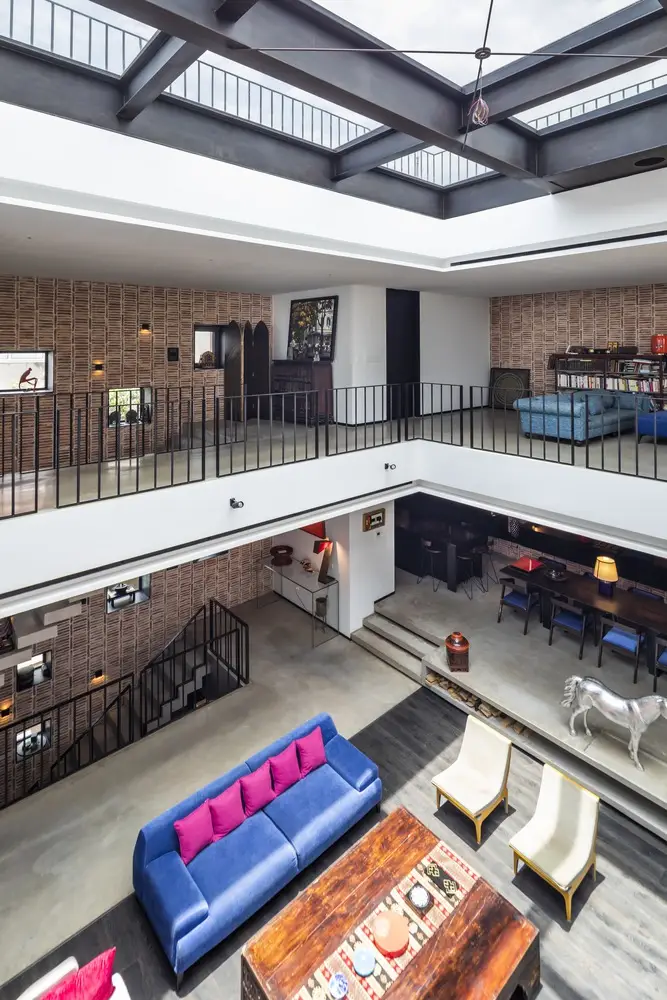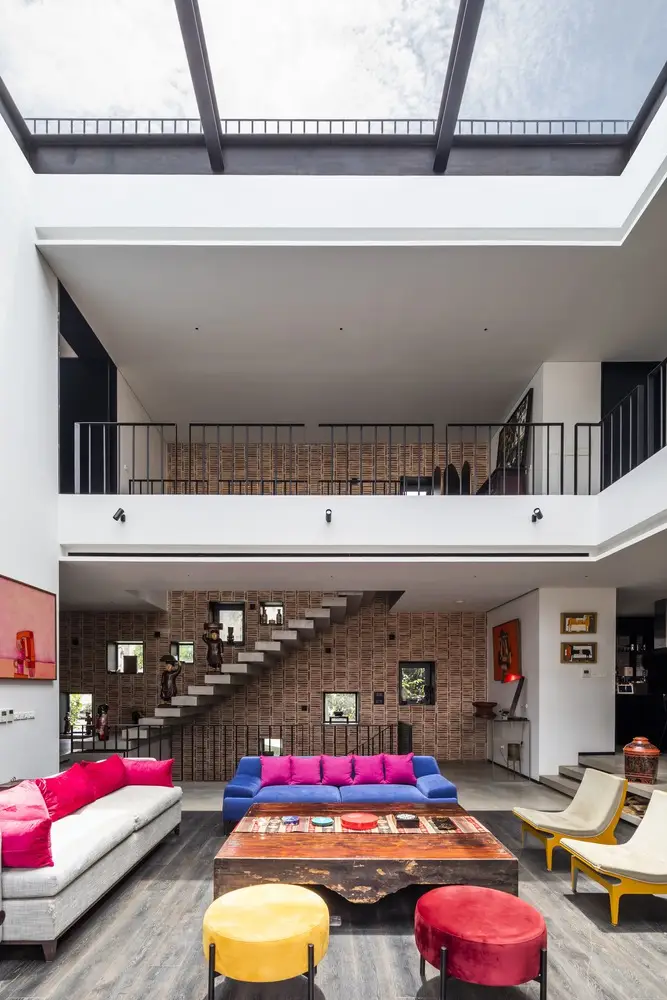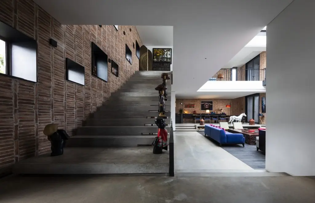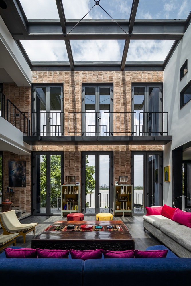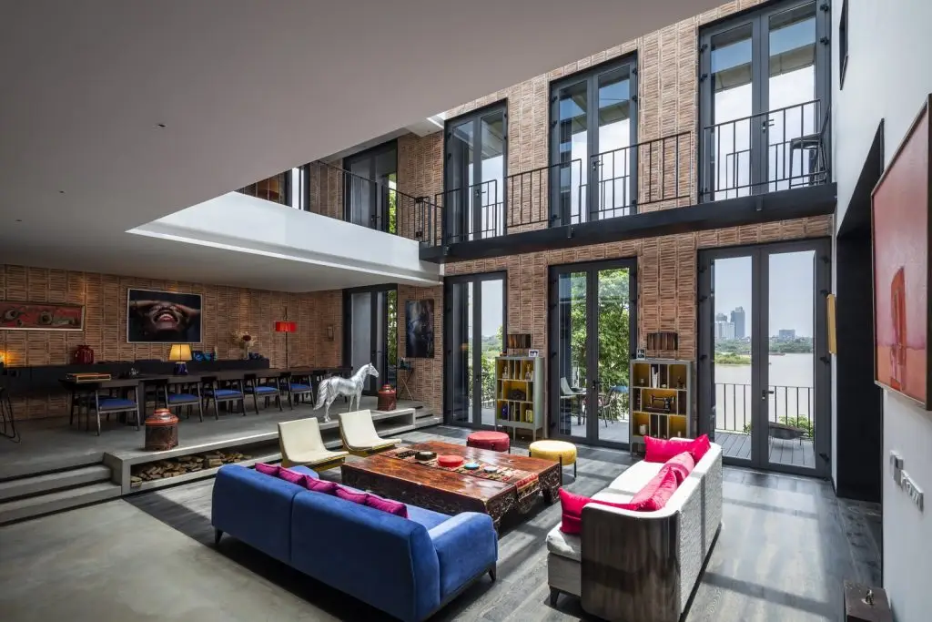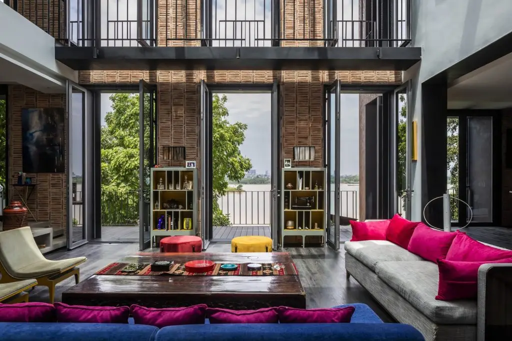 Rải rác khắp các phòng ở tầng 1 là những vật trang trí nghệ thuật. Nội thất với điểm nhấn đầy màu sắc làm cho không gian trở nên sống động và cuốn hút. Khoảng không gian trống từ tầng 1 đến tầng 2 và tầm nhìn tuyệt đẹp ra bờ sông mang lại cảm giác rộng rãi và khoáng đạt.