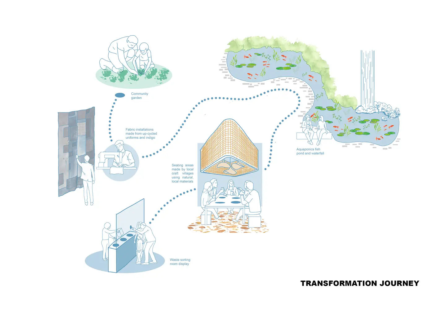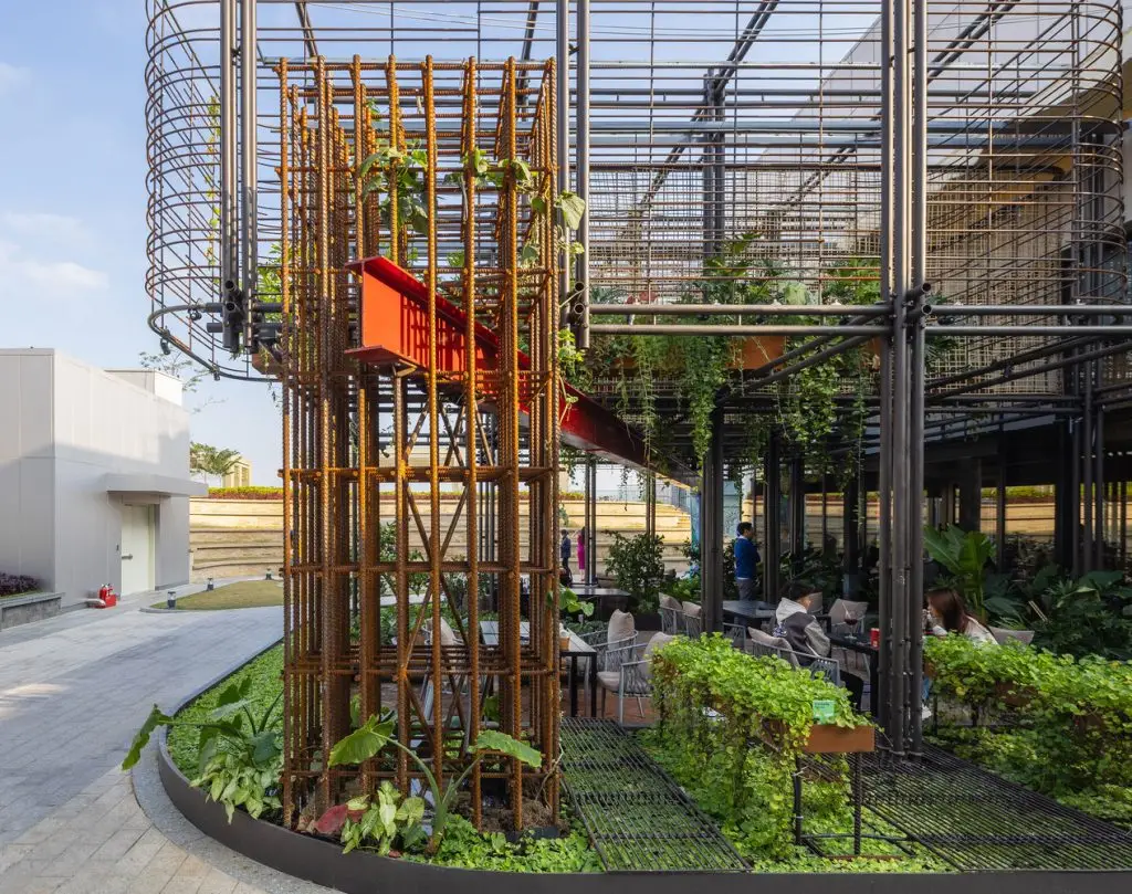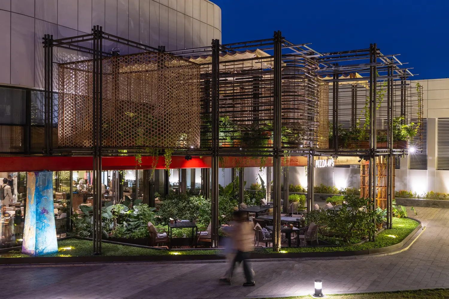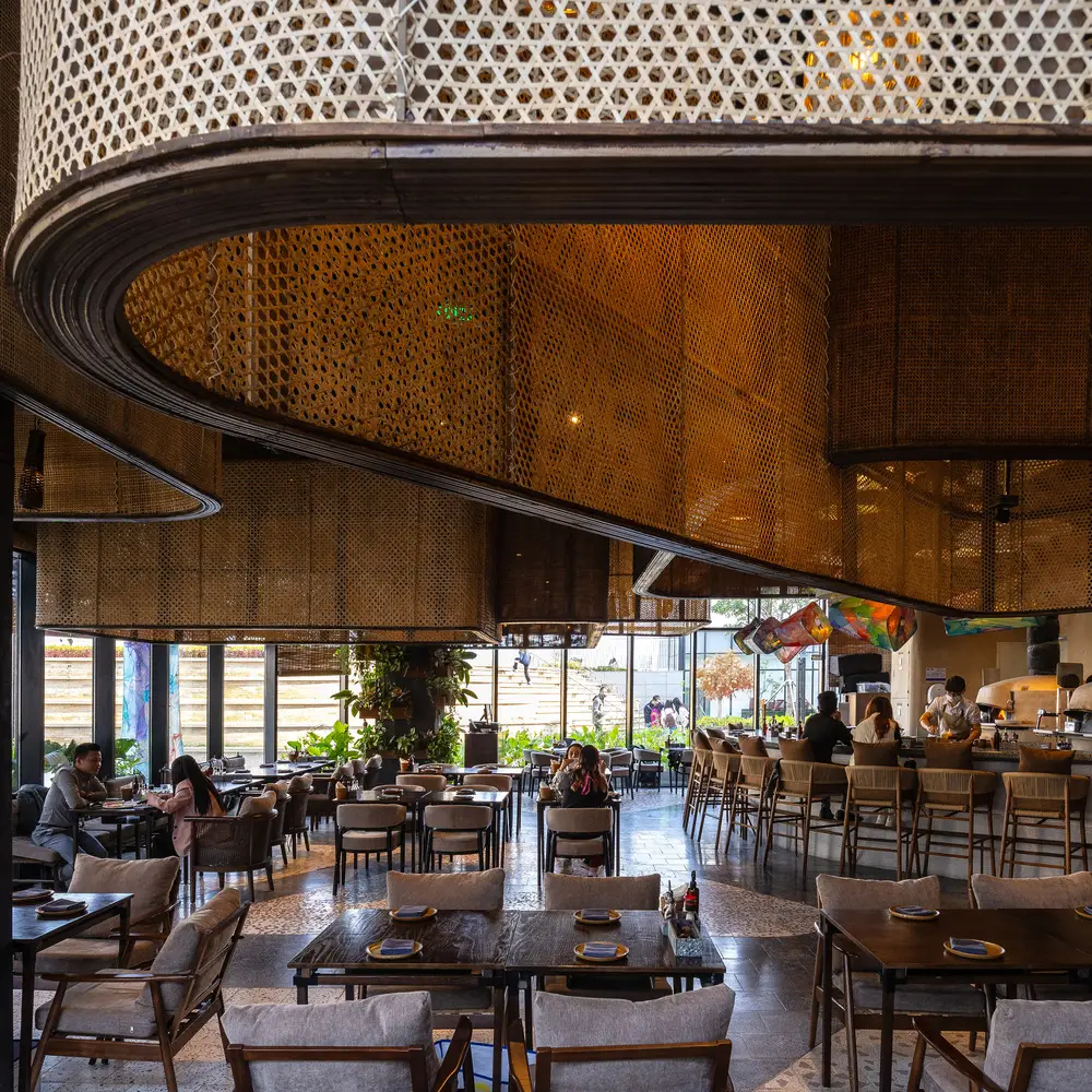 Hòa nhập với Thiên nhiên: Ranh giới không gian bên ngoài được xác định bởi mặt nước và hệ thống thủy canh, cung cấp dinh dưỡng cho cả cây trồng ngoài trời và trong nhà, cũng như rau củ phục vụ nhà hàng. Hệ thống này giúp tăng khả năng làm mát của không gian, đồng thời mang lại giá trị giáo dục, mang đến những trải nghiệm và hiểu biết về thiên nhiên. Hệ thống thủy canh nâng cao uy tín bền vững của nhà hàng, đồng thời góp phần tạo nên một môi trường ngoài trời mát mẻ và hấp dẫn hơn.