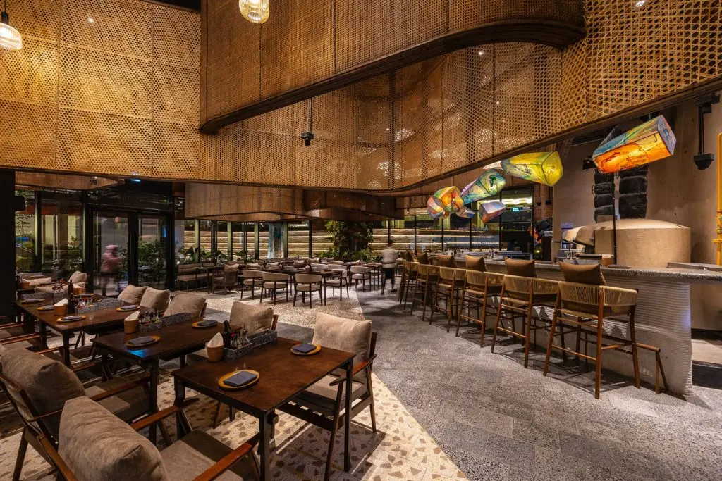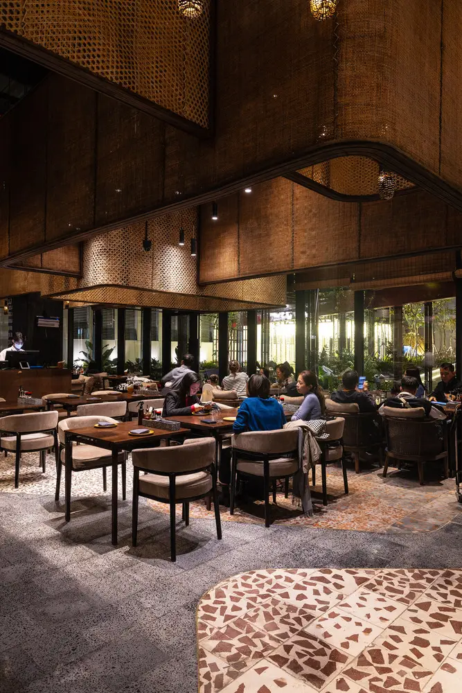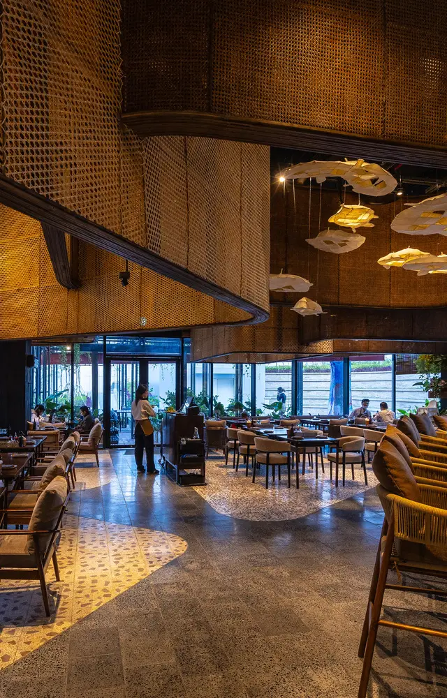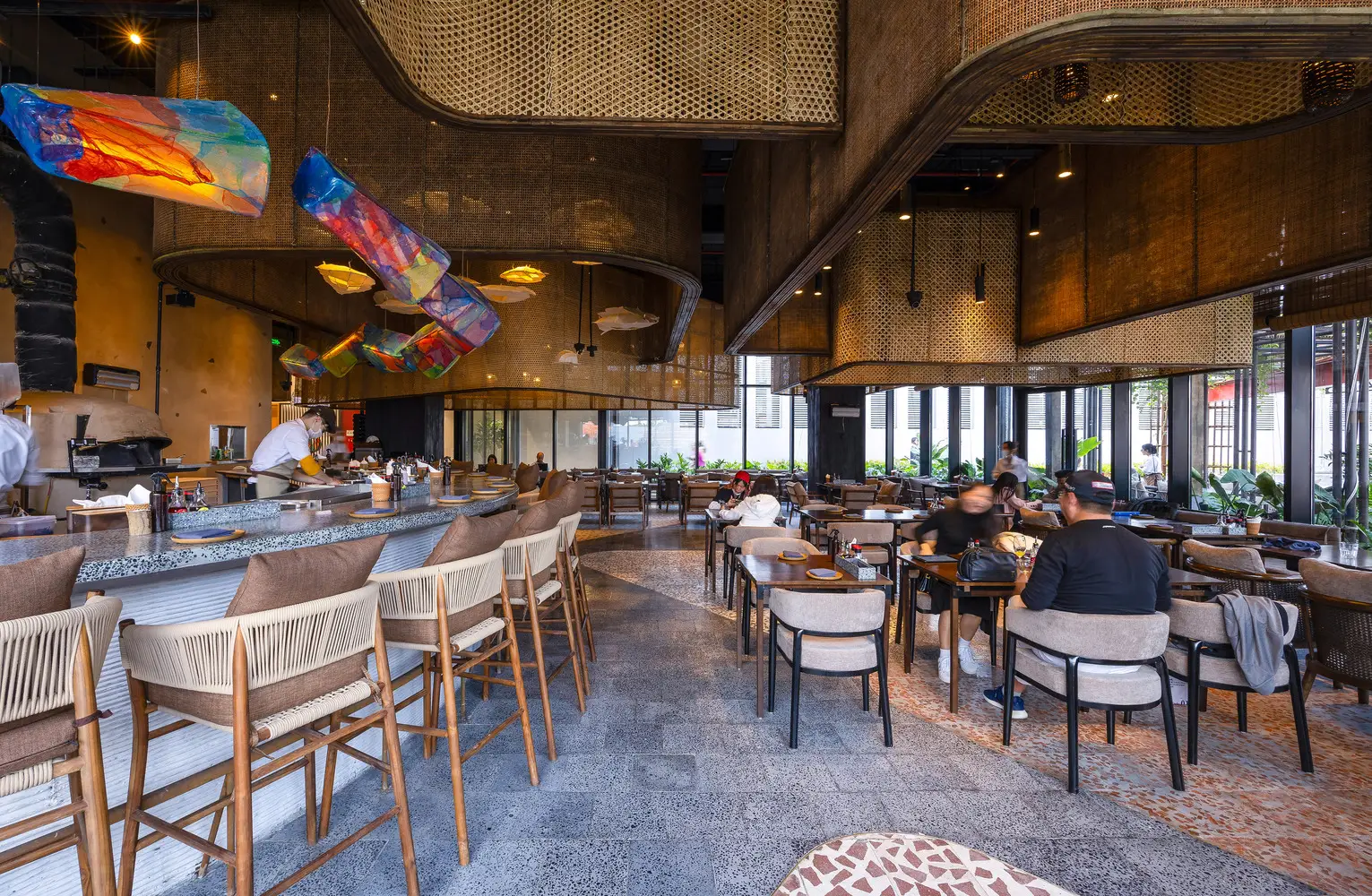 Sự đa dạng về không gian: Nội thất nhà hàng sở hữu nhiều cấu trúc không gian đa dạng, bao gồm độ cao trần nhà và điều kiện ánh sáng khác nhau. Điều này tạo nên một bầu không khí năng động và hấp dẫn cho thực khách, cho phép họ khám phá các lựa chọn chỗ ngồi và trải nghiệm khác nhau trong không gian.
